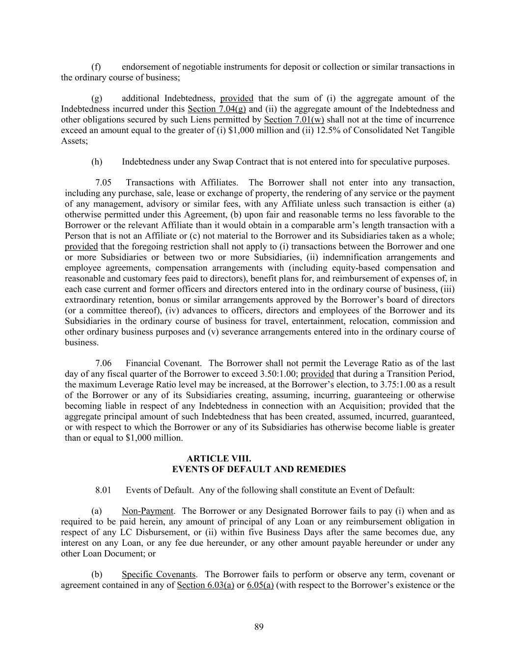 (f) endorsement of negotiable instruments for deposit or collection or similar transactions in the ordinary course of business; (g) additional Indebtedness, provided that the sum of (i) the aggregate amount of the Indebtedness incurred under this Section 7.04(g) and (ii) the aggregate amount of the Indebtedness and other obligations secured by such Liens permitted by Section 7.01(w) shall not at the time of incurrence exceed an amount equal to the greater of (i) $1,000 million and (ii) 12.5% of Consolidated Net Tangible Assets; (h) Indebtedness under any Swap Contract that is not entered into for speculative purposes. 7.05 Transactions with Affiliates. The Borrower shall not enter into any transaction, including any purchase, sale, lease or exchange of property, the rendering of any service or the payment of any management, advisory or similar fees, with any Affiliate unless such transaction is either (a) otherwise permitted under this Agreement, (b) upon fair and reasonable terms no less favorable to the Borrower or the relevant Affiliate than it would obtain in a comparable arm’s length transaction with a Person that is not an Affiliate or (c) not material to the Borrower and its Subsidiaries taken as a whole; provided that the foregoing restriction shall not apply to (i) transactions between the Borrower and one or more Subsidiaries or between two or more Subsidiaries, (ii) indemnification arrangements and employee agreements, compensation arrangements with (including equity-based compensation and reasonable and customary fees paid to directors), benefit plans for, and reimbursement of expenses of, in each case current and former officers and directors entered into in the ordinary course of business, (iii) extraordinary retention, bonus or similar arrangements approved by the Borrower’s board of directors (or a committee thereof), (iv) advances to officers, directors and employees of the Borrower and its Subsidiaries in the ordinary course of business for travel, entertainment, relocation, commission and other ordinary business purposes and (v) severance arrangements entered into in the ordinary course of business. 7.06 Financial Covenant. The Borrower shall not permit the Leverage Ratio as of the last day of any fiscal quarter of the Borrower to exceed 3.50:1.00; provided that during a Transition Period, the maximum Leverage Ratio level may be increased, at the Borrower’s election, to 3.75:1.00 as a result of the Borrower or any of its Subsidiaries creating, assuming, incurring, guaranteeing or otherwise becoming liable in respect of any Indebtedness in connection with an Acquisition; provided that the aggregate principal amount of such Indebtedness that has been created, assumed, incurred, guaranteed, or with respect to which the Borrower or any of its Subsidiaries has otherwise become liable is greater than or equal to $1,000 million. ARTICLE VIII. EVENTS OF DEFAULT AND REMEDIES 8.01 Events of Default. Any of the following shall constitute an Event of Default: (a) Non-Payment. The Borrower or any Designated Borrower fails to pay (i) when and as required to be paid herein, any amount of principal of any Loan or any reimbursement obligation in respect of any LC Disbursement, or (ii) within five Business Days after the same becomes due, any interest on any Loan, or any fee due hereunder, or any other amount payable hereunder or under any other Loan Document; or (b) Specific Covenants. The Borrower fails to perform or observe any term, covenant or agreement contained in any of Section 6.03(a) or 6.05(a) (with respect to the Borrower’s existence or the 89