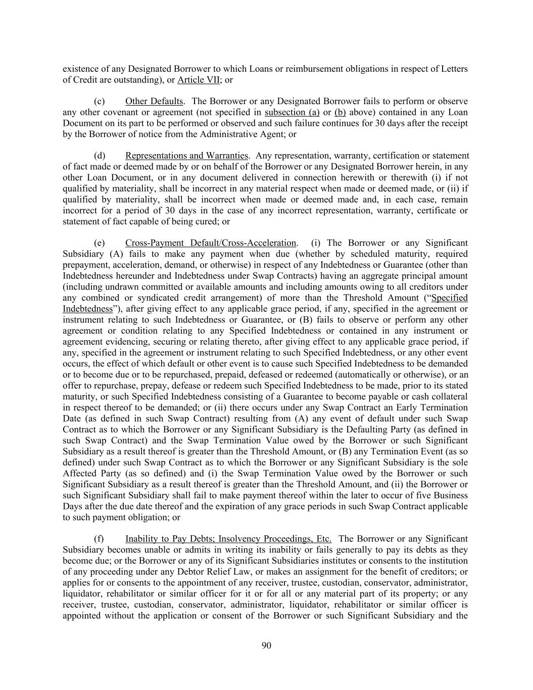 existence of any Designated Borrower to which Loans or reimbursement obligations in respect of Letters of Credit are outstanding), or Article VII; or (c) Other Defaults. The Borrower or any Designated Borrower fails to perform or observe any other covenant or agreement (not specified in subsection (a) or (b) above) contained in any Loan Document on its part to be performed or observed and such failure continues for 30 days after the receipt by the Borrower of notice from the Administrative Agent; or (d) Representations and Warranties. Any representation, warranty, certification or statement of fact made or deemed made by or on behalf of the Borrower or any Designated Borrower herein, in any other Loan Document, or in any document delivered in connection herewith or therewith (i) if not qualified by materiality, shall be incorrect in any material respect when made or deemed made, or (ii) if qualified by materiality, shall be incorrect when made or deemed made and, in each case, remain incorrect for a period of 30 days in the case of any incorrect representation, warranty, certificate or statement of fact capable of being cured; or (e) Cross-Payment Default/Cross-Acceleration. (i) The Borrower or any Significant Subsidiary (A) fails to make any payment when due (whether by scheduled maturity, required prepayment, acceleration, demand, or otherwise) in respect of any Indebtedness or Guarantee (other than Indebtedness hereunder and Indebtedness under Swap Contracts) having an aggregate principal amount (including undrawn committed or available amounts and including amounts owing to all creditors under any combined or syndicated credit arrangement) of more than the Threshold Amount (“Specified Indebtedness”), after giving effect to any applicable grace period, if any, specified in the agreement or instrument relating to such Indebtedness or Guarantee, or (B) fails to observe or perform any other agreement or condition relating to any Specified Indebtedness or contained in any instrument or agreement evidencing, securing or relating thereto, after giving effect to any applicable grace period, if any, specified in the agreement or instrument relating to such Specified Indebtedness, or any other event occurs, the effect of which default or other event is to cause such Specified Indebtedness to be demanded or to become due or to be repurchased, prepaid, defeased or redeemed (automatically or otherwise), or an offer to repurchase, prepay, defease or redeem such Specified Indebtedness to be made, prior to its stated maturity, or such Specified Indebtedness consisting of a Guarantee to become payable or cash collateral in respect thereof to be demanded; or (ii) there occurs under any Swap Contract an Early Termination Date (as defined in such Swap Contract) resulting from (A) any event of default under such Swap Contract as to which the Borrower or any Significant Subsidiary is the Defaulting Party (as defined in such Swap Contract) and the Swap Termination Value owed by the Borrower or such Significant Subsidiary as a result thereof is greater than the Threshold Amount, or (B) any Termination Event (as so defined) under such Swap Contract as to which the Borrower or any Significant Subsidiary is the sole Affected Party (as so defined) and (i) the Swap Termination Value owed by the Borrower or such Significant Subsidiary as a result thereof is greater than the Threshold Amount, and (ii) the Borrower or such Significant Subsidiary shall fail to make payment thereof within the later to occur of five Business Days after the due date thereof and the expiration of any grace periods in such Swap Contract applicable to such payment obligation; or (f) Inability to Pay Debts; Insolvency Proceedings, Etc. The Borrower or any Significant Subsidiary becomes unable or admits in writing its inability or fails generally to pay its debts as they become due; or the Borrower or any of its Significant Subsidiaries institutes or consents to the institution of any proceeding under any Debtor Relief Law, or makes an assignment for the benefit of creditors; or applies for or consents to the appointment of any receiver, trustee, custodian, conservator, administrator, liquidator, rehabilitator or similar officer for it or for all or any material part of its property; or any receiver, trustee, custodian, conservator, administrator, liquidator, rehabilitator or similar officer is appointed without the application or consent of the Borrower or such Significant Subsidiary and the 90