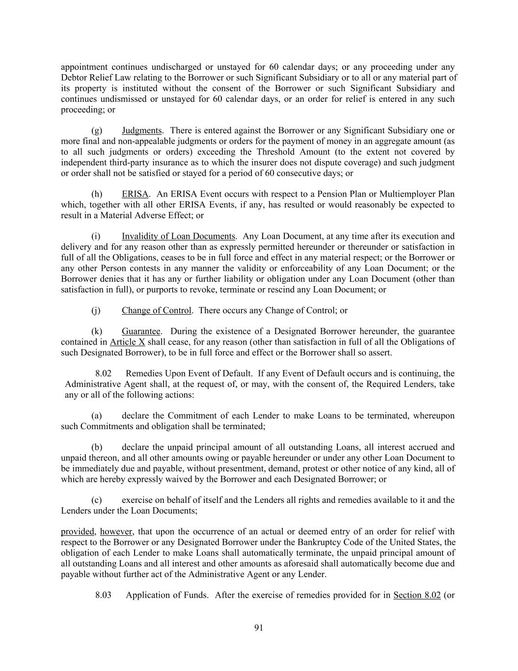 appointment continues undischarged or unstayed for 60 calendar days; or any proceeding under any Debtor Relief Law relating to the Borrower or such Significant Subsidiary or to all or any material part of its property is instituted without the consent of the Borrower or such Significant Subsidiary and continues undismissed or unstayed for 60 calendar days, or an order for relief is entered in any such proceeding; or (g) Judgments. There is entered against the Borrower or any Significant Subsidiary one or more final and non-appealable judgments or orders for the payment of money in an aggregate amount (as to all such judgments or orders) exceeding the Threshold Amount (to the extent not covered by independent third-party insurance as to which the insurer does not dispute coverage) and such judgment or order shall not be satisfied or stayed for a period of 60 consecutive days; or (h) ERISA. An ERISA Event occurs with respect to a Pension Plan or Multiemployer Plan which, together with all other ERISA Events, if any, has resulted or would reasonably be expected to result in a Material Adverse Effect; or (i) Invalidity of Loan Documents. Any Loan Document, at any time after its execution and delivery and for any reason other than as expressly permitted hereunder or thereunder or satisfaction in full of all the Obligations, ceases to be in full force and effect in any material respect; or the Borrower or any other Person contests in any manner the validity or enforceability of any Loan Document; or the Borrower denies that it has any or further liability or obligation under any Loan Document (other than satisfaction in full), or purports to revoke, terminate or rescind any Loan Document; or (j) Change of Control. There occurs any Change of Control; or (k) Guarantee. During the existence of a Designated Borrower hereunder, the guarantee contained in Article X shall cease, for any reason (other than satisfaction in full of all the Obligations of such Designated Borrower), to be in full force and effect or the Borrower shall so assert. 8.02 Remedies Upon Event of Default. If any Event of Default occurs and is continuing, the Administrative Agent shall, at the request of, or may, with the consent of, the Required Lenders, take any or all of the following actions: (a) declare the Commitment of each Lender to make Loans to be terminated, whereupon such Commitments and obligation shall be terminated; (b) declare the unpaid principal amount of all outstanding Loans, all interest accrued and unpaid thereon, and all other amounts owing or payable hereunder or under any other Loan Document to be immediately due and payable, without presentment, demand, protest or other notice of any kind, all of which are hereby expressly waived by the Borrower and each Designated Borrower; or (c) exercise on behalf of itself and the Lenders all rights and remedies available to it and the Lenders under the Loan Documents; provided, however, that upon the occurrence of an actual or deemed entry of an order for relief with respect to the Borrower or any Designated Borrower under the Bankruptcy Code of the United States, the obligation of each Lender to make Loans shall automatically terminate, the unpaid principal amount of all outstanding Loans and all interest and other amounts as aforesaid shall automatically become due and payable without further act of the Administrative Agent or any Lender. 8.03 Application of Funds. After the exercise of remedies provided for in Section 8.02 (or 91