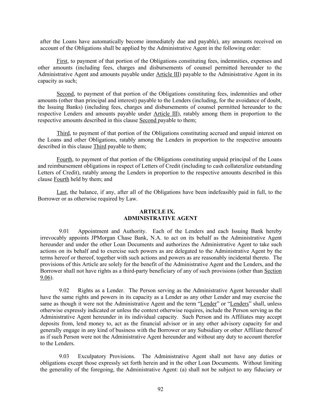 after the Loans have automatically become immediately due and payable), any amounts received on account of the Obligations shall be applied by the Administrative Agent in the following order: First, to payment of that portion of the Obligations constituting fees, indemnities, expenses and other amounts (including fees, charges and disbursements of counsel permitted hereunder to the Administrative Agent and amounts payable under Article III) payable to the Administrative Agent in its capacity as such; Second, to payment of that portion of the Obligations constituting fees, indemnities and other amounts (other than principal and interest) payable to the Lenders (including, for the avoidance of doubt, the Issuing Banks) (including fees, charges and disbursements of counsel permitted hereunder to the respective Lenders and amounts payable under Article III), ratably among them in proportion to the respective amounts described in this clause Second payable to them; Third, to payment of that portion of the Obligations constituting accrued and unpaid interest on the Loans and other Obligations, ratably among the Lenders in proportion to the respective amounts described in this clause Third payable to them; Fourth, to payment of that portion of the Obligations constituting unpaid principal of the Loans and reimbursement obligations in respect of Letters of Credit (including to cash collateralize outstanding Letters of Credit), ratably among the Lenders in proportion to the respective amounts described in this clause Fourth held by them; and Last, the balance, if any, after all of the Obligations have been indefeasibly paid in full, to the Borrower or as otherwise required by Law. ARTICLE IX. ADMINISTRATIVE AGENT 9.01 Appointment and Authority. Each of the Lenders and each Issuing Bank hereby irrevocably appoints JPMorgan Chase Bank, N.A. to act on its behalf as the Administrative Agent hereunder and under the other Loan Documents and authorizes the Administrative Agent to take such actions on its behalf and to exercise such powers as are delegated to the Administrative Agent by the terms hereof or thereof, together with such actions and powers as are reasonably incidental thereto. The provisions of this Article are solely for the benefit of the Administrative Agent and the Lenders, and the Borrower shall not have rights as a third-party beneficiary of any of such provisions (other than Section 9.06). 9.02 Rights as a Lender. The Person serving as the Administrative Agent hereunder shall have the same rights and powers in its capacity as a Lender as any other Lender and may exercise the same as though it were not the Administrative Agent and the term “Lender” or “Lenders” shall, unless otherwise expressly indicated or unless the context otherwise requires, include the Person serving as the Administrative Agent hereunder in its individual capacity. Such Person and its Affiliates may accept deposits from, lend money to, act as the financial advisor or in any other advisory capacity for and generally engage in any kind of business with the Borrower or any Subsidiary or other Affiliate thereof as if such Person were not the Administrative Agent hereunder and without any duty to account therefor to the Lenders. 9.03 Exculpatory Provisions. The Administrative Agent shall not have any duties or obligations except those expressly set forth herein and in the other Loan Documents. Without limiting the generality of the foregoing, the Administrative Agent: (a) shall not be subject to any fiduciary or 92