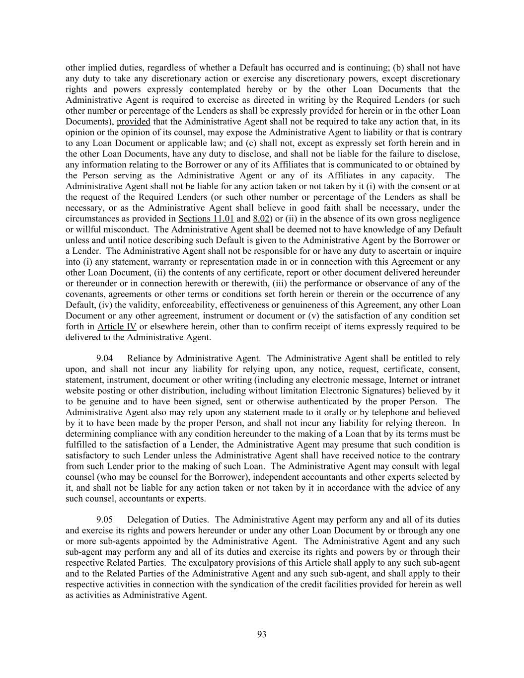 other implied duties, regardless of whether a Default has occurred and is continuing; (b) shall not have any duty to take any discretionary action or exercise any discretionary powers, except discretionary rights and powers expressly contemplated hereby or by the other Loan Documents that the Administrative Agent is required to exercise as directed in writing by the Required Lenders (or such other number or percentage of the Lenders as shall be expressly provided for herein or in the other Loan Documents), provided that the Administrative Agent shall not be required to take any action that, in its opinion or the opinion of its counsel, may expose the Administrative Agent to liability or that is contrary to any Loan Document or applicable law; and (c) shall not, except as expressly set forth herein and in the other Loan Documents, have any duty to disclose, and shall not be liable for the failure to disclose, any information relating to the Borrower or any of its Affiliates that is communicated to or obtained by the Person serving as the Administrative Agent or any of its Affiliates in any capacity. The Administrative Agent shall not be liable for any action taken or not taken by it (i) with the consent or at the request of the Required Lenders (or such other number or percentage of the Lenders as shall be necessary, or as the Administrative Agent shall believe in good faith shall be necessary, under the circumstances as provided in Sections 11.01 and 8.02) or (ii) in the absence of its own gross negligence or willful misconduct. The Administrative Agent shall be deemed not to have knowledge of any Default unless and until notice describing such Default is given to the Administrative Agent by the Borrower or a Lender. The Administrative Agent shall not be responsible for or have any duty to ascertain or inquire into (i) any statement, warranty or representation made in or in connection with this Agreement or any other Loan Document, (ii) the contents of any certificate, report or other document delivered hereunder or thereunder or in connection herewith or therewith, (iii) the performance or observance of any of the covenants, agreements or other terms or conditions set forth herein or therein or the occurrence of any Default, (iv) the validity, enforceability, effectiveness or genuineness of this Agreement, any other Loan Document or any other agreement, instrument or document or (v) the satisfaction of any condition set forth in Article IV or elsewhere herein, other than to confirm receipt of items expressly required to be delivered to the Administrative Agent. 9.04 Reliance by Administrative Agent. The Administrative Agent shall be entitled to rely upon, and shall not incur any liability for relying upon, any notice, request, certificate, consent, statement, instrument, document or other writing (including any electronic message, Internet or intranet website posting or other distribution, including without limitation Electronic Signatures) believed by it to be genuine and to have been signed, sent or otherwise authenticated by the proper Person. The Administrative Agent also may rely upon any statement made to it orally or by telephone and believed by it to have been made by the proper Person, and shall not incur any liability for relying thereon. In determining compliance with any condition hereunder to the making of a Loan that by its terms must be fulfilled to the satisfaction of a Lender, the Administrative Agent may presume that such condition is satisfactory to such Lender unless the Administrative Agent shall have received notice to the contrary from such Lender prior to the making of such Loan. The Administrative Agent may consult with legal counsel (who may be counsel for the Borrower), independent accountants and other experts selected by it, and shall not be liable for any action taken or not taken by it in accordance with the advice of any such counsel, accountants or experts. 9.05 Delegation of Duties. The Administrative Agent may perform any and all of its duties and exercise its rights and powers hereunder or under any other Loan Document by or through any one or more sub-agents appointed by the Administrative Agent. The Administrative Agent and any such sub-agent may perform any and all of its duties and exercise its rights and powers by or through their respective Related Parties. The exculpatory provisions of this Article shall apply to any such sub-agent and to the Related Parties of the Administrative Agent and any such sub-agent, and shall apply to their respective activities in connection with the syndication of the credit facilities provided for herein as well as activities as Administrative Agent. 93