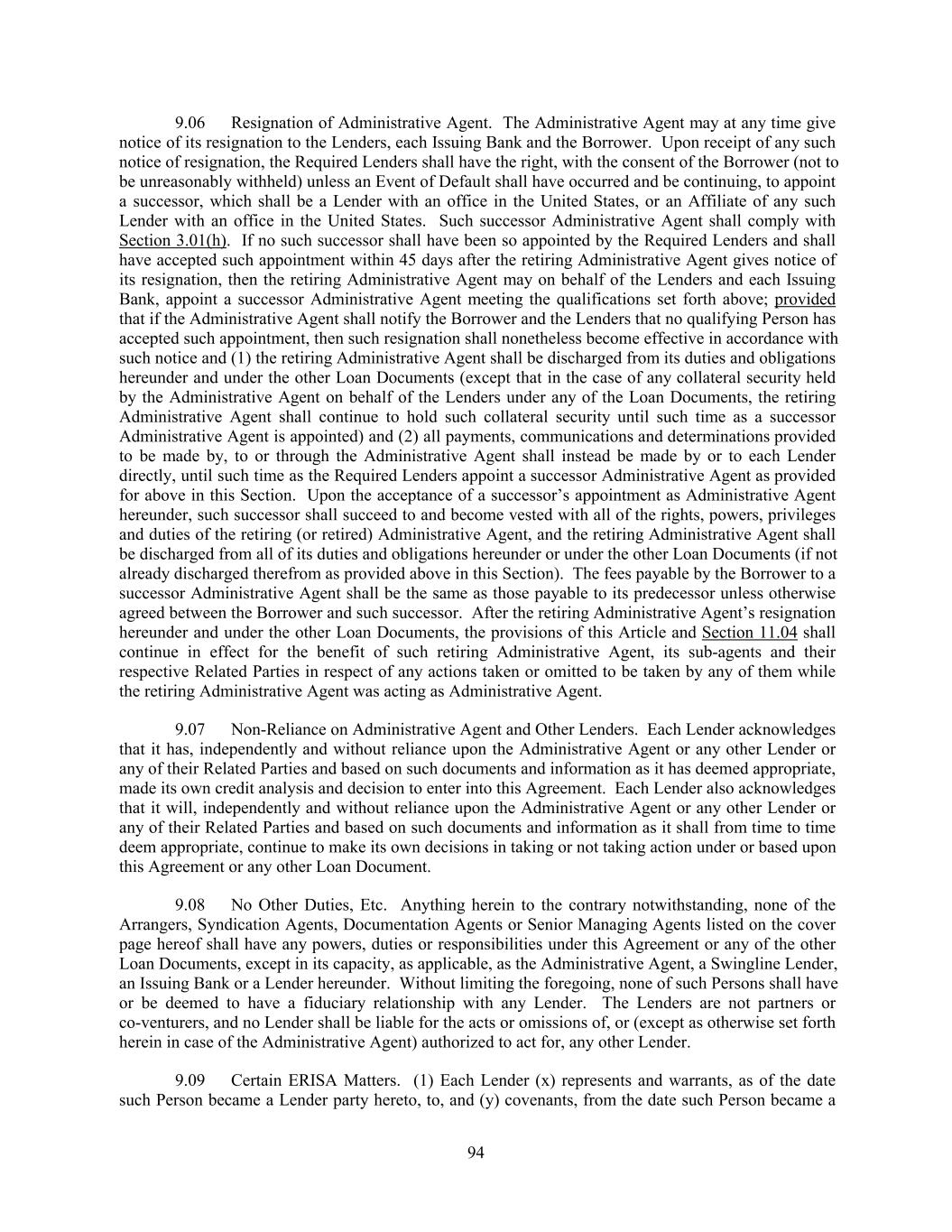 9.06 Resignation of Administrative Agent. The Administrative Agent may at any time give notice of its resignation to the Lenders, each Issuing Bank and the Borrower. Upon receipt of any such notice of resignation, the Required Lenders shall have the right, with the consent of the Borrower (not to be unreasonably withheld) unless an Event of Default shall have occurred and be continuing, to appoint a successor, which shall be a Lender with an office in the United States, or an Affiliate of any such Lender with an office in the United States. Such successor Administrative Agent shall comply with Section 3.01(h). If no such successor shall have been so appointed by the Required Lenders and shall have accepted such appointment within 45 days after the retiring Administrative Agent gives notice of its resignation, then the retiring Administrative Agent may on behalf of the Lenders and each Issuing Bank, appoint a successor Administrative Agent meeting the qualifications set forth above; provided that if the Administrative Agent shall notify the Borrower and the Lenders that no qualifying Person has accepted such appointment, then such resignation shall nonetheless become effective in accordance with such notice and (1) the retiring Administrative Agent shall be discharged from its duties and obligations hereunder and under the other Loan Documents (except that in the case of any collateral security held by the Administrative Agent on behalf of the Lenders under any of the Loan Documents, the retiring Administrative Agent shall continue to hold such collateral security until such time as a successor Administrative Agent is appointed) and (2) all payments, communications and determinations provided to be made by, to or through the Administrative Agent shall instead be made by or to each Lender directly, until such time as the Required Lenders appoint a successor Administrative Agent as provided for above in this Section. Upon the acceptance of a successor’s appointment as Administrative Agent hereunder, such successor shall succeed to and become vested with all of the rights, powers, privileges and duties of the retiring (or retired) Administrative Agent, and the retiring Administrative Agent shall be discharged from all of its duties and obligations hereunder or under the other Loan Documents (if not already discharged therefrom as provided above in this Section). The fees payable by the Borrower to a successor Administrative Agent shall be the same as those payable to its predecessor unless otherwise agreed between the Borrower and such successor. After the retiring Administrative Agent’s resignation hereunder and under the other Loan Documents, the provisions of this Article and Section 11.04 shall continue in effect for the benefit of such retiring Administrative Agent, its sub-agents and their respective Related Parties in respect of any actions taken or omitted to be taken by any of them while the retiring Administrative Agent was acting as Administrative Agent. 9.07 Non-Reliance on Administrative Agent and Other Lenders. Each Lender acknowledges that it has, independently and without reliance upon the Administrative Agent or any other Lender or any of their Related Parties and based on such documents and information as it has deemed appropriate, made its own credit analysis and decision to enter into this Agreement. Each Lender also acknowledges that it will, independently and without reliance upon the Administrative Agent or any other Lender or any of their Related Parties and based on such documents and information as it shall from time to time deem appropriate, continue to make its own decisions in taking or not taking action under or based upon this Agreement or any other Loan Document. 9.08 No Other Duties, Etc. Anything herein to the contrary notwithstanding, none of the Arrangers, Syndication Agents, Documentation Agents or Senior Managing Agents listed on the cover page hereof shall have any powers, duties or responsibilities under this Agreement or any of the other Loan Documents, except in its capacity, as applicable, as the Administrative Agent, a Swingline Lender, an Issuing Bank or a Lender hereunder. Without limiting the foregoing, none of such Persons shall have or be deemed to have a fiduciary relationship with any Lender. The Lenders are not partners or co-venturers, and no Lender shall be liable for the acts or omissions of, or (except as otherwise set forth herein in case of the Administrative Agent) authorized to act for, any other Lender. 9.09 Certain ERISA Matters. (1) Each Lender (x) represents and warrants, as of the date such Person became a Lender party hereto, to, and (y) covenants, from the date such Person became a 94