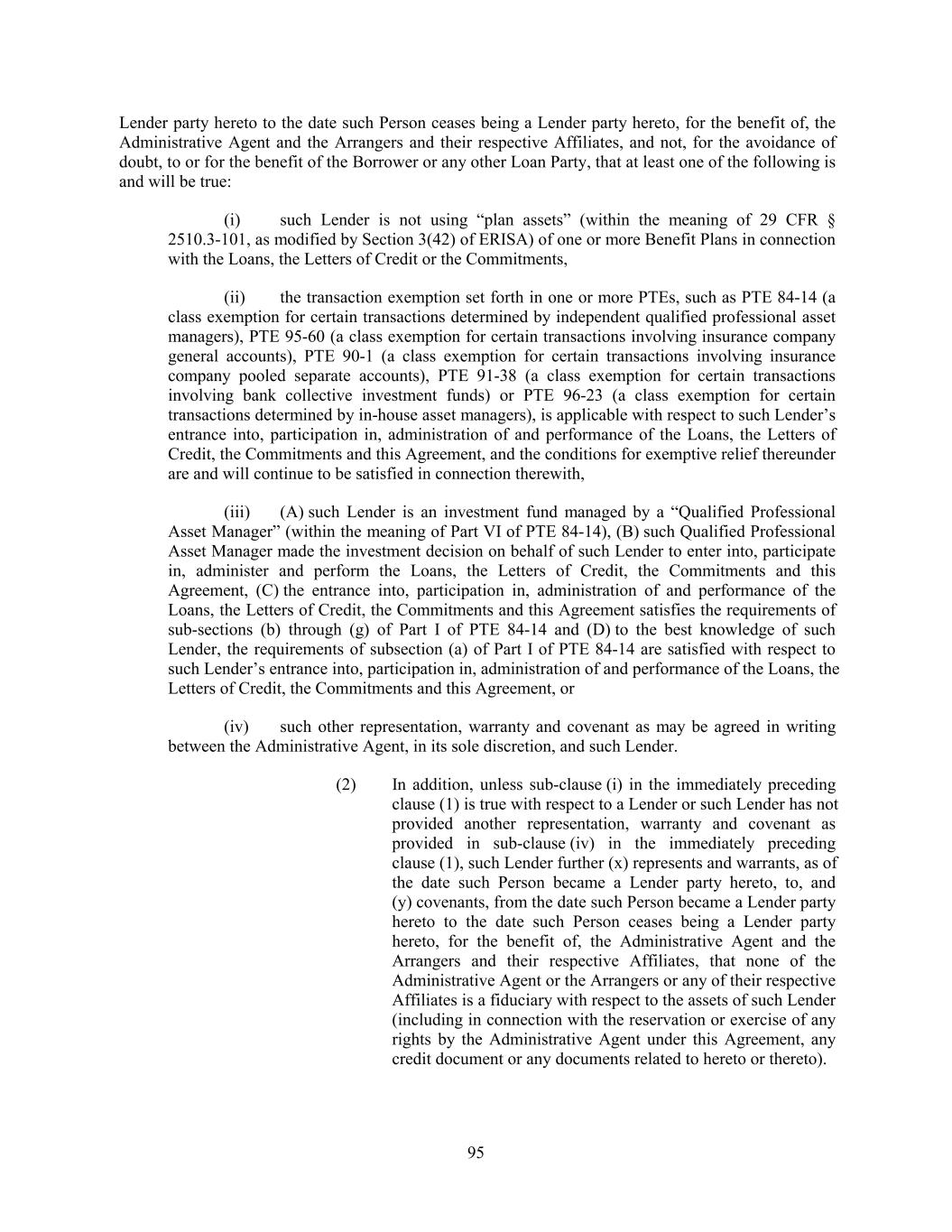 Lender party hereto to the date such Person ceases being a Lender party hereto, for the benefit of, the Administrative Agent and the Arrangers and their respective Affiliates, and not, for the avoidance of doubt, to or for the benefit of the Borrower or any other Loan Party, that at least one of the following is and will be true: (i) such Lender is not using “plan assets” (within the meaning of 29 CFR § 2510.3-101, as modified by Section 3(42) of ERISA) of one or more Benefit Plans in connection with the Loans, the Letters of Credit or the Commitments, (ii) the transaction exemption set forth in one or more PTEs, such as PTE 84-14 (a class exemption for certain transactions determined by independent qualified professional asset managers), PTE 95-60 (a class exemption for certain transactions involving insurance company general accounts), PTE 90-1 (a class exemption for certain transactions involving insurance company pooled separate accounts), PTE 91-38 (a class exemption for certain transactions involving bank collective investment funds) or PTE 96-23 (a class exemption for certain transactions determined by in-house asset managers), is applicable with respect to such Lender’s entrance into, participation in, administration of and performance of the Loans, the Letters of Credit, the Commitments and this Agreement, and the conditions for exemptive relief thereunder are and will continue to be satisfied in connection therewith, (iii) (A) such Lender is an investment fund managed by a “Qualified Professional Asset Manager” (within the meaning of Part VI of PTE 84-14), (B) such Qualified Professional Asset Manager made the investment decision on behalf of such Lender to enter into, participate in, administer and perform the Loans, the Letters of Credit, the Commitments and this Agreement, (C) the entrance into, participation in, administration of and performance of the Loans, the Letters of Credit, the Commitments and this Agreement satisfies the requirements of sub-sections (b) through (g) of Part I of PTE 84-14 and (D) to the best knowledge of such Lender, the requirements of subsection (a) of Part I of PTE 84-14 are satisfied with respect to such Lender’s entrance into, participation in, administration of and performance of the Loans, the Letters of Credit, the Commitments and this Agreement, or (iv) such other representation, warranty and covenant as may be agreed in writing between the Administrative Agent, in its sole discretion, and such Lender. (2) In addition, unless sub-clause (i) in the immediately preceding clause (1) is true with respect to a Lender or such Lender has not provided another representation, warranty and covenant as provided in sub-clause (iv) in the immediately preceding clause (1), such Lender further (x) represents and warrants, as of the date such Person became a Lender party hereto, to, and (y) covenants, from the date such Person became a Lender party hereto to the date such Person ceases being a Lender party hereto, for the benefit of, the Administrative Agent and the Arrangers and their respective Affiliates, that none of the Administrative Agent or the Arrangers or any of their respective Affiliates is a fiduciary with respect to the assets of such Lender (including in connection with the reservation or exercise of any rights by the Administrative Agent under this Agreement, any credit document or any documents related to hereto or thereto). 95