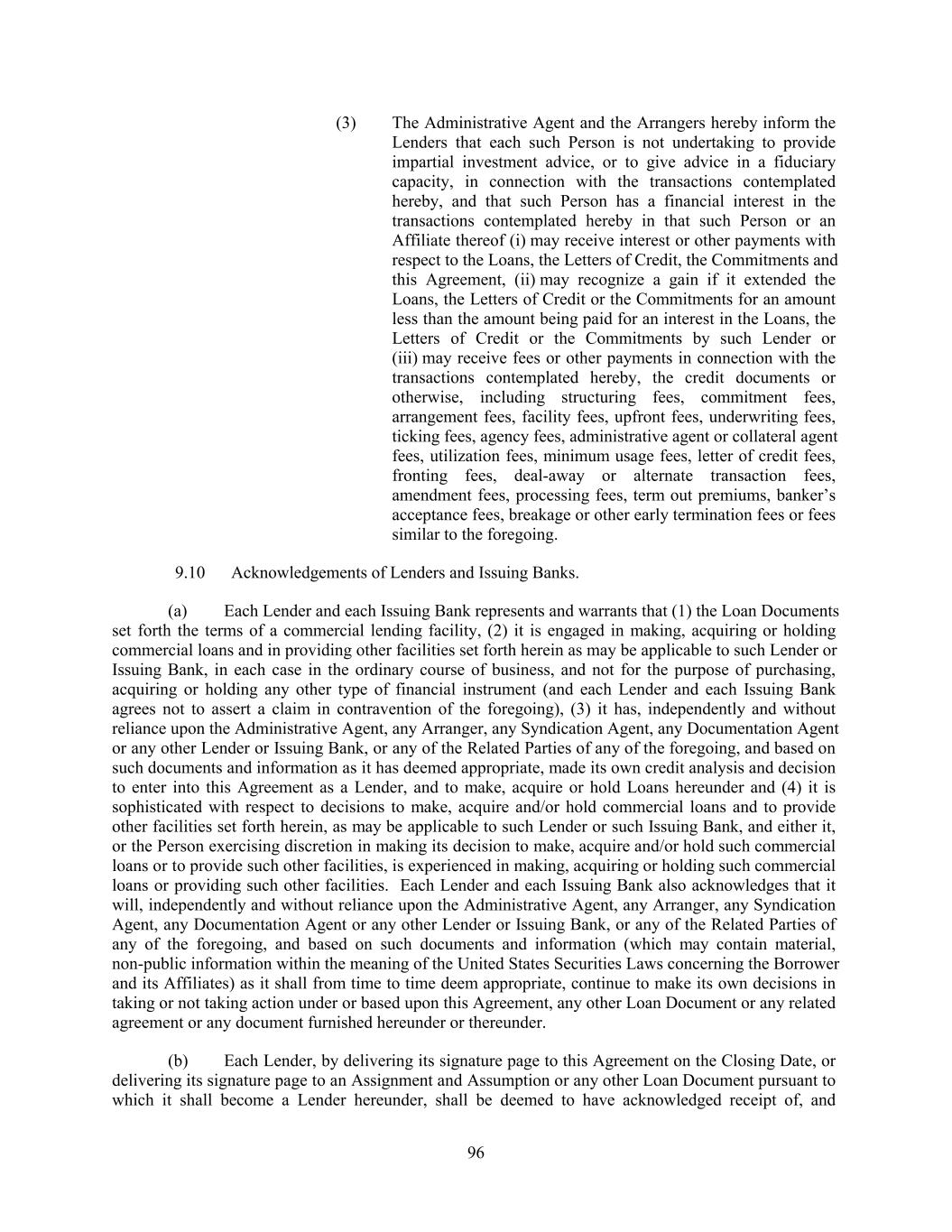 (3) The Administrative Agent and the Arrangers hereby inform the Lenders that each such Person is not undertaking to provide impartial investment advice, or to give advice in a fiduciary capacity, in connection with the transactions contemplated hereby, and that such Person has a financial interest in the transactions contemplated hereby in that such Person or an Affiliate thereof (i) may receive interest or other payments with respect to the Loans, the Letters of Credit, the Commitments and this Agreement, (ii) may recognize a gain if it extended the Loans, the Letters of Credit or the Commitments for an amount less than the amount being paid for an interest in the Loans, the Letters of Credit or the Commitments by such Lender or (iii) may receive fees or other payments in connection with the transactions contemplated hereby, the credit documents or otherwise, including structuring fees, commitment fees, arrangement fees, facility fees, upfront fees, underwriting fees, ticking fees, agency fees, administrative agent or collateral agent fees, utilization fees, minimum usage fees, letter of credit fees, fronting fees, deal-away or alternate transaction fees, amendment fees, processing fees, term out premiums, banker’s acceptance fees, breakage or other early termination fees or fees similar to the foregoing. 9.10 Acknowledgements of Lenders and Issuing Banks. (a) Each Lender and each Issuing Bank represents and warrants that (1) the Loan Documents set forth the terms of a commercial lending facility, (2) it is engaged in making, acquiring or holding commercial loans and in providing other facilities set forth herein as may be applicable to such Lender or Issuing Bank, in each case in the ordinary course of business, and not for the purpose of purchasing, acquiring or holding any other type of financial instrument (and each Lender and each Issuing Bank agrees not to assert a claim in contravention of the foregoing), (3) it has, independently and without reliance upon the Administrative Agent, any Arranger, any Syndication Agent, any Documentation Agent or any other Lender or Issuing Bank, or any of the Related Parties of any of the foregoing, and based on such documents and information as it has deemed appropriate, made its own credit analysis and decision to enter into this Agreement as a Lender, and to make, acquire or hold Loans hereunder and (4) it is sophisticated with respect to decisions to make, acquire and/or hold commercial loans and to provide other facilities set forth herein, as may be applicable to such Lender or such Issuing Bank, and either it, or the Person exercising discretion in making its decision to make, acquire and/or hold such commercial loans or to provide such other facilities, is experienced in making, acquiring or holding such commercial loans or providing such other facilities. Each Lender and each Issuing Bank also acknowledges that it will, independently and without reliance upon the Administrative Agent, any Arranger, any Syndication Agent, any Documentation Agent or any other Lender or Issuing Bank, or any of the Related Parties of any of the foregoing, and based on such documents and information (which may contain material, non-public information within the meaning of the United States Securities Laws concerning the Borrower and its Affiliates) as it shall from time to time deem appropriate, continue to make its own decisions in taking or not taking action under or based upon this Agreement, any other Loan Document or any related agreement or any document furnished hereunder or thereunder. (b) Each Lender, by delivering its signature page to this Agreement on the Closing Date, or delivering its signature page to an Assignment and Assumption or any other Loan Document pursuant to which it shall become a Lender hereunder, shall be deemed to have acknowledged receipt of, and 96