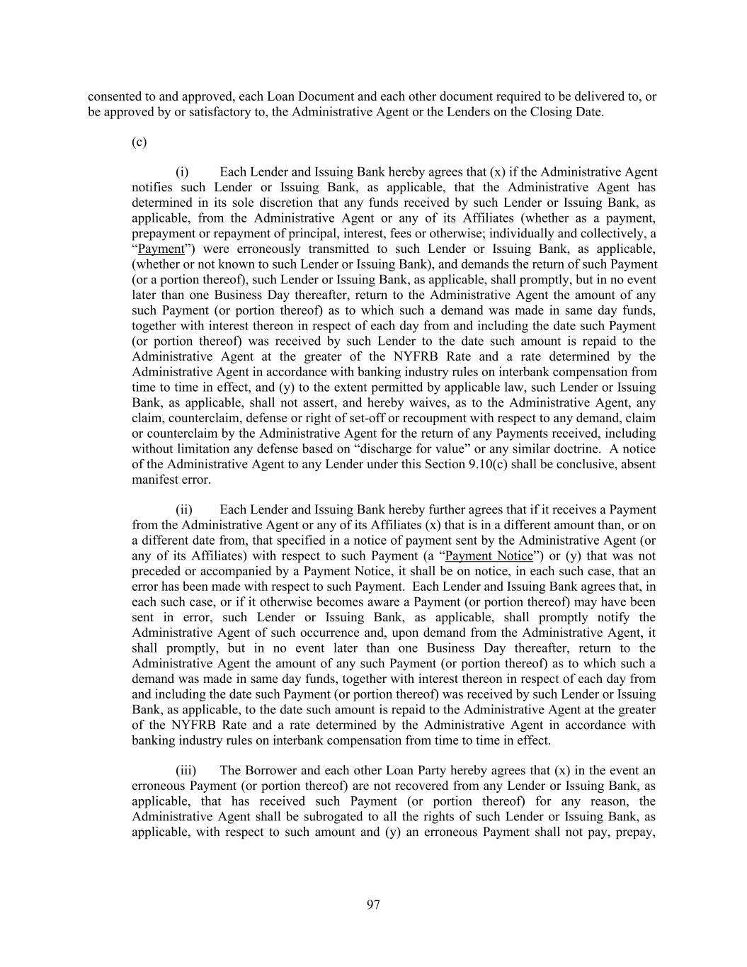 consented to and approved, each Loan Document and each other document required to be delivered to, or be approved by or satisfactory to, the Administrative Agent or the Lenders on the Closing Date. (c) (i) Each Lender and Issuing Bank hereby agrees that (x) if the Administrative Agent notifies such Lender or Issuing Bank, as applicable, that the Administrative Agent has determined in its sole discretion that any funds received by such Lender or Issuing Bank, as applicable, from the Administrative Agent or any of its Affiliates (whether as a payment, prepayment or repayment of principal, interest, fees or otherwise; individually and collectively, a “Payment”) were erroneously transmitted to such Lender or Issuing Bank, as applicable, (whether or not known to such Lender or Issuing Bank), and demands the return of such Payment (or a portion thereof), such Lender or Issuing Bank, as applicable, shall promptly, but in no event later than one Business Day thereafter, return to the Administrative Agent the amount of any such Payment (or portion thereof) as to which such a demand was made in same day funds, together with interest thereon in respect of each day from and including the date such Payment (or portion thereof) was received by such Lender to the date such amount is repaid to the Administrative Agent at the greater of the NYFRB Rate and a rate determined by the Administrative Agent in accordance with banking industry rules on interbank compensation from time to time in effect, and (y) to the extent permitted by applicable law, such Lender or Issuing Bank, as applicable, shall not assert, and hereby waives, as to the Administrative Agent, any claim, counterclaim, defense or right of set-off or recoupment with respect to any demand, claim or counterclaim by the Administrative Agent for the return of any Payments received, including without limitation any defense based on “discharge for value” or any similar doctrine. A notice of the Administrative Agent to any Lender under this Section 9.10(c) shall be conclusive, absent manifest error. (ii) Each Lender and Issuing Bank hereby further agrees that if it receives a Payment from the Administrative Agent or any of its Affiliates (x) that is in a different amount than, or on a different date from, that specified in a notice of payment sent by the Administrative Agent (or any of its Affiliates) with respect to such Payment (a “Payment Notice”) or (y) that was not preceded or accompanied by a Payment Notice, it shall be on notice, in each such case, that an error has been made with respect to such Payment. Each Lender and Issuing Bank agrees that, in each such case, or if it otherwise becomes aware a Payment (or portion thereof) may have been sent in error, such Lender or Issuing Bank, as applicable, shall promptly notify the Administrative Agent of such occurrence and, upon demand from the Administrative Agent, it shall promptly, but in no event later than one Business Day thereafter, return to the Administrative Agent the amount of any such Payment (or portion thereof) as to which such a demand was made in same day funds, together with interest thereon in respect of each day from and including the date such Payment (or portion thereof) was received by such Lender or Issuing Bank, as applicable, to the date such amount is repaid to the Administrative Agent at the greater of the NYFRB Rate and a rate determined by the Administrative Agent in accordance with banking industry rules on interbank compensation from time to time in effect. (iii) The Borrower and each other Loan Party hereby agrees that (x) in the event an erroneous Payment (or portion thereof) are not recovered from any Lender or Issuing Bank, as applicable, that has received such Payment (or portion thereof) for any reason, the Administrative Agent shall be subrogated to all the rights of such Lender or Issuing Bank, as applicable, with respect to such amount and (y) an erroneous Payment shall not pay, prepay, 97