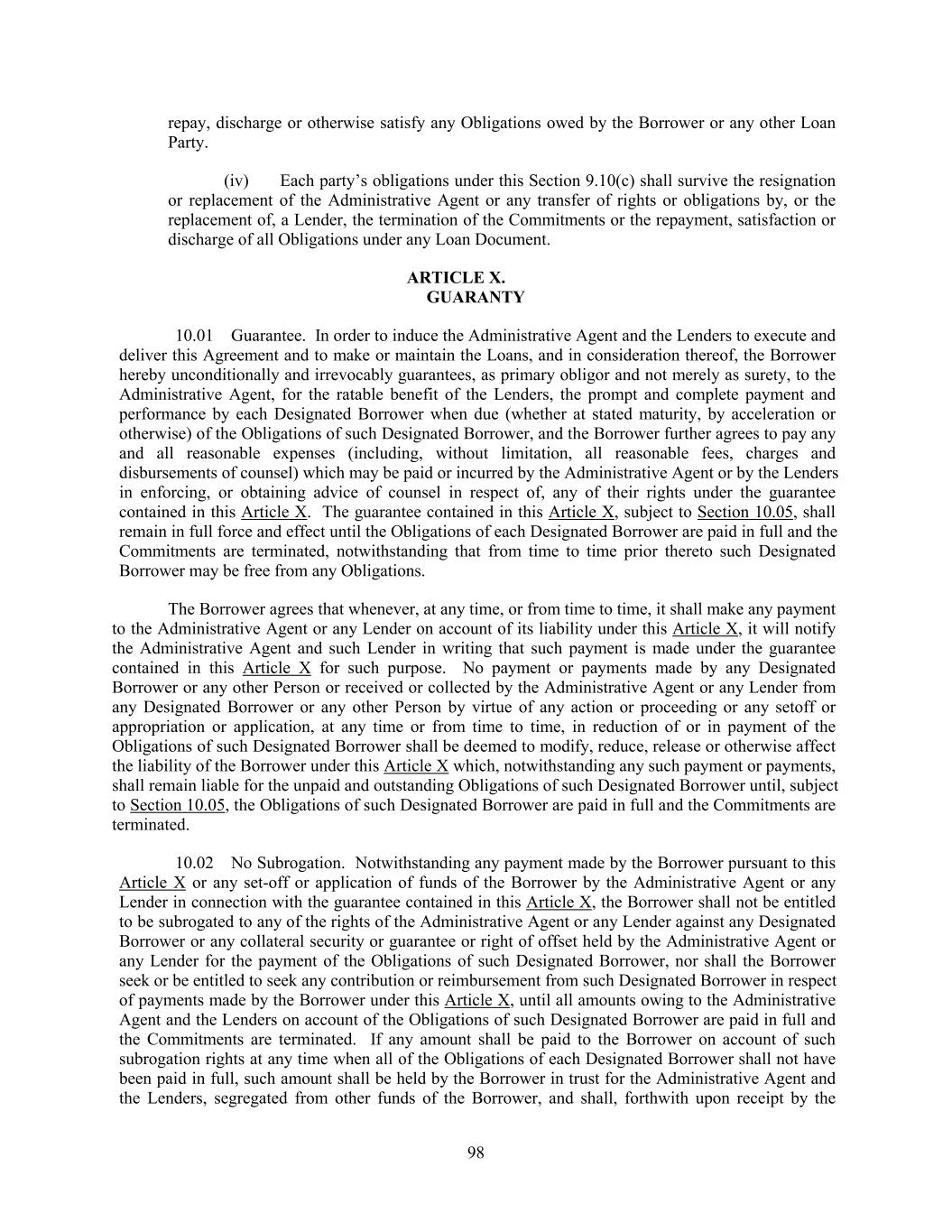 repay, discharge or otherwise satisfy any Obligations owed by the Borrower or any other Loan Party. (iv) Each party’s obligations under this Section 9.10(c) shall survive the resignation or replacement of the Administrative Agent or any transfer of rights or obligations by, or the replacement of, a Lender, the termination of the Commitments or the repayment, satisfaction or discharge of all Obligations under any Loan Document. ARTICLE X. GUARANTY 10.01 Guarantee. In order to induce the Administrative Agent and the Lenders to execute and deliver this Agreement and to make or maintain the Loans, and in consideration thereof, the Borrower hereby unconditionally and irrevocably guarantees, as primary obligor and not merely as surety, to the Administrative Agent, for the ratable benefit of the Lenders, the prompt and complete payment and performance by each Designated Borrower when due (whether at stated maturity, by acceleration or otherwise) of the Obligations of such Designated Borrower, and the Borrower further agrees to pay any and all reasonable expenses (including, without limitation, all reasonable fees, charges and disbursements of counsel) which may be paid or incurred by the Administrative Agent or by the Lenders in enforcing, or obtaining advice of counsel in respect of, any of their rights under the guarantee contained in this Article X. The guarantee contained in this Article X, subject to Section 10.05, shall remain in full force and effect until the Obligations of each Designated Borrower are paid in full and the Commitments are terminated, notwithstanding that from time to time prior thereto such Designated Borrower may be free from any Obligations. The Borrower agrees that whenever, at any time, or from time to time, it shall make any payment to the Administrative Agent or any Lender on account of its liability under this Article X, it will notify the Administrative Agent and such Lender in writing that such payment is made under the guarantee contained in this Article X for such purpose. No payment or payments made by any Designated Borrower or any other Person or received or collected by the Administrative Agent or any Lender from any Designated Borrower or any other Person by virtue of any action or proceeding or any setoff or appropriation or application, at any time or from time to time, in reduction of or in payment of the Obligations of such Designated Borrower shall be deemed to modify, reduce, release or otherwise affect the liability of the Borrower under this Article X which, notwithstanding any such payment or payments, shall remain liable for the unpaid and outstanding Obligations of such Designated Borrower until, subject to Section 10.05, the Obligations of such Designated Borrower are paid in full and the Commitments are terminated. 10.02 No Subrogation. Notwithstanding any payment made by the Borrower pursuant to this Article X or any set-off or application of funds of the Borrower by the Administrative Agent or any Lender in connection with the guarantee contained in this Article X, the Borrower shall not be entitled to be subrogated to any of the rights of the Administrative Agent or any Lender against any Designated Borrower or any collateral security or guarantee or right of offset held by the Administrative Agent or any Lender for the payment of the Obligations of such Designated Borrower, nor shall the Borrower seek or be entitled to seek any contribution or reimbursement from such Designated Borrower in respect of payments made by the Borrower under this Article X, until all amounts owing to the Administrative Agent and the Lenders on account of the Obligations of such Designated Borrower are paid in full and the Commitments are terminated. If any amount shall be paid to the Borrower on account of such subrogation rights at any time when all of the Obligations of each Designated Borrower shall not have been paid in full, such amount shall be held by the Borrower in trust for the Administrative Agent and the Lenders, segregated from other funds of the Borrower, and shall, forthwith upon receipt by the 98