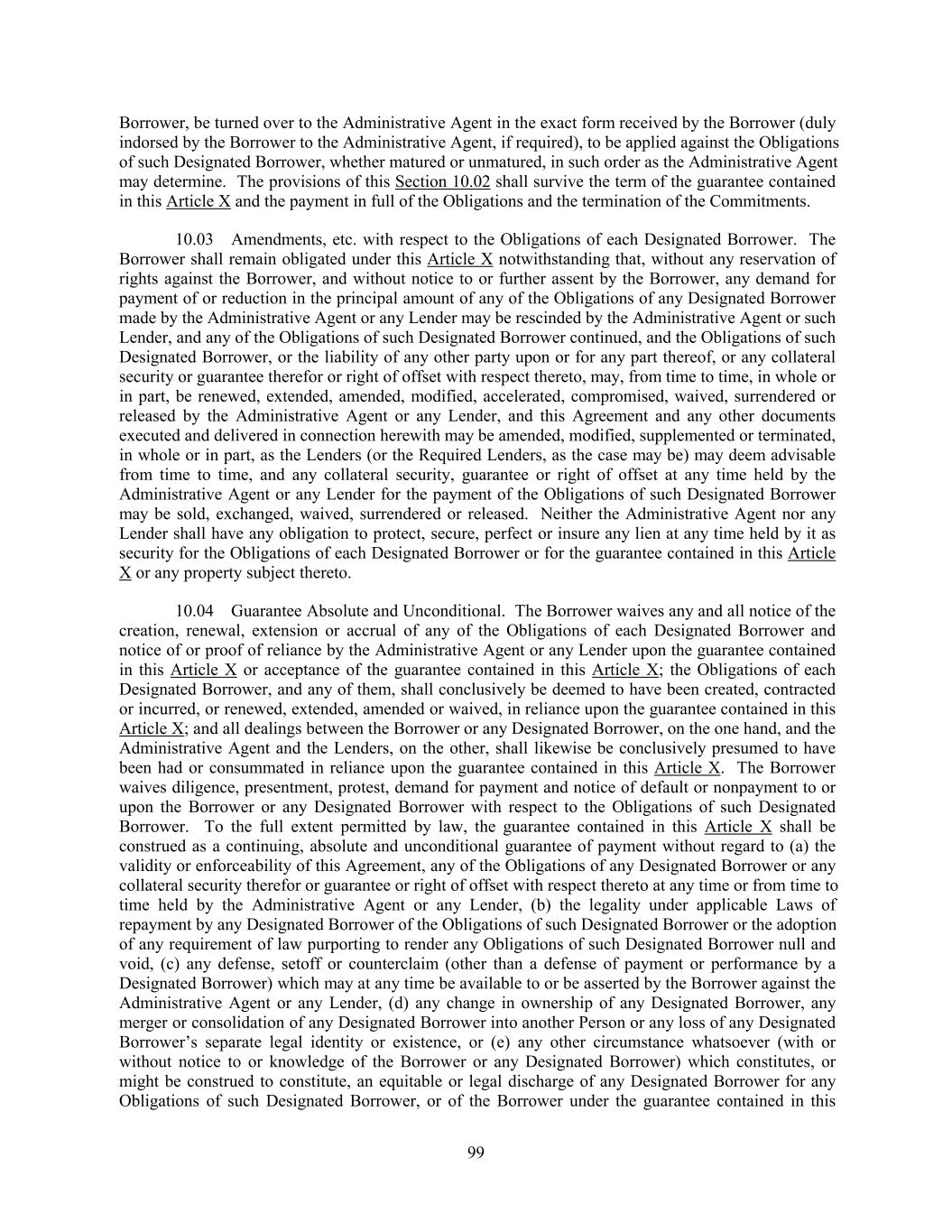 Borrower, be turned over to the Administrative Agent in the exact form received by the Borrower (duly indorsed by the Borrower to the Administrative Agent, if required), to be applied against the Obligations of such Designated Borrower, whether matured or unmatured, in such order as the Administrative Agent may determine. The provisions of this Section 10.02 shall survive the term of the guarantee contained in this Article X and the payment in full of the Obligations and the termination of the Commitments. 10.03 Amendments, etc. with respect to the Obligations of each Designated Borrower. The Borrower shall remain obligated under this Article X notwithstanding that, without any reservation of rights against the Borrower, and without notice to or further assent by the Borrower, any demand for payment of or reduction in the principal amount of any of the Obligations of any Designated Borrower made by the Administrative Agent or any Lender may be rescinded by the Administrative Agent or such Lender, and any of the Obligations of such Designated Borrower continued, and the Obligations of such Designated Borrower, or the liability of any other party upon or for any part thereof, or any collateral security or guarantee therefor or right of offset with respect thereto, may, from time to time, in whole or in part, be renewed, extended, amended, modified, accelerated, compromised, waived, surrendered or released by the Administrative Agent or any Lender, and this Agreement and any other documents executed and delivered in connection herewith may be amended, modified, supplemented or terminated, in whole or in part, as the Lenders (or the Required Lenders, as the case may be) may deem advisable from time to time, and any collateral security, guarantee or right of offset at any time held by the Administrative Agent or any Lender for the payment of the Obligations of such Designated Borrower may be sold, exchanged, waived, surrendered or released. Neither the Administrative Agent nor any Lender shall have any obligation to protect, secure, perfect or insure any lien at any time held by it as security for the Obligations of each Designated Borrower or for the guarantee contained in this Article X or any property subject thereto. 10.04 Guarantee Absolute and Unconditional. The Borrower waives any and all notice of the creation, renewal, extension or accrual of any of the Obligations of each Designated Borrower and notice of or proof of reliance by the Administrative Agent or any Lender upon the guarantee contained in this Article X or acceptance of the guarantee contained in this Article X; the Obligations of each Designated Borrower, and any of them, shall conclusively be deemed to have been created, contracted or incurred, or renewed, extended, amended or waived, in reliance upon the guarantee contained in this Article X; and all dealings between the Borrower or any Designated Borrower, on the one hand, and the Administrative Agent and the Lenders, on the other, shall likewise be conclusively presumed to have been had or consummated in reliance upon the guarantee contained in this Article X. The Borrower waives diligence, presentment, protest, demand for payment and notice of default or nonpayment to or upon the Borrower or any Designated Borrower with respect to the Obligations of such Designated Borrower. To the full extent permitted by law, the guarantee contained in this Article X shall be construed as a continuing, absolute and unconditional guarantee of payment without regard to (a) the validity or enforceability of this Agreement, any of the Obligations of any Designated Borrower or any collateral security therefor or guarantee or right of offset with respect thereto at any time or from time to time held by the Administrative Agent or any Lender, (b) the legality under applicable Laws of repayment by any Designated Borrower of the Obligations of such Designated Borrower or the adoption of any requirement of law purporting to render any Obligations of such Designated Borrower null and void, (c) any defense, setoff or counterclaim (other than a defense of payment or performance by a Designated Borrower) which may at any time be available to or be asserted by the Borrower against the Administrative Agent or any Lender, (d) any change in ownership of any Designated Borrower, any merger or consolidation of any Designated Borrower into another Person or any loss of any Designated Borrower’s separate legal identity or existence, or (e) any other circumstance whatsoever (with or without notice to or knowledge of the Borrower or any Designated Borrower) which constitutes, or might be construed to constitute, an equitable or legal discharge of any Designated Borrower for any Obligations of such Designated Borrower, or of the Borrower under the guarantee contained in this 99