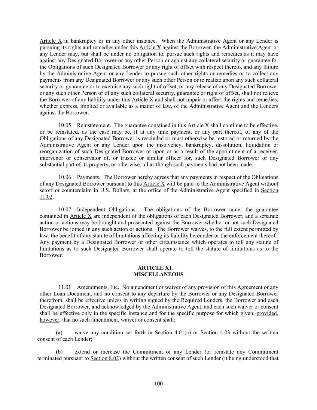 Article X in bankruptcy or in any other instance. When the Administrative Agent or any Lender is pursuing its rights and remedies under this Article X against the Borrower, the Administrative Agent or any Lender may, but shall be under no obligation to, pursue such rights and remedies as it may have against any Designated Borrower or any other Person or against any collateral security or guarantee for the Obligations of such Designated Borrower or any right of offset with respect thereto, and any failure by the Administrative Agent or any Lender to pursue such other rights or remedies or to collect any payments from any Designated Borrower or any such other Person or to realize upon any such collateral security or guarantee or to exercise any such right of offset, or any release of any Designated Borrower or any such other Person or of any such collateral security, guarantee or right of offset, shall not relieve the Borrower of any liability under this Article X and shall not impair or affect the rights and remedies, whether express, implied or available as a matter of law, of the Administrative Agent and the Lenders against the Borrower. 10.05 Reinstatement. The guarantee contained in this Article X shall continue to be effective, or be reinstated, as the case may be, if at any time payment, or any part thereof, of any of the Obligations of any Designated Borrower is rescinded or must otherwise be restored or returned by the Administrative Agent or any Lender upon the insolvency, bankruptcy, dissolution, liquidation or reorganization of such Designated Borrower or upon or as a result of the appointment of a receiver, intervenor or conservator of, or trustee or similar officer for, such Designated Borrower or any substantial part of its property, or otherwise, all as though such payments had not been made. 10.06 Payments. The Borrower hereby agrees that any payments in respect of the Obligations of any Designated Borrower pursuant to this Article X will be paid to the Administrative Agent without setoff or counterclaim in U.S. Dollars, at the office of the Administrative Agent specified in Section 11.02. 10.07 Independent Obligations. The obligations of the Borrower under the guarantee contained in Article X are independent of the obligations of each Designated Borrower, and a separate action or actions may be brought and prosecuted against the Borrower whether or not such Designated Borrower be joined in any such action or actions. The Borrower waives, to the full extent permitted by law, the benefit of any statute of limitations affecting its liability hereunder or the enforcement thereof. Any payment by a Designated Borrower or other circumstance which operates to toll any statute of limitations as to such Designated Borrower shall operate to toll the statute of limitations as to the Borrower. ARTICLE XI. MISCELLANEOUS 11.01 Amendments, Etc. No amendment or waiver of any provision of this Agreement or any other Loan Document, and no consent to any departure by the Borrower or any Designated Borrower therefrom, shall be effective unless in writing signed by the Required Lenders, the Borrower and each Designated Borrower, and acknowledged by the Administrative Agent, and each such waiver or consent shall be effective only in the specific instance and for the specific purpose for which given; provided, however, that no such amendment, waiver or consent shall: (a) waive any condition set forth in Section 4.01(a) or Section 4.03 without the written consent of each Lender; (b) extend or increase the Commitment of any Lender (or reinstate any Commitment terminated pursuant to Section 8.02) without the written consent of such Lender (it being understood that 100