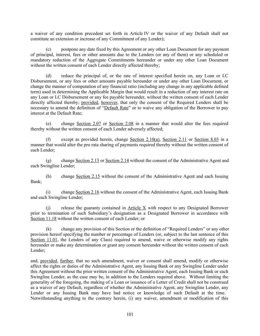 a waiver of any condition precedent set forth in Article IV or the waiver of any Default shall not constitute an extension or increase of any Commitment of any Lender); (c) postpone any date fixed by this Agreement or any other Loan Document for any payment of principal, interest, fees or other amounts due to the Lenders (or any of them) or any scheduled or mandatory reduction of the Aggregate Commitments hereunder or under any other Loan Document without the written consent of each Lender directly affected thereby; (d) reduce the principal of, or the rate of interest specified herein on, any Loan or LC Disbursement, or any fees or other amounts payable hereunder or under any other Loan Document, or change the manner of computation of any financial ratio (including any change in any applicable defined term) used in determining the Applicable Margin that would result in a reduction of any interest rate on any Loan or LC Disbursement or any fee payable hereunder, without the written consent of each Lender directly affected thereby; provided, however, that only the consent of the Required Lenders shall be necessary to amend the definition of “Default Rate” or to waive any obligation of the Borrower to pay interest at the Default Rate; (e) change Section 2.07 or Section 2.08 in a manner that would alter the fees required thereby without the written consent of each Lender adversely affected; (f) except as provided herein, change Section 2.10(a), Section 2.11 or Section 8.03 in a manner that would alter the pro rata sharing of payments required thereby without the written consent of each Lender; (g) change Section 2.13 or Section 2.14 without the consent of the Administrative Agent and each Swingline Lender; (h) change Section 2.15 without the consent of the Administrative Agent and each Issuing Bank; (i) change Section 2.16 without the consent of the Administrative Agent, each Issuing Bank and each Swingline Lender; (j) release the guaranty contained in Article X with respect to any Designated Borrower prior to termination of such Subsidiary’s designation as a Designated Borrower in accordance with Section 11.18 without the written consent of each Lender; or (k) change any provision of this Section or the definition of “Required Lenders” or any other provision hereof specifying the number or percentage of Lenders (or, subject to the last sentence of this Section 11.01, the Lenders of any Class) required to amend, waive or otherwise modify any rights hereunder or make any determination or grant any consent hereunder without the written consent of each Lender; and, provided, further, that no such amendment, waiver or consent shall amend, modify or otherwise affect the rights or duties of the Administrative Agent, any Issuing Bank or any Swingline Lender under this Agreement without the prior written consent of the Administrative Agent, each Issuing Bank or each Swingline Lender, as the case may be, in addition to the Lenders required above. Without limiting the generality of the foregoing, the making of a Loan or issuance of a Letter of Credit shall not be construed as a waiver of any Default, regardless of whether the Administrative Agent, any Swingline Lender, any Lender or any Issuing Bank may have had notice or knowledge of such Default at the time. Notwithstanding anything to the contrary herein, (i) any waiver, amendment or modification of this 101