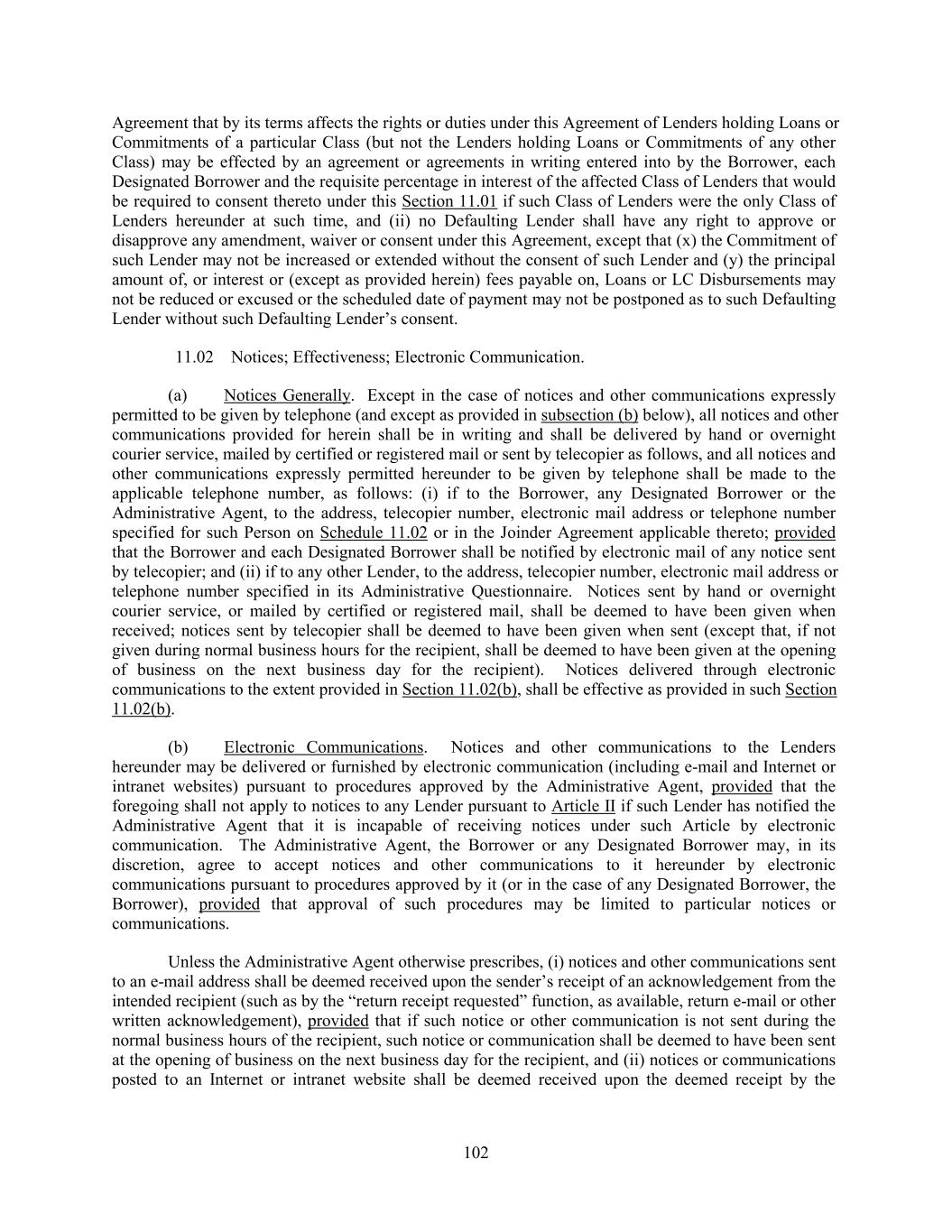 Agreement that by its terms affects the rights or duties under this Agreement of Lenders holding Loans or Commitments of a particular Class (but not the Lenders holding Loans or Commitments of any other Class) may be effected by an agreement or agreements in writing entered into by the Borrower, each Designated Borrower and the requisite percentage in interest of the affected Class of Lenders that would be required to consent thereto under this Section 11.01 if such Class of Lenders were the only Class of Lenders hereunder at such time, and (ii) no Defaulting Lender shall have any right to approve or disapprove any amendment, waiver or consent under this Agreement, except that (x) the Commitment of such Lender may not be increased or extended without the consent of such Lender and (y) the principal amount of, or interest or (except as provided herein) fees payable on, Loans or LC Disbursements may not be reduced or excused or the scheduled date of payment may not be postponed as to such Defaulting Lender without such Defaulting Lender’s consent. 11.02 Notices; Effectiveness; Electronic Communication. (a) Notices Generally. Except in the case of notices and other communications expressly permitted to be given by telephone (and except as provided in subsection (b) below), all notices and other communications provided for herein shall be in writing and shall be delivered by hand or overnight courier service, mailed by certified or registered mail or sent by telecopier as follows, and all notices and other communications expressly permitted hereunder to be given by telephone shall be made to the applicable telephone number, as follows: (i) if to the Borrower, any Designated Borrower or the Administrative Agent, to the address, telecopier number, electronic mail address or telephone number specified for such Person on Schedule 11.02 or in the Joinder Agreement applicable thereto; provided that the Borrower and each Designated Borrower shall be notified by electronic mail of any notice sent by telecopier; and (ii) if to any other Lender, to the address, telecopier number, electronic mail address or telephone number specified in its Administrative Questionnaire. Notices sent by hand or overnight courier service, or mailed by certified or registered mail, shall be deemed to have been given when received; notices sent by telecopier shall be deemed to have been given when sent (except that, if not given during normal business hours for the recipient, shall be deemed to have been given at the opening of business on the next business day for the recipient). Notices delivered through electronic communications to the extent provided in Section 11.02(b), shall be effective as provided in such Section 11.02(b). (b) Electronic Communications. Notices and other communications to the Lenders hereunder may be delivered or furnished by electronic communication (including e-mail and Internet or intranet websites) pursuant to procedures approved by the Administrative Agent, provided that the foregoing shall not apply to notices to any Lender pursuant to Article II if such Lender has notified the Administrative Agent that it is incapable of receiving notices under such Article by electronic communication. The Administrative Agent, the Borrower or any Designated Borrower may, in its discretion, agree to accept notices and other communications to it hereunder by electronic communications pursuant to procedures approved by it (or in the case of any Designated Borrower, the Borrower), provided that approval of such procedures may be limited to particular notices or communications. Unless the Administrative Agent otherwise prescribes, (i) notices and other communications sent to an e-mail address shall be deemed received upon the sender’s receipt of an acknowledgement from the intended recipient (such as by the “return receipt requested” function, as available, return e-mail or other written acknowledgement), provided that if such notice or other communication is not sent during the normal business hours of the recipient, such notice or communication shall be deemed to have been sent at the opening of business on the next business day for the recipient, and (ii) notices or communications posted to an Internet or intranet website shall be deemed received upon the deemed receipt by the 102