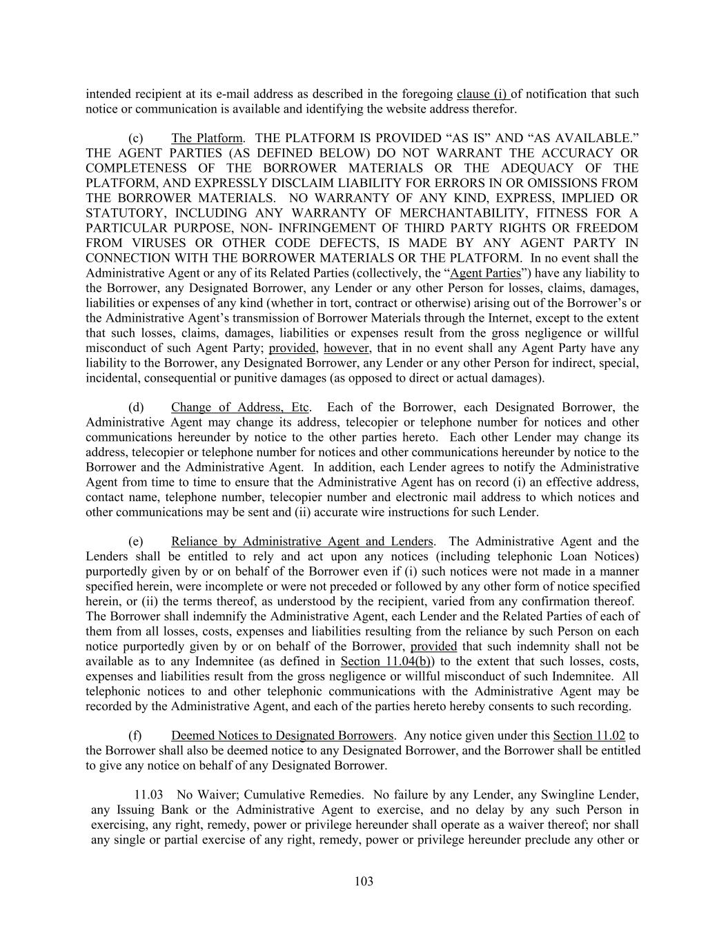 intended recipient at its e-mail address as described in the foregoing clause (i) of notification that such notice or communication is available and identifying the website address therefor. (c) The Platform. THE PLATFORM IS PROVIDED “AS IS” AND “AS AVAILABLE.” THE AGENT PARTIES (AS DEFINED BELOW) DO NOT WARRANT THE ACCURACY OR COMPLETENESS OF THE BORROWER MATERIALS OR THE ADEQUACY OF THE PLATFORM, AND EXPRESSLY DISCLAIM LIABILITY FOR ERRORS IN OR OMISSIONS FROM THE BORROWER MATERIALS. NO WARRANTY OF ANY KIND, EXPRESS, IMPLIED OR STATUTORY, INCLUDING ANY WARRANTY OF MERCHANTABILITY, FITNESS FOR A PARTICULAR PURPOSE, NON- INFRINGEMENT OF THIRD PARTY RIGHTS OR FREEDOM FROM VIRUSES OR OTHER CODE DEFECTS, IS MADE BY ANY AGENT PARTY IN CONNECTION WITH THE BORROWER MATERIALS OR THE PLATFORM. In no event shall the Administrative Agent or any of its Related Parties (collectively, the “Agent Parties”) have any liability to the Borrower, any Designated Borrower, any Lender or any other Person for losses, claims, damages, liabilities or expenses of any kind (whether in tort, contract or otherwise) arising out of the Borrower’s or the Administrative Agent’s transmission of Borrower Materials through the Internet, except to the extent that such losses, claims, damages, liabilities or expenses result from the gross negligence or willful misconduct of such Agent Party; provided, however, that in no event shall any Agent Party have any liability to the Borrower, any Designated Borrower, any Lender or any other Person for indirect, special, incidental, consequential or punitive damages (as opposed to direct or actual damages). (d) Change of Address, Etc. Each of the Borrower, each Designated Borrower, the Administrative Agent may change its address, telecopier or telephone number for notices and other communications hereunder by notice to the other parties hereto. Each other Lender may change its address, telecopier or telephone number for notices and other communications hereunder by notice to the Borrower and the Administrative Agent. In addition, each Lender agrees to notify the Administrative Agent from time to time to ensure that the Administrative Agent has on record (i) an effective address, contact name, telephone number, telecopier number and electronic mail address to which notices and other communications may be sent and (ii) accurate wire instructions for such Lender. (e) Reliance by Administrative Agent and Lenders. The Administrative Agent and the Lenders shall be entitled to rely and act upon any notices (including telephonic Loan Notices) purportedly given by or on behalf of the Borrower even if (i) such notices were not made in a manner specified herein, were incomplete or were not preceded or followed by any other form of notice specified herein, or (ii) the terms thereof, as understood by the recipient, varied from any confirmation thereof. The Borrower shall indemnify the Administrative Agent, each Lender and the Related Parties of each of them from all losses, costs, expenses and liabilities resulting from the reliance by such Person on each notice purportedly given by or on behalf of the Borrower, provided that such indemnity shall not be available as to any Indemnitee (as defined in Section 11.04(b)) to the extent that such losses, costs, expenses and liabilities result from the gross negligence or willful misconduct of such Indemnitee. All telephonic notices to and other telephonic communications with the Administrative Agent may be recorded by the Administrative Agent, and each of the parties hereto hereby consents to such recording. (f) Deemed Notices to Designated Borrowers. Any notice given under this Section 11.02 to the Borrower shall also be deemed notice to any Designated Borrower, and the Borrower shall be entitled to give any notice on behalf of any Designated Borrower. 11.03 No Waiver; Cumulative Remedies. No failure by any Lender, any Swingline Lender, any Issuing Bank or the Administrative Agent to exercise, and no delay by any such Person in exercising, any right, remedy, power or privilege hereunder shall operate as a waiver thereof; nor shall any single or partial exercise of any right, remedy, power or privilege hereunder preclude any other or 103