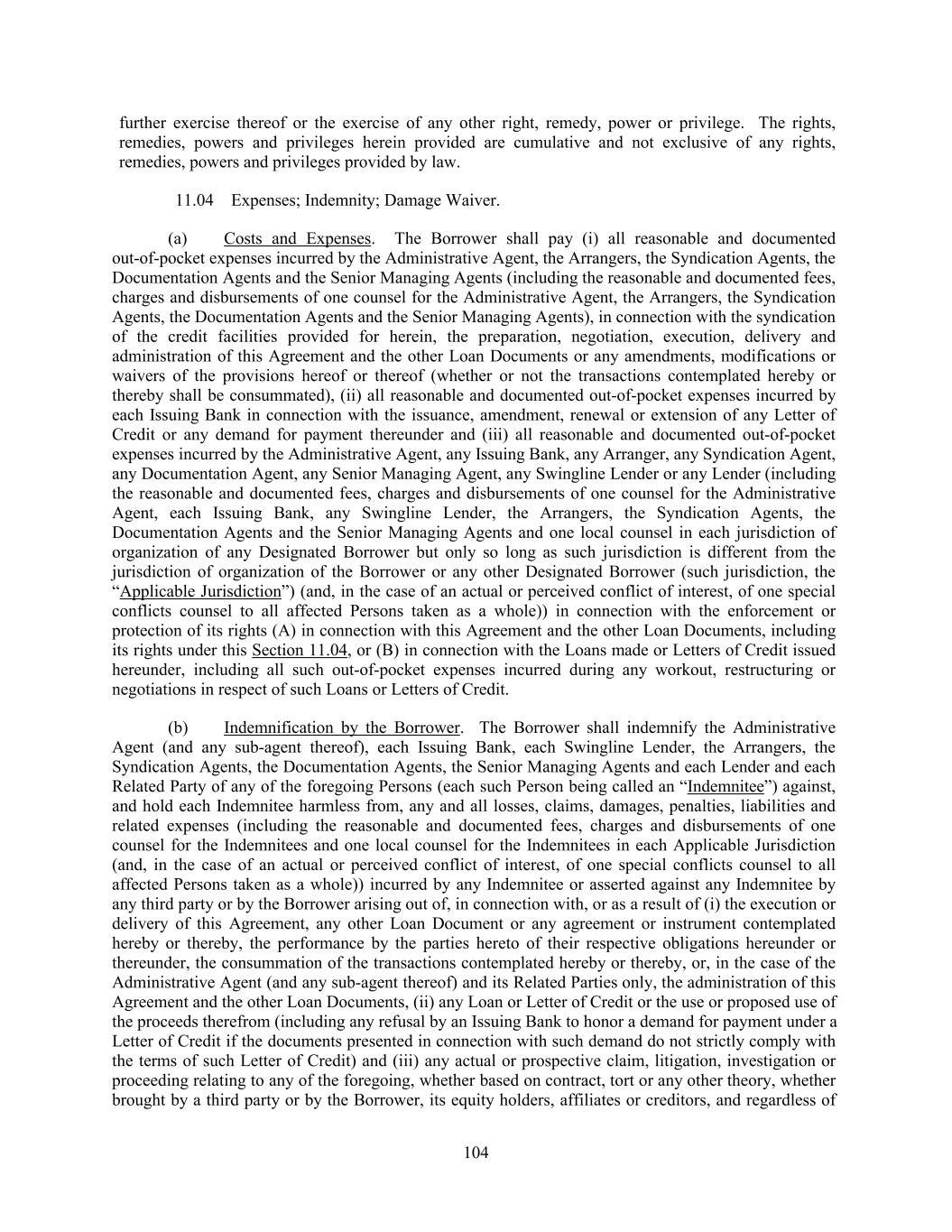 further exercise thereof or the exercise of any other right, remedy, power or privilege. The rights, remedies, powers and privileges herein provided are cumulative and not exclusive of any rights, remedies, powers and privileges provided by law. 11.04 Expenses; Indemnity; Damage Waiver. (a) Costs and Expenses. The Borrower shall pay (i) all reasonable and documented out-of-pocket expenses incurred by the Administrative Agent, the Arrangers, the Syndication Agents, the Documentation Agents and the Senior Managing Agents (including the reasonable and documented fees, charges and disbursements of one counsel for the Administrative Agent, the Arrangers, the Syndication Agents, the Documentation Agents and the Senior Managing Agents), in connection with the syndication of the credit facilities provided for herein, the preparation, negotiation, execution, delivery and administration of this Agreement and the other Loan Documents or any amendments, modifications or waivers of the provisions hereof or thereof (whether or not the transactions contemplated hereby or thereby shall be consummated), (ii) all reasonable and documented out-of-pocket expenses incurred by each Issuing Bank in connection with the issuance, amendment, renewal or extension of any Letter of Credit or any demand for payment thereunder and (iii) all reasonable and documented out-of-pocket expenses incurred by the Administrative Agent, any Issuing Bank, any Arranger, any Syndication Agent, any Documentation Agent, any Senior Managing Agent, any Swingline Lender or any Lender (including the reasonable and documented fees, charges and disbursements of one counsel for the Administrative Agent, each Issuing Bank, any Swingline Lender, the Arrangers, the Syndication Agents, the Documentation Agents and the Senior Managing Agents and one local counsel in each jurisdiction of organization of any Designated Borrower but only so long as such jurisdiction is different from the jurisdiction of organization of the Borrower or any other Designated Borrower (such jurisdiction, the “Applicable Jurisdiction”) (and, in the case of an actual or perceived conflict of interest, of one special conflicts counsel to all affected Persons taken as a whole)) in connection with the enforcement or protection of its rights (A) in connection with this Agreement and the other Loan Documents, including its rights under this Section 11.04, or (B) in connection with the Loans made or Letters of Credit issued hereunder, including all such out-of-pocket expenses incurred during any workout, restructuring or negotiations in respect of such Loans or Letters of Credit. (b) Indemnification by the Borrower. The Borrower shall indemnify the Administrative Agent (and any sub-agent thereof), each Issuing Bank, each Swingline Lender, the Arrangers, the Syndication Agents, the Documentation Agents, the Senior Managing Agents and each Lender and each Related Party of any of the foregoing Persons (each such Person being called an “Indemnitee”) against, and hold each Indemnitee harmless from, any and all losses, claims, damages, penalties, liabilities and related expenses (including the reasonable and documented fees, charges and disbursements of one counsel for the Indemnitees and one local counsel for the Indemnitees in each Applicable Jurisdiction (and, in the case of an actual or perceived conflict of interest, of one special conflicts counsel to all affected Persons taken as a whole)) incurred by any Indemnitee or asserted against any Indemnitee by any third party or by the Borrower arising out of, in connection with, or as a result of (i) the execution or delivery of this Agreement, any other Loan Document or any agreement or instrument contemplated hereby or thereby, the performance by the parties hereto of their respective obligations hereunder or thereunder, the consummation of the transactions contemplated hereby or thereby, or, in the case of the Administrative Agent (and any sub-agent thereof) and its Related Parties only, the administration of this Agreement and the other Loan Documents, (ii) any Loan or Letter of Credit or the use or proposed use of the proceeds therefrom (including any refusal by an Issuing Bank to honor a demand for payment under a Letter of Credit if the documents presented in connection with such demand do not strictly comply with the terms of such Letter of Credit) and (iii) any actual or prospective claim, litigation, investigation or proceeding relating to any of the foregoing, whether based on contract, tort or any other theory, whether brought by a third party or by the Borrower, its equity holders, affiliates or creditors, and regardless of 104
