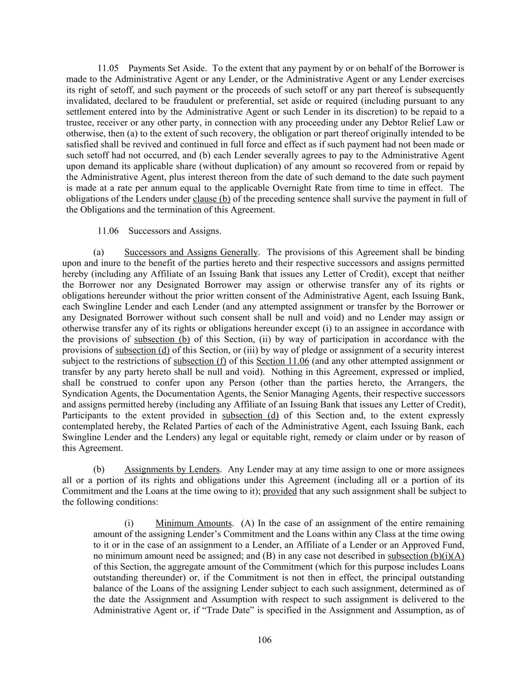 11.05 Payments Set Aside. To the extent that any payment by or on behalf of the Borrower is made to the Administrative Agent or any Lender, or the Administrative Agent or any Lender exercises its right of setoff, and such payment or the proceeds of such setoff or any part thereof is subsequently invalidated, declared to be fraudulent or preferential, set aside or required (including pursuant to any settlement entered into by the Administrative Agent or such Lender in its discretion) to be repaid to a trustee, receiver or any other party, in connection with any proceeding under any Debtor Relief Law or otherwise, then (a) to the extent of such recovery, the obligation or part thereof originally intended to be satisfied shall be revived and continued in full force and effect as if such payment had not been made or such setoff had not occurred, and (b) each Lender severally agrees to pay to the Administrative Agent upon demand its applicable share (without duplication) of any amount so recovered from or repaid by the Administrative Agent, plus interest thereon from the date of such demand to the date such payment is made at a rate per annum equal to the applicable Overnight Rate from time to time in effect. The obligations of the Lenders under clause (b) of the preceding sentence shall survive the payment in full of the Obligations and the termination of this Agreement. 11.06 Successors and Assigns. (a) Successors and Assigns Generally. The provisions of this Agreement shall be binding upon and inure to the benefit of the parties hereto and their respective successors and assigns permitted hereby (including any Affiliate of an Issuing Bank that issues any Letter of Credit), except that neither the Borrower nor any Designated Borrower may assign or otherwise transfer any of its rights or obligations hereunder without the prior written consent of the Administrative Agent, each Issuing Bank, each Swingline Lender and each Lender (and any attempted assignment or transfer by the Borrower or any Designated Borrower without such consent shall be null and void) and no Lender may assign or otherwise transfer any of its rights or obligations hereunder except (i) to an assignee in accordance with the provisions of subsection (b) of this Section, (ii) by way of participation in accordance with the provisions of subsection (d) of this Section, or (iii) by way of pledge or assignment of a security interest subject to the restrictions of subsection (f) of this Section 11.06 (and any other attempted assignment or transfer by any party hereto shall be null and void). Nothing in this Agreement, expressed or implied, shall be construed to confer upon any Person (other than the parties hereto, the Arrangers, the Syndication Agents, the Documentation Agents, the Senior Managing Agents, their respective successors and assigns permitted hereby (including any Affiliate of an Issuing Bank that issues any Letter of Credit), Participants to the extent provided in subsection (d) of this Section and, to the extent expressly contemplated hereby, the Related Parties of each of the Administrative Agent, each Issuing Bank, each Swingline Lender and the Lenders) any legal or equitable right, remedy or claim under or by reason of this Agreement. (b) Assignments by Lenders. Any Lender may at any time assign to one or more assignees all or a portion of its rights and obligations under this Agreement (including all or a portion of its Commitment and the Loans at the time owing to it); provided that any such assignment shall be subject to the following conditions: (i) Minimum Amounts. (A) In the case of an assignment of the entire remaining amount of the assigning Lender’s Commitment and the Loans within any Class at the time owing to it or in the case of an assignment to a Lender, an Affiliate of a Lender or an Approved Fund, no minimum amount need be assigned; and (B) in any case not described in subsection (b)(i)(A) of this Section, the aggregate amount of the Commitment (which for this purpose includes Loans outstanding thereunder) or, if the Commitment is not then in effect, the principal outstanding balance of the Loans of the assigning Lender subject to each such assignment, determined as of the date the Assignment and Assumption with respect to such assignment is delivered to the Administrative Agent or, if “Trade Date” is specified in the Assignment and Assumption, as of 106