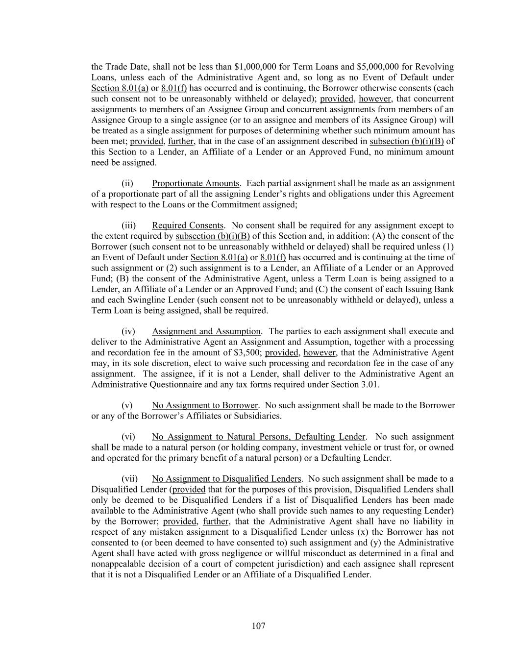 the Trade Date, shall not be less than $1,000,000 for Term Loans and $5,000,000 for Revolving Loans, unless each of the Administrative Agent and, so long as no Event of Default under Section 8.01(a) or 8.01(f) has occurred and is continuing, the Borrower otherwise consents (each such consent not to be unreasonably withheld or delayed); provided, however, that concurrent assignments to members of an Assignee Group and concurrent assignments from members of an Assignee Group to a single assignee (or to an assignee and members of its Assignee Group) will be treated as a single assignment for purposes of determining whether such minimum amount has been met; provided, further, that in the case of an assignment described in subsection (b)(i)(B) of this Section to a Lender, an Affiliate of a Lender or an Approved Fund, no minimum amount need be assigned. (ii) Proportionate Amounts. Each partial assignment shall be made as an assignment of a proportionate part of all the assigning Lender’s rights and obligations under this Agreement with respect to the Loans or the Commitment assigned; (iii) Required Consents. No consent shall be required for any assignment except to the extent required by subsection (b)(i)(B) of this Section and, in addition: (A) the consent of the Borrower (such consent not to be unreasonably withheld or delayed) shall be required unless (1) an Event of Default under Section 8.01(a) or 8.01(f) has occurred and is continuing at the time of such assignment or (2) such assignment is to a Lender, an Affiliate of a Lender or an Approved Fund; (B) the consent of the Administrative Agent, unless a Term Loan is being assigned to a Lender, an Affiliate of a Lender or an Approved Fund; and (C) the consent of each Issuing Bank and each Swingline Lender (such consent not to be unreasonably withheld or delayed), unless a Term Loan is being assigned, shall be required. (iv) Assignment and Assumption. The parties to each assignment shall execute and deliver to the Administrative Agent an Assignment and Assumption, together with a processing and recordation fee in the amount of $3,500; provided, however, that the Administrative Agent may, in its sole discretion, elect to waive such processing and recordation fee in the case of any assignment. The assignee, if it is not a Lender, shall deliver to the Administrative Agent an Administrative Questionnaire and any tax forms required under Section 3.01. (v) No Assignment to Borrower. No such assignment shall be made to the Borrower or any of the Borrower’s Affiliates or Subsidiaries. (vi) No Assignment to Natural Persons, Defaulting Lender. No such assignment shall be made to a natural person (or holding company, investment vehicle or trust for, or owned and operated for the primary benefit of a natural person) or a Defaulting Lender. (vii) No Assignment to Disqualified Lenders. No such assignment shall be made to a Disqualified Lender (provided that for the purposes of this provision, Disqualified Lenders shall only be deemed to be Disqualified Lenders if a list of Disqualified Lenders has been made available to the Administrative Agent (who shall provide such names to any requesting Lender) by the Borrower; provided, further, that the Administrative Agent shall have no liability in respect of any mistaken assignment to a Disqualified Lender unless (x) the Borrower has not consented to (or been deemed to have consented to) such assignment and (y) the Administrative Agent shall have acted with gross negligence or willful misconduct as determined in a final and nonappealable decision of a court of competent jurisdiction) and each assignee shall represent that it is not a Disqualified Lender or an Affiliate of a Disqualified Lender. 107