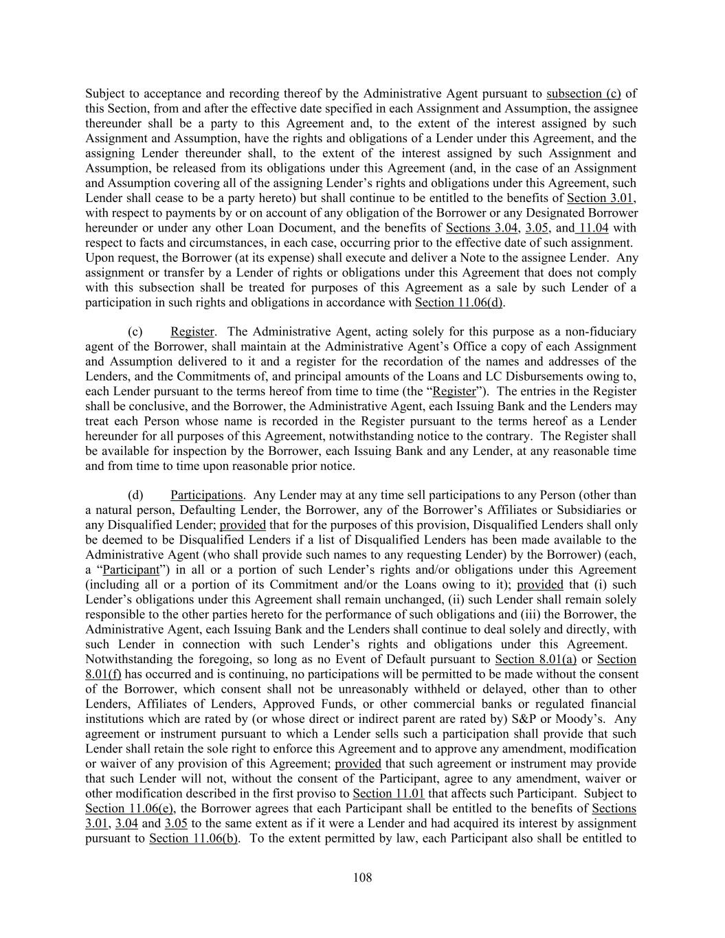 Subject to acceptance and recording thereof by the Administrative Agent pursuant to subsection (c) of this Section, from and after the effective date specified in each Assignment and Assumption, the assignee thereunder shall be a party to this Agreement and, to the extent of the interest assigned by such Assignment and Assumption, have the rights and obligations of a Lender under this Agreement, and the assigning Lender thereunder shall, to the extent of the interest assigned by such Assignment and Assumption, be released from its obligations under this Agreement (and, in the case of an Assignment and Assumption covering all of the assigning Lender’s rights and obligations under this Agreement, such Lender shall cease to be a party hereto) but shall continue to be entitled to the benefits of Section 3.01, with respect to payments by or on account of any obligation of the Borrower or any Designated Borrower hereunder or under any other Loan Document, and the benefits of Sections 3.04, 3.05, and 11.04 with respect to facts and circumstances, in each case, occurring prior to the effective date of such assignment. Upon request, the Borrower (at its expense) shall execute and deliver a Note to the assignee Lender. Any assignment or transfer by a Lender of rights or obligations under this Agreement that does not comply with this subsection shall be treated for purposes of this Agreement as a sale by such Lender of a participation in such rights and obligations in accordance with Section 11.06(d). (c) Register. The Administrative Agent, acting solely for this purpose as a non-fiduciary agent of the Borrower, shall maintain at the Administrative Agent’s Office a copy of each Assignment and Assumption delivered to it and a register for the recordation of the names and addresses of the Lenders, and the Commitments of, and principal amounts of the Loans and LC Disbursements owing to, each Lender pursuant to the terms hereof from time to time (the “Register”). The entries in the Register shall be conclusive, and the Borrower, the Administrative Agent, each Issuing Bank and the Lenders may treat each Person whose name is recorded in the Register pursuant to the terms hereof as a Lender hereunder for all purposes of this Agreement, notwithstanding notice to the contrary. The Register shall be available for inspection by the Borrower, each Issuing Bank and any Lender, at any reasonable time and from time to time upon reasonable prior notice. (d) Participations. Any Lender may at any time sell participations to any Person (other than a natural person, Defaulting Lender, the Borrower, any of the Borrower’s Affiliates or Subsidiaries or any Disqualified Lender; provided that for the purposes of this provision, Disqualified Lenders shall only be deemed to be Disqualified Lenders if a list of Disqualified Lenders has been made available to the Administrative Agent (who shall provide such names to any requesting Lender) by the Borrower) (each, a “Participant”) in all or a portion of such Lender’s rights and/or obligations under this Agreement (including all or a portion of its Commitment and/or the Loans owing to it); provided that (i) such Lender’s obligations under this Agreement shall remain unchanged, (ii) such Lender shall remain solely responsible to the other parties hereto for the performance of such obligations and (iii) the Borrower, the Administrative Agent, each Issuing Bank and the Lenders shall continue to deal solely and directly, with such Lender in connection with such Lender’s rights and obligations under this Agreement. Notwithstanding the foregoing, so long as no Event of Default pursuant to Section 8.01(a) or Section 8.01(f) has occurred and is continuing, no participations will be permitted to be made without the consent of the Borrower, which consent shall not be unreasonably withheld or delayed, other than to other Lenders, Affiliates of Lenders, Approved Funds, or other commercial banks or regulated financial institutions which are rated by (or whose direct or indirect parent are rated by) S&P or Moody’s. Any agreement or instrument pursuant to which a Lender sells such a participation shall provide that such Lender shall retain the sole right to enforce this Agreement and to approve any amendment, modification or waiver of any provision of this Agreement; provided that such agreement or instrument may provide that such Lender will not, without the consent of the Participant, agree to any amendment, waiver or other modification described in the first proviso to Section 11.01 that affects such Participant. Subject to Section 11.06(e), the Borrower agrees that each Participant shall be entitled to the benefits of Sections 3.01, 3.04 and 3.05 to the same extent as if it were a Lender and had acquired its interest by assignment pursuant to Section 11.06(b). To the extent permitted by law, each Participant also shall be entitled to 108