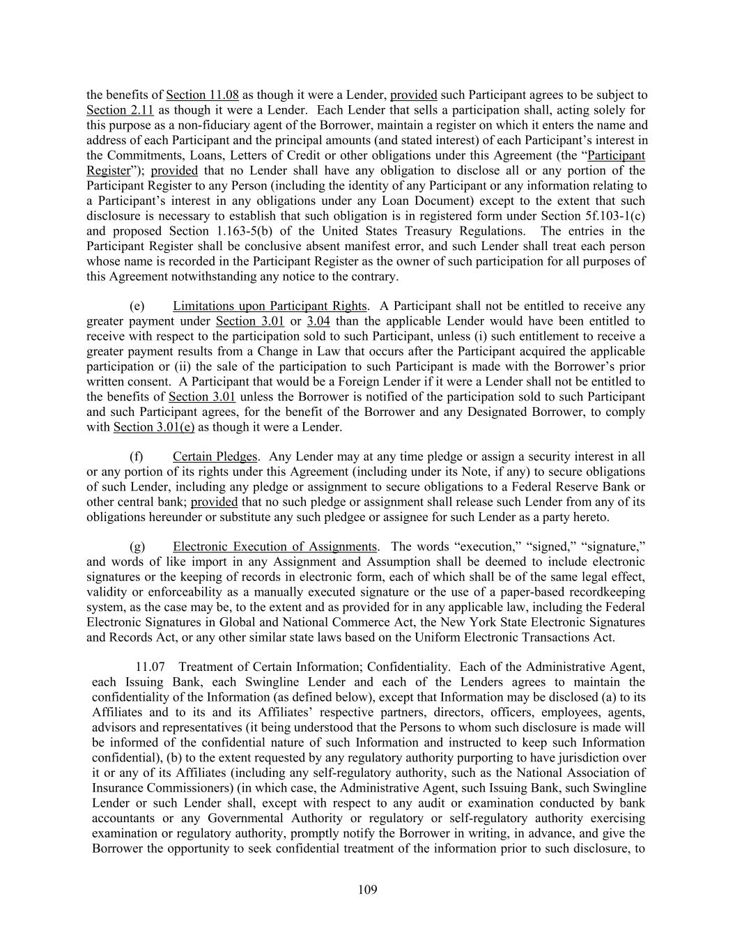 the benefits of Section 11.08 as though it were a Lender, provided such Participant agrees to be subject to Section 2.11 as though it were a Lender. Each Lender that sells a participation shall, acting solely for this purpose as a non-fiduciary agent of the Borrower, maintain a register on which it enters the name and address of each Participant and the principal amounts (and stated interest) of each Participant’s interest in the Commitments, Loans, Letters of Credit or other obligations under this Agreement (the “Participant Register”); provided that no Lender shall have any obligation to disclose all or any portion of the Participant Register to any Person (including the identity of any Participant or any information relating to a Participant’s interest in any obligations under any Loan Document) except to the extent that such disclosure is necessary to establish that such obligation is in registered form under Section 5f.103-1(c) and proposed Section 1.163-5(b) of the United States Treasury Regulations. The entries in the Participant Register shall be conclusive absent manifest error, and such Lender shall treat each person whose name is recorded in the Participant Register as the owner of such participation for all purposes of this Agreement notwithstanding any notice to the contrary. (e) Limitations upon Participant Rights. A Participant shall not be entitled to receive any greater payment under Section 3.01 or 3.04 than the applicable Lender would have been entitled to receive with respect to the participation sold to such Participant, unless (i) such entitlement to receive a greater payment results from a Change in Law that occurs after the Participant acquired the applicable participation or (ii) the sale of the participation to such Participant is made with the Borrower’s prior written consent. A Participant that would be a Foreign Lender if it were a Lender shall not be entitled to the benefits of Section 3.01 unless the Borrower is notified of the participation sold to such Participant and such Participant agrees, for the benefit of the Borrower and any Designated Borrower, to comply with Section 3.01(e) as though it were a Lender. (f) Certain Pledges. Any Lender may at any time pledge or assign a security interest in all or any portion of its rights under this Agreement (including under its Note, if any) to secure obligations of such Lender, including any pledge or assignment to secure obligations to a Federal Reserve Bank or other central bank; provided that no such pledge or assignment shall release such Lender from any of its obligations hereunder or substitute any such pledgee or assignee for such Lender as a party hereto. (g) Electronic Execution of Assignments. The words “execution,” “signed,” “signature,” and words of like import in any Assignment and Assumption shall be deemed to include electronic signatures or the keeping of records in electronic form, each of which shall be of the same legal effect, validity or enforceability as a manually executed signature or the use of a paper-based recordkeeping system, as the case may be, to the extent and as provided for in any applicable law, including the Federal Electronic Signatures in Global and National Commerce Act, the New York State Electronic Signatures and Records Act, or any other similar state laws based on the Uniform Electronic Transactions Act. 11.07 Treatment of Certain Information; Confidentiality. Each of the Administrative Agent, each Issuing Bank, each Swingline Lender and each of the Lenders agrees to maintain the confidentiality of the Information (as defined below), except that Information may be disclosed (a) to its Affiliates and to its and its Affiliates’ respective partners, directors, officers, employees, agents, advisors and representatives (it being understood that the Persons to whom such disclosure is made will be informed of the confidential nature of such Information and instructed to keep such Information confidential), (b) to the extent requested by any regulatory authority purporting to have jurisdiction over it or any of its Affiliates (including any self-regulatory authority, such as the National Association of Insurance Commissioners) (in which case, the Administrative Agent, such Issuing Bank, such Swingline Lender or such Lender shall, except with respect to any audit or examination conducted by bank accountants or any Governmental Authority or regulatory or self-regulatory authority exercising examination or regulatory authority, promptly notify the Borrower in writing, in advance, and give the Borrower the opportunity to seek confidential treatment of the information prior to such disclosure, to 109