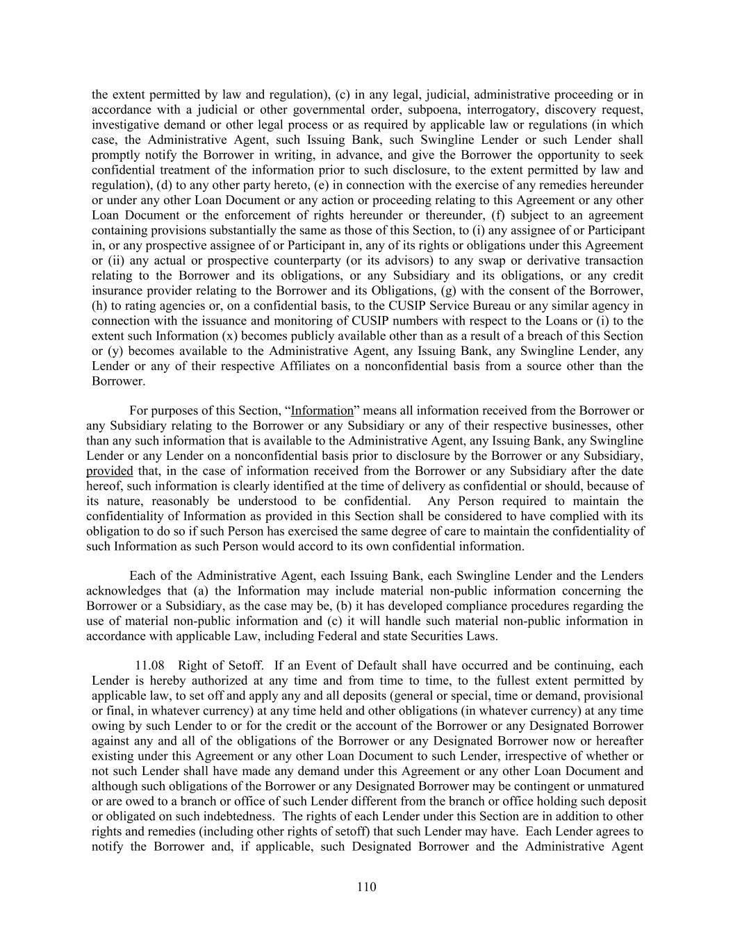 the extent permitted by law and regulation), (c) in any legal, judicial, administrative proceeding or in accordance with a judicial or other governmental order, subpoena, interrogatory, discovery request, investigative demand or other legal process or as required by applicable law or regulations (in which case, the Administrative Agent, such Issuing Bank, such Swingline Lender or such Lender shall promptly notify the Borrower in writing, in advance, and give the Borrower the opportunity to seek confidential treatment of the information prior to such disclosure, to the extent permitted by law and regulation), (d) to any other party hereto, (e) in connection with the exercise of any remedies hereunder or under any other Loan Document or any action or proceeding relating to this Agreement or any other Loan Document or the enforcement of rights hereunder or thereunder, (f) subject to an agreement containing provisions substantially the same as those of this Section, to (i) any assignee of or Participant in, or any prospective assignee of or Participant in, any of its rights or obligations under this Agreement or (ii) any actual or prospective counterparty (or its advisors) to any swap or derivative transaction relating to the Borrower and its obligations, or any Subsidiary and its obligations, or any credit insurance provider relating to the Borrower and its Obligations, (g) with the consent of the Borrower, (h) to rating agencies or, on a confidential basis, to the CUSIP Service Bureau or any similar agency in connection with the issuance and monitoring of CUSIP numbers with respect to the Loans or (i) to the extent such Information (x) becomes publicly available other than as a result of a breach of this Section or (y) becomes available to the Administrative Agent, any Issuing Bank, any Swingline Lender, any Lender or any of their respective Affiliates on a nonconfidential basis from a source other than the Borrower. For purposes of this Section, “Information” means all information received from the Borrower or any Subsidiary relating to the Borrower or any Subsidiary or any of their respective businesses, other than any such information that is available to the Administrative Agent, any Issuing Bank, any Swingline Lender or any Lender on a nonconfidential basis prior to disclosure by the Borrower or any Subsidiary, provided that, in the case of information received from the Borrower or any Subsidiary after the date hereof, such information is clearly identified at the time of delivery as confidential or should, because of its nature, reasonably be understood to be confidential. Any Person required to maintain the confidentiality of Information as provided in this Section shall be considered to have complied with its obligation to do so if such Person has exercised the same degree of care to maintain the confidentiality of such Information as such Person would accord to its own confidential information. Each of the Administrative Agent, each Issuing Bank, each Swingline Lender and the Lenders acknowledges that (a) the Information may include material non-public information concerning the Borrower or a Subsidiary, as the case may be, (b) it has developed compliance procedures regarding the use of material non-public information and (c) it will handle such material non-public information in accordance with applicable Law, including Federal and state Securities Laws. 11.08 Right of Setoff. If an Event of Default shall have occurred and be continuing, each Lender is hereby authorized at any time and from time to time, to the fullest extent permitted by applicable law, to set off and apply any and all deposits (general or special, time or demand, provisional or final, in whatever currency) at any time held and other obligations (in whatever currency) at any time owing by such Lender to or for the credit or the account of the Borrower or any Designated Borrower against any and all of the obligations of the Borrower or any Designated Borrower now or hereafter existing under this Agreement or any other Loan Document to such Lender, irrespective of whether or not such Lender shall have made any demand under this Agreement or any other Loan Document and although such obligations of the Borrower or any Designated Borrower may be contingent or unmatured or are owed to a branch or office of such Lender different from the branch or office holding such deposit or obligated on such indebtedness. The rights of each Lender under this Section are in addition to other rights and remedies (including other rights of setoff) that such Lender may have. Each Lender agrees to notify the Borrower and, if applicable, such Designated Borrower and the Administrative Agent 110