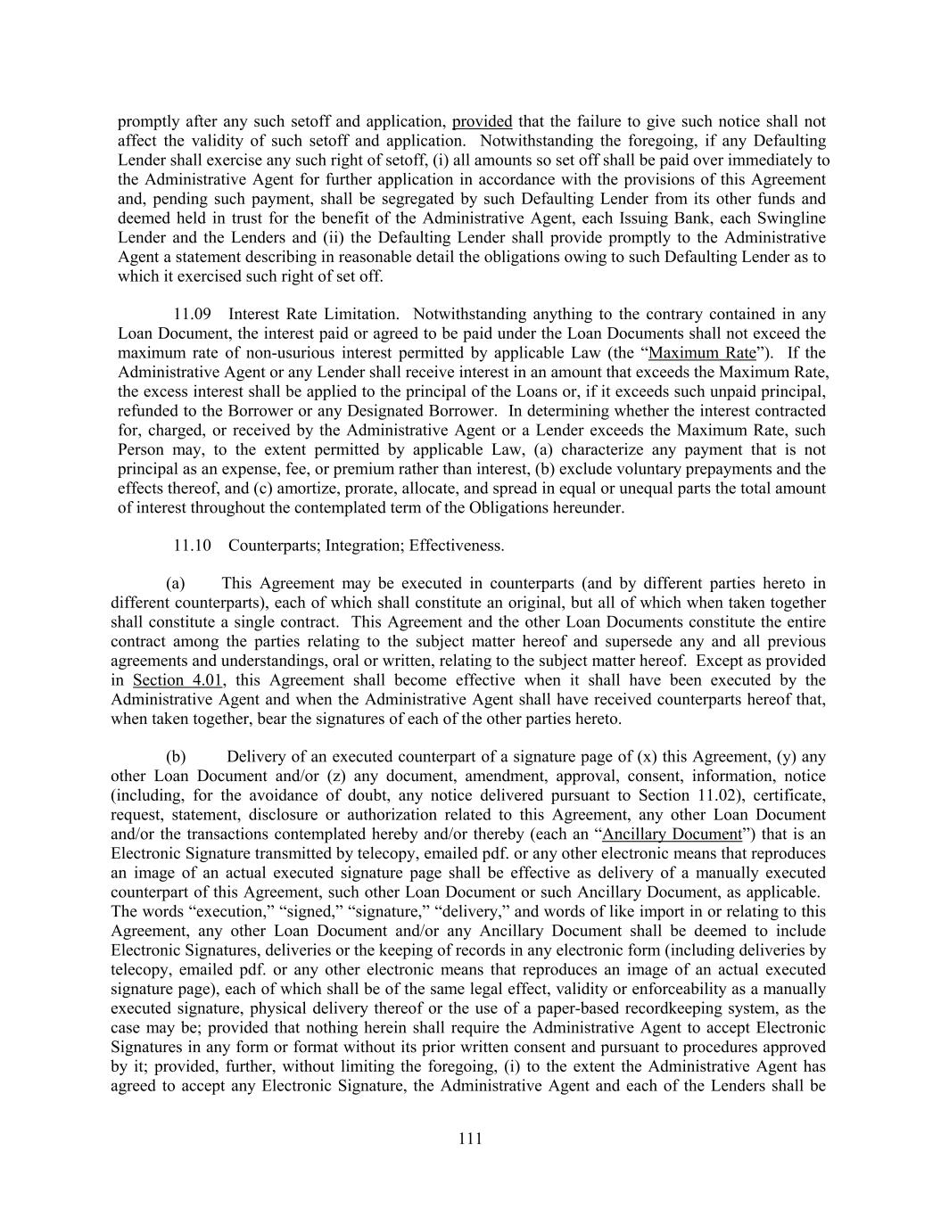 promptly after any such setoff and application, provided that the failure to give such notice shall not affect the validity of such setoff and application. Notwithstanding the foregoing, if any Defaulting Lender shall exercise any such right of setoff, (i) all amounts so set off shall be paid over immediately to the Administrative Agent for further application in accordance with the provisions of this Agreement and, pending such payment, shall be segregated by such Defaulting Lender from its other funds and deemed held in trust for the benefit of the Administrative Agent, each Issuing Bank, each Swingline Lender and the Lenders and (ii) the Defaulting Lender shall provide promptly to the Administrative Agent a statement describing in reasonable detail the obligations owing to such Defaulting Lender as to which it exercised such right of set off. 11.09 Interest Rate Limitation. Notwithstanding anything to the contrary contained in any Loan Document, the interest paid or agreed to be paid under the Loan Documents shall not exceed the maximum rate of non-usurious interest permitted by applicable Law (the “Maximum Rate”). If the Administrative Agent or any Lender shall receive interest in an amount that exceeds the Maximum Rate, the excess interest shall be applied to the principal of the Loans or, if it exceeds such unpaid principal, refunded to the Borrower or any Designated Borrower. In determining whether the interest contracted for, charged, or received by the Administrative Agent or a Lender exceeds the Maximum Rate, such Person may, to the extent permitted by applicable Law, (a) characterize any payment that is not principal as an expense, fee, or premium rather than interest, (b) exclude voluntary prepayments and the effects thereof, and (c) amortize, prorate, allocate, and spread in equal or unequal parts the total amount of interest throughout the contemplated term of the Obligations hereunder. 11.10 Counterparts; Integration; Effectiveness. (a) This Agreement may be executed in counterparts (and by different parties hereto in different counterparts), each of which shall constitute an original, but all of which when taken together shall constitute a single contract. This Agreement and the other Loan Documents constitute the entire contract among the parties relating to the subject matter hereof and supersede any and all previous agreements and understandings, oral or written, relating to the subject matter hereof. Except as provided in Section 4.01, this Agreement shall become effective when it shall have been executed by the Administrative Agent and when the Administrative Agent shall have received counterparts hereof that, when taken together, bear the signatures of each of the other parties hereto. (b) Delivery of an executed counterpart of a signature page of (x) this Agreement, (y) any other Loan Document and/or (z) any document, amendment, approval, consent, information, notice (including, for the avoidance of doubt, any notice delivered pursuant to Section 11.02), certificate, request, statement, disclosure or authorization related to this Agreement, any other Loan Document and/or the transactions contemplated hereby and/or thereby (each an “Ancillary Document”) that is an Electronic Signature transmitted by telecopy, emailed pdf. or any other electronic means that reproduces an image of an actual executed signature page shall be effective as delivery of a manually executed counterpart of this Agreement, such other Loan Document or such Ancillary Document, as applicable. The words “execution,” “signed,” “signature,” “delivery,” and words of like import in or relating to this Agreement, any other Loan Document and/or any Ancillary Document shall be deemed to include Electronic Signatures, deliveries or the keeping of records in any electronic form (including deliveries by telecopy, emailed pdf. or any other electronic means that reproduces an image of an actual executed signature page), each of which shall be of the same legal effect, validity or enforceability as a manually executed signature, physical delivery thereof or the use of a paper-based recordkeeping system, as the case may be; provided that nothing herein shall require the Administrative Agent to accept Electronic Signatures in any form or format without its prior written consent and pursuant to procedures approved by it; provided, further, without limiting the foregoing, (i) to the extent the Administrative Agent has agreed to accept any Electronic Signature, the Administrative Agent and each of the Lenders shall be 111