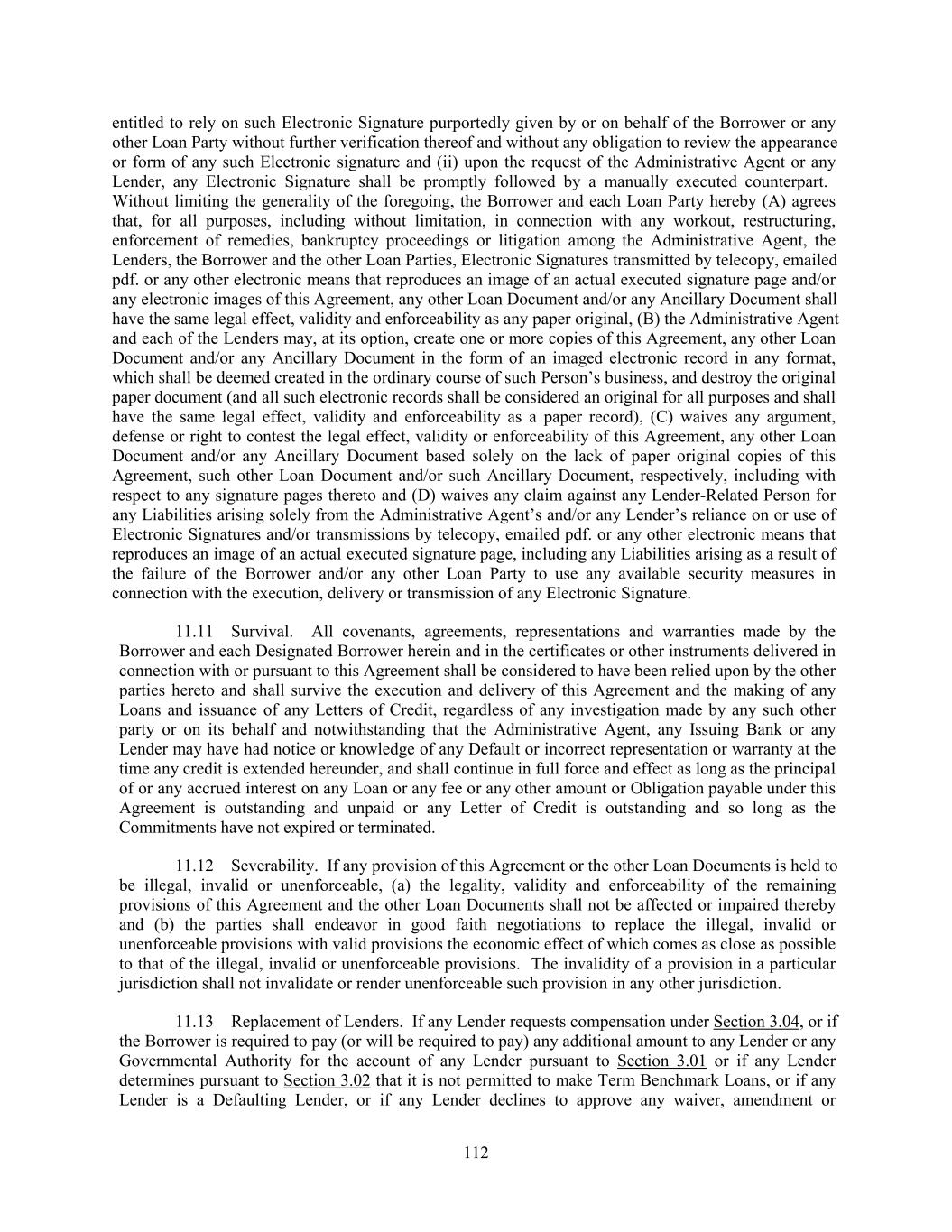 entitled to rely on such Electronic Signature purportedly given by or on behalf of the Borrower or any other Loan Party without further verification thereof and without any obligation to review the appearance or form of any such Electronic signature and (ii) upon the request of the Administrative Agent or any Lender, any Electronic Signature shall be promptly followed by a manually executed counterpart. Without limiting the generality of the foregoing, the Borrower and each Loan Party hereby (A) agrees that, for all purposes, including without limitation, in connection with any workout, restructuring, enforcement of remedies, bankruptcy proceedings or litigation among the Administrative Agent, the Lenders, the Borrower and the other Loan Parties, Electronic Signatures transmitted by telecopy, emailed pdf. or any other electronic means that reproduces an image of an actual executed signature page and/or any electronic images of this Agreement, any other Loan Document and/or any Ancillary Document shall have the same legal effect, validity and enforceability as any paper original, (B) the Administrative Agent and each of the Lenders may, at its option, create one or more copies of this Agreement, any other Loan Document and/or any Ancillary Document in the form of an imaged electronic record in any format, which shall be deemed created in the ordinary course of such Person’s business, and destroy the original paper document (and all such electronic records shall be considered an original for all purposes and shall have the same legal effect, validity and enforceability as a paper record), (C) waives any argument, defense or right to contest the legal effect, validity or enforceability of this Agreement, any other Loan Document and/or any Ancillary Document based solely on the lack of paper original copies of this Agreement, such other Loan Document and/or such Ancillary Document, respectively, including with respect to any signature pages thereto and (D) waives any claim against any Lender-Related Person for any Liabilities arising solely from the Administrative Agent’s and/or any Lender’s reliance on or use of Electronic Signatures and/or transmissions by telecopy, emailed pdf. or any other electronic means that reproduces an image of an actual executed signature page, including any Liabilities arising as a result of the failure of the Borrower and/or any other Loan Party to use any available security measures in connection with the execution, delivery or transmission of any Electronic Signature. 11.11 Survival. All covenants, agreements, representations and warranties made by the Borrower and each Designated Borrower herein and in the certificates or other instruments delivered in connection with or pursuant to this Agreement shall be considered to have been relied upon by the other parties hereto and shall survive the execution and delivery of this Agreement and the making of any Loans and issuance of any Letters of Credit, regardless of any investigation made by any such other party or on its behalf and notwithstanding that the Administrative Agent, any Issuing Bank or any Lender may have had notice or knowledge of any Default or incorrect representation or warranty at the time any credit is extended hereunder, and shall continue in full force and effect as long as the principal of or any accrued interest on any Loan or any fee or any other amount or Obligation payable under this Agreement is outstanding and unpaid or any Letter of Credit is outstanding and so long as the Commitments have not expired or terminated. 11.12 Severability. If any provision of this Agreement or the other Loan Documents is held to be illegal, invalid or unenforceable, (a) the legality, validity and enforceability of the remaining provisions of this Agreement and the other Loan Documents shall not be affected or impaired thereby and (b) the parties shall endeavor in good faith negotiations to replace the illegal, invalid or unenforceable provisions with valid provisions the economic effect of which comes as close as possible to that of the illegal, invalid or unenforceable provisions. The invalidity of a provision in a particular jurisdiction shall not invalidate or render unenforceable such provision in any other jurisdiction. 11.13 Replacement of Lenders. If any Lender requests compensation under Section 3.04, or if the Borrower is required to pay (or will be required to pay) any additional amount to any Lender or any Governmental Authority for the account of any Lender pursuant to Section 3.01 or if any Lender determines pursuant to Section 3.02 that it is not permitted to make Term Benchmark Loans, or if any Lender is a Defaulting Lender, or if any Lender declines to approve any waiver, amendment or 112