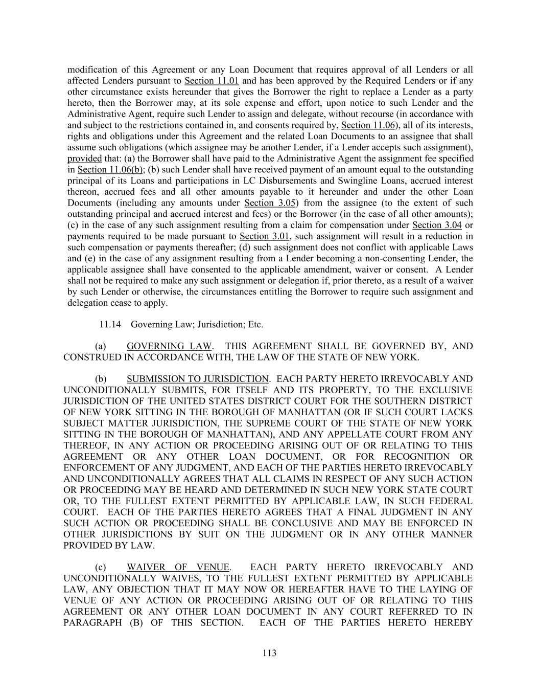 modification of this Agreement or any Loan Document that requires approval of all Lenders or all affected Lenders pursuant to Section 11.01 and has been approved by the Required Lenders or if any other circumstance exists hereunder that gives the Borrower the right to replace a Lender as a party hereto, then the Borrower may, at its sole expense and effort, upon notice to such Lender and the Administrative Agent, require such Lender to assign and delegate, without recourse (in accordance with and subject to the restrictions contained in, and consents required by, Section 11.06), all of its interests, rights and obligations under this Agreement and the related Loan Documents to an assignee that shall assume such obligations (which assignee may be another Lender, if a Lender accepts such assignment), provided that: (a) the Borrower shall have paid to the Administrative Agent the assignment fee specified in Section 11.06(b); (b) such Lender shall have received payment of an amount equal to the outstanding principal of its Loans and participations in LC Disbursements and Swingline Loans, accrued interest thereon, accrued fees and all other amounts payable to it hereunder and under the other Loan Documents (including any amounts under Section 3.05) from the assignee (to the extent of such outstanding principal and accrued interest and fees) or the Borrower (in the case of all other amounts); (c) in the case of any such assignment resulting from a claim for compensation under Section 3.04 or payments required to be made pursuant to Section 3.01, such assignment will result in a reduction in such compensation or payments thereafter; (d) such assignment does not conflict with applicable Laws and (e) in the case of any assignment resulting from a Lender becoming a non-consenting Lender, the applicable assignee shall have consented to the applicable amendment, waiver or consent. A Lender shall not be required to make any such assignment or delegation if, prior thereto, as a result of a waiver by such Lender or otherwise, the circumstances entitling the Borrower to require such assignment and delegation cease to apply. 11.14 Governing Law; Jurisdiction; Etc. (a) GOVERNING LAW. THIS AGREEMENT SHALL BE GOVERNED BY, AND CONSTRUED IN ACCORDANCE WITH, THE LAW OF THE STATE OF NEW YORK. (b) SUBMISSION TO JURISDICTION. EACH PARTY HERETO IRREVOCABLY AND UNCONDITIONALLY SUBMITS, FOR ITSELF AND ITS PROPERTY, TO THE EXCLUSIVE JURISDICTION OF THE UNITED STATES DISTRICT COURT FOR THE SOUTHERN DISTRICT OF NEW YORK SITTING IN THE BOROUGH OF MANHATTAN (OR IF SUCH COURT LACKS SUBJECT MATTER JURISDICTION, THE SUPREME COURT OF THE STATE OF NEW YORK SITTING IN THE BOROUGH OF MANHATTAN), AND ANY APPELLATE COURT FROM ANY THEREOF, IN ANY ACTION OR PROCEEDING ARISING OUT OF OR RELATING TO THIS AGREEMENT OR ANY OTHER LOAN DOCUMENT, OR FOR RECOGNITION OR ENFORCEMENT OF ANY JUDGMENT, AND EACH OF THE PARTIES HERETO IRREVOCABLY AND UNCONDITIONALLY AGREES THAT ALL CLAIMS IN RESPECT OF ANY SUCH ACTION OR PROCEEDING MAY BE HEARD AND DETERMINED IN SUCH NEW YORK STATE COURT OR, TO THE FULLEST EXTENT PERMITTED BY APPLICABLE LAW, IN SUCH FEDERAL COURT. EACH OF THE PARTIES HERETO AGREES THAT A FINAL JUDGMENT IN ANY SUCH ACTION OR PROCEEDING SHALL BE CONCLUSIVE AND MAY BE ENFORCED IN OTHER JURISDICTIONS BY SUIT ON THE JUDGMENT OR IN ANY OTHER MANNER PROVIDED BY LAW. (c) WAIVER OF VENUE. EACH PARTY HERETO IRREVOCABLY AND UNCONDITIONALLY WAIVES, TO THE FULLEST EXTENT PERMITTED BY APPLICABLE LAW, ANY OBJECTION THAT IT MAY NOW OR HEREAFTER HAVE TO THE LAYING OF VENUE OF ANY ACTION OR PROCEEDING ARISING OUT OF OR RELATING TO THIS AGREEMENT OR ANY OTHER LOAN DOCUMENT IN ANY COURT REFERRED TO IN PARAGRAPH (B) OF THIS SECTION. EACH OF THE PARTIES HERETO HEREBY 113