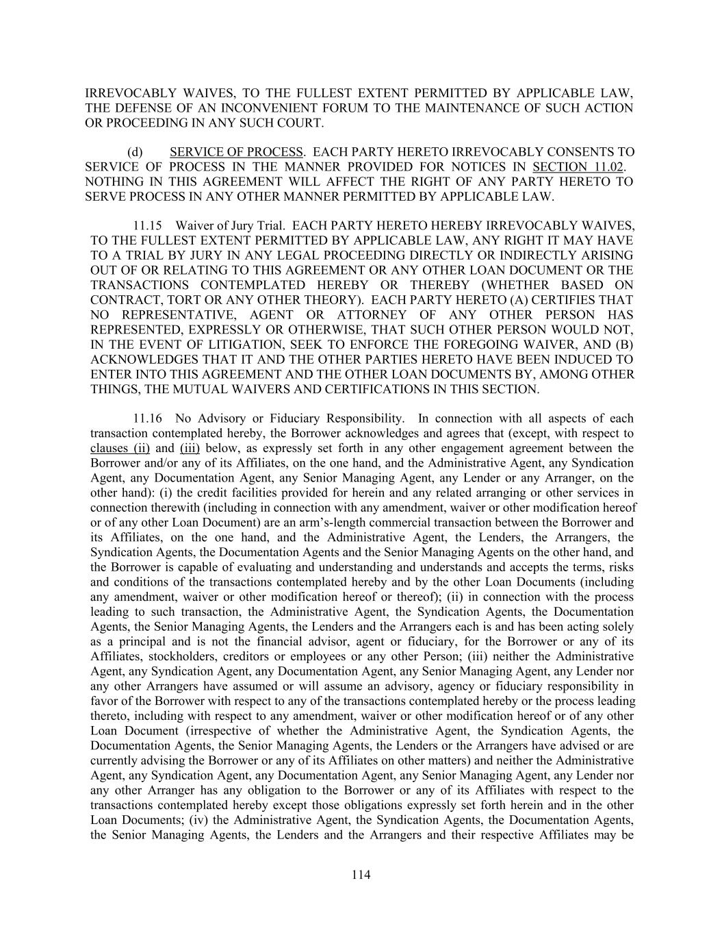 IRREVOCABLY WAIVES, TO THE FULLEST EXTENT PERMITTED BY APPLICABLE LAW, THE DEFENSE OF AN INCONVENIENT FORUM TO THE MAINTENANCE OF SUCH ACTION OR PROCEEDING IN ANY SUCH COURT. (d) SERVICE OF PROCESS. EACH PARTY HERETO IRREVOCABLY CONSENTS TO SERVICE OF PROCESS IN THE MANNER PROVIDED FOR NOTICES IN SECTION 11.02. NOTHING IN THIS AGREEMENT WILL AFFECT THE RIGHT OF ANY PARTY HERETO TO SERVE PROCESS IN ANY OTHER MANNER PERMITTED BY APPLICABLE LAW. 11.15 Waiver of Jury Trial. EACH PARTY HERETO HEREBY IRREVOCABLY WAIVES, TO THE FULLEST EXTENT PERMITTED BY APPLICABLE LAW, ANY RIGHT IT MAY HAVE TO A TRIAL BY JURY IN ANY LEGAL PROCEEDING DIRECTLY OR INDIRECTLY ARISING OUT OF OR RELATING TO THIS AGREEMENT OR ANY OTHER LOAN DOCUMENT OR THE TRANSACTIONS CONTEMPLATED HEREBY OR THEREBY (WHETHER BASED ON CONTRACT, TORT OR ANY OTHER THEORY). EACH PARTY HERETO (A) CERTIFIES THAT NO REPRESENTATIVE, AGENT OR ATTORNEY OF ANY OTHER PERSON HAS REPRESENTED, EXPRESSLY OR OTHERWISE, THAT SUCH OTHER PERSON WOULD NOT, IN THE EVENT OF LITIGATION, SEEK TO ENFORCE THE FOREGOING WAIVER, AND (B) ACKNOWLEDGES THAT IT AND THE OTHER PARTIES HERETO HAVE BEEN INDUCED TO ENTER INTO THIS AGREEMENT AND THE OTHER LOAN DOCUMENTS BY, AMONG OTHER THINGS, THE MUTUAL WAIVERS AND CERTIFICATIONS IN THIS SECTION. 11.16 No Advisory or Fiduciary Responsibility. In connection with all aspects of each transaction contemplated hereby, the Borrower acknowledges and agrees that (except, with respect to clauses (ii) and (iii) below, as expressly set forth in any other engagement agreement between the Borrower and/or any of its Affiliates, on the one hand, and the Administrative Agent, any Syndication Agent, any Documentation Agent, any Senior Managing Agent, any Lender or any Arranger, on the other hand): (i) the credit facilities provided for herein and any related arranging or other services in connection therewith (including in connection with any amendment, waiver or other modification hereof or of any other Loan Document) are an arm’s-length commercial transaction between the Borrower and its Affiliates, on the one hand, and the Administrative Agent, the Lenders, the Arrangers, the Syndication Agents, the Documentation Agents and the Senior Managing Agents on the other hand, and the Borrower is capable of evaluating and understanding and understands and accepts the terms, risks and conditions of the transactions contemplated hereby and by the other Loan Documents (including any amendment, waiver or other modification hereof or thereof); (ii) in connection with the process leading to such transaction, the Administrative Agent, the Syndication Agents, the Documentation Agents, the Senior Managing Agents, the Lenders and the Arrangers each is and has been acting solely as a principal and is not the financial advisor, agent or fiduciary, for the Borrower or any of its Affiliates, stockholders, creditors or employees or any other Person; (iii) neither the Administrative Agent, any Syndication Agent, any Documentation Agent, any Senior Managing Agent, any Lender nor any other Arrangers have assumed or will assume an advisory, agency or fiduciary responsibility in favor of the Borrower with respect to any of the transactions contemplated hereby or the process leading thereto, including with respect to any amendment, waiver or other modification hereof or of any other Loan Document (irrespective of whether the Administrative Agent, the Syndication Agents, the Documentation Agents, the Senior Managing Agents, the Lenders or the Arrangers have advised or are currently advising the Borrower or any of its Affiliates on other matters) and neither the Administrative Agent, any Syndication Agent, any Documentation Agent, any Senior Managing Agent, any Lender nor any other Arranger has any obligation to the Borrower or any of its Affiliates with respect to the transactions contemplated hereby except those obligations expressly set forth herein and in the other Loan Documents; (iv) the Administrative Agent, the Syndication Agents, the Documentation Agents, the Senior Managing Agents, the Lenders and the Arrangers and their respective Affiliates may be 114