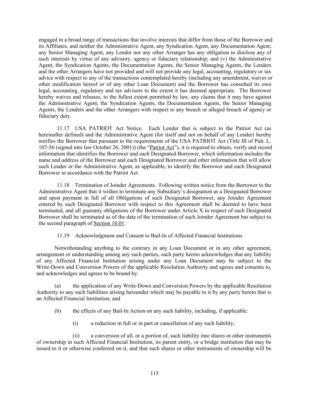 engaged in a broad range of transactions that involve interests that differ from those of the Borrower and its Affiliates, and neither the Administrative Agent, any Syndication Agent, any Documentation Agent, any Senior Managing Agent, any Lender nor any other Arranger has any obligation to disclose any of such interests by virtue of any advisory, agency or fiduciary relationship; and (v) the Administrative Agent, the Syndication Agents, the Documentation Agents, the Senior Managing Agents, the Lenders and the other Arrangers have not provided and will not provide any legal, accounting, regulatory or tax advice with respect to any of the transactions contemplated hereby (including any amendment, waiver or other modification hereof or of any other Loan Document) and the Borrower has consulted its own legal, accounting, regulatory and tax advisors to the extent it has deemed appropriate. The Borrower hereby waives and releases, to the fullest extent permitted by law, any claims that it may have against the Administrative Agent, the Syndication Agents, the Documentation Agents, the Senior Managing Agents, the Lenders and the other Arrangers with respect to any breach or alleged breach of agency or fiduciary duty. 11.17 USA PATRIOT Act Notice. Each Lender that is subject to the Patriot Act (as hereinafter defined) and the Administrative Agent (for itself and not on behalf of any Lender) hereby notifies the Borrower that pursuant to the requirements of the USA PATRIOT Act (Title III of Pub. L. 107-56 (signed into law October 26, 2001)) (the “Patriot Act”), it is required to obtain, verify and record information that identifies the Borrower and each Designated Borrower, which information includes the name and address of the Borrower and each Designated Borrower and other information that will allow such Lender or the Administrative Agent, as applicable, to identify the Borrower and each Designated Borrower in accordance with the Patriot Act. 11.18 Termination of Joinder Agreements. Following written notice from the Borrower to the Administrative Agent that it wishes to terminate any Subsidiary’s designation as a Designated Borrower and upon payment in full of all Obligations of such Designated Borrower, any Joinder Agreement entered by such Designated Borrower with respect to this Agreement shall be deemed to have been terminated, and all guaranty obligations of the Borrower under Article X in respect of such Designated Borrower shall be terminated as of the date of the termination of such Joinder Agreement but subject to the second paragraph of Section 10.01. 11.19 Acknowledgment and Consent to Bail-In of Affected Financial Institutions. Notwithstanding anything to the contrary in any Loan Document or in any other agreement, arrangement or understanding among any such parties, each party hereto acknowledges that any liability of any Affected Financial Institution arising under any Loan Document may be subject to the Write-Down and Conversion Powers of the applicable Resolution Authority and agrees and consents to, and acknowledges and agrees to be bound by: (a) the application of any Write-Down and Conversion Powers by the applicable Resolution Authority to any such liabilities arising hereunder which may be payable to it by any party hereto that is an Affected Financial Institution; and (b) the effects of any Bail-In Action on any such liability, including, if applicable: (i) a reduction in full or in part or cancellation of any such liability; (ii) a conversion of all, or a portion of, such liability into shares or other instruments of ownership in such Affected Financial Institution, its parent entity, or a bridge institution that may be issued to it or otherwise conferred on it, and that such shares or other instruments of ownership will be 115
