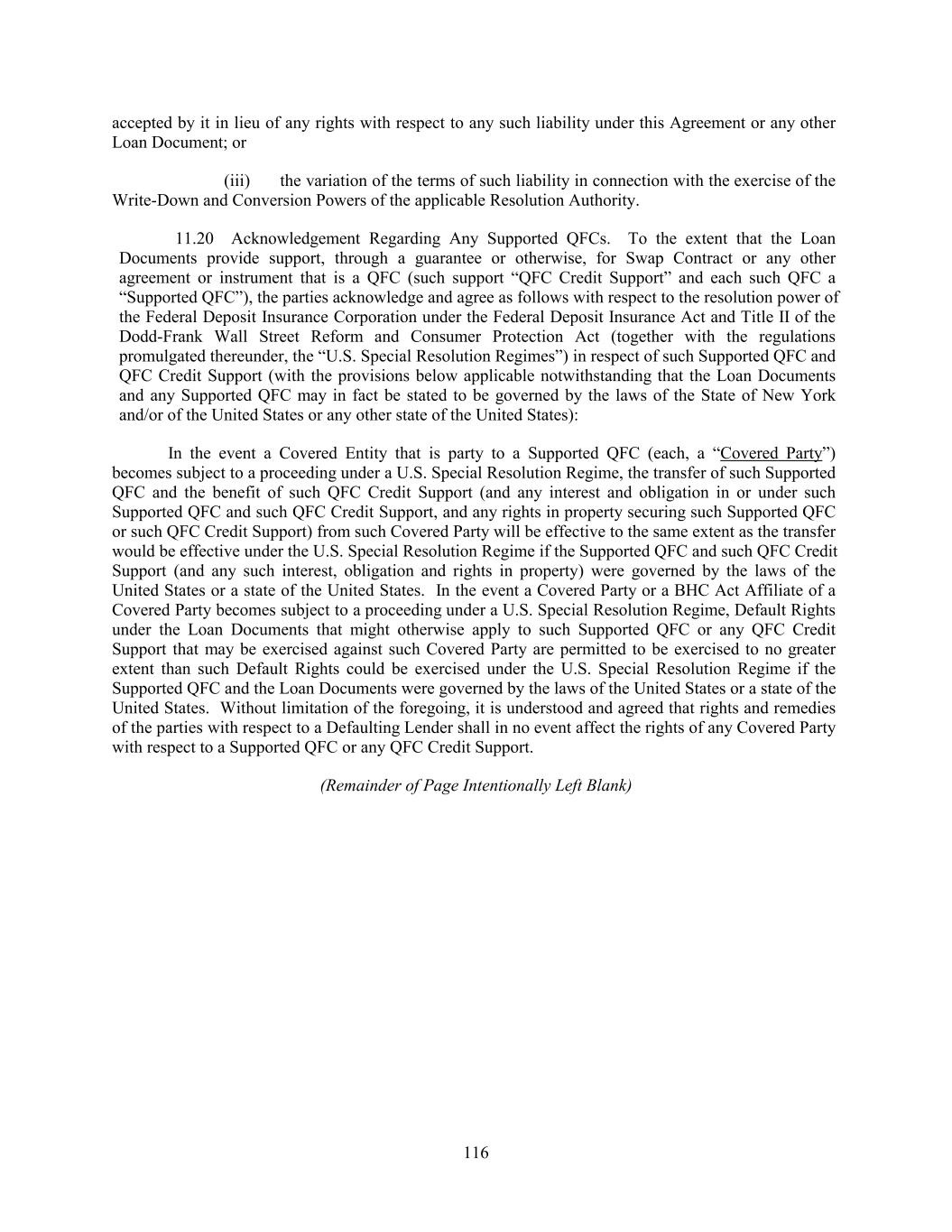 accepted by it in lieu of any rights with respect to any such liability under this Agreement or any other Loan Document; or (iii) the variation of the terms of such liability in connection with the exercise of the Write-Down and Conversion Powers of the applicable Resolution Authority. 11.20 Acknowledgement Regarding Any Supported QFCs. To the extent that the Loan Documents provide support, through a guarantee or otherwise, for Swap Contract or any other agreement or instrument that is a QFC (such support “QFC Credit Support” and each such QFC a “Supported QFC”), the parties acknowledge and agree as follows with respect to the resolution power of the Federal Deposit Insurance Corporation under the Federal Deposit Insurance Act and Title II of the Dodd-Frank Wall Street Reform and Consumer Protection Act (together with the regulations promulgated thereunder, the “U.S. Special Resolution Regimes”) in respect of such Supported QFC and QFC Credit Support (with the provisions below applicable notwithstanding that the Loan Documents and any Supported QFC may in fact be stated to be governed by the laws of the State of New York and/or of the United States or any other state of the United States): In the event a Covered Entity that is party to a Supported QFC (each, a “Covered Party”) becomes subject to a proceeding under a U.S. Special Resolution Regime, the transfer of such Supported QFC and the benefit of such QFC Credit Support (and any interest and obligation in or under such Supported QFC and such QFC Credit Support, and any rights in property securing such Supported QFC or such QFC Credit Support) from such Covered Party will be effective to the same extent as the transfer would be effective under the U.S. Special Resolution Regime if the Supported QFC and such QFC Credit Support (and any such interest, obligation and rights in property) were governed by the laws of the United States or a state of the United States. In the event a Covered Party or a BHC Act Affiliate of a Covered Party becomes subject to a proceeding under a U.S. Special Resolution Regime, Default Rights under the Loan Documents that might otherwise apply to such Supported QFC or any QFC Credit Support that may be exercised against such Covered Party are permitted to be exercised to no greater extent than such Default Rights could be exercised under the U.S. Special Resolution Regime if the Supported QFC and the Loan Documents were governed by the laws of the United States or a state of the United States. Without limitation of the foregoing, it is understood and agreed that rights and remedies of the parties with respect to a Defaulting Lender shall in no event affect the rights of any Covered Party with respect to a Supported QFC or any QFC Credit Support. (Remainder of Page Intentionally Left Blank) 116