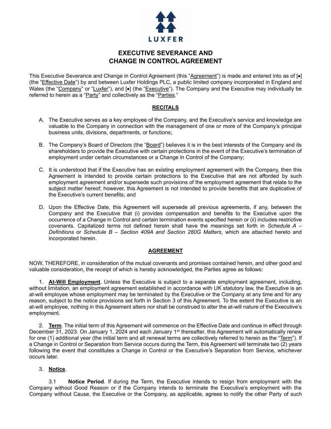 EXECUTIVE SEVERANCE AND CHANGE IN CONTROL AGREEMENT This Executive Severance and Change in Control Agreement (this “Agreement”) is made and entered into as of [•] (the “Effective Date”) by and between Luxfer Holdings PLC, a public limited company incorporated in England and Wales (the “Company” or “Luxfer”), and [•] (the “Executive”). The Company and the Executive may individually be referred to herein as a “Party” and collectively as the “Parties.” RECITALS A. The Executive serves as a key employee of the Company, and the Executive’s service and knowledge are valuable to the Company in connection with the management of one or more of the Company’s principal business units, divisions, departments, or functions; B. The Company’s Board of Directors (the “Board”) believes it is in the best interests of the Company and its shareholders to provide the Executive with certain protections in the event of the Executive’s termination of employment under certain circumstances or a Change in Control of the Company; C. It is understood that if the Executive has an existing employment agreement with the Company, then this Agreement is intended to provide certain protections to the Executive that are not afforded by such employment agreement and/or supersede such provisions of the employment agreement that relate to the subject matter hereof; however, this Agreement is not intended to provide benefits that are duplicative of the Executive’s current benefits; and D. Upon the Effective Date, this Agreement will supersede all previous agreements, if any, between the Company and the Executive that (i) provides compensation and benefits to the Executive upon the occurrence of a Change in Control and certain termination events specified herein or (ii) includes restrictive covenants. Capitalized terms not defined herein shall have the meanings set forth in Schedule A – Definitions or Schedule B – Section 409A and Section 280G Matters, which are attached hereto and incorporated herein. AGREEMENT NOW, THEREFORE, in consideration of the mutual covenants and promises contained herein, and other good and valuable consideration, the receipt of which is hereby acknowledged, the Parties agree as follows: 1. At-Will Employment. Unless the Executive is subject to a separate employment agreement, including, without limitation, an employment agreement established in accordance with UK statutory law, the Executive is an at-will employee whose employment may be terminated by the Executive or the Company at any time and for any reason, subject to the notice provisions set forth in Section 3 of this Agreement. To the extent the Executive is an at-will employee, nothing in this Agreement alters nor shall be construed to alter the at-will nature of the Executive’s employment. 2. Term. The initial term of this Agreement will commence on the Effective Date and continue in effect through December 31, 2023. On January 1, 2024 and each January 1st thereafter, this Agreement will automatically renew for one (1) additional year (the initial term and all renewal terms are collectively referred to herein as the “Term”). If a Change in Control or Separation from Service occurs during the Term, this Agreement will terminate two (2) years following the event that constitutes a Change in Control or the Executive’s Separation from Service, whichever occurs later. 3. Notice. 3.1 Notice Period. If during the Term, the Executive intends to resign from employment with the Company without Good Reason or if the Company intends to terminate the Executive’s employment with the Company without Cause, the Executive or the Company, as applicable, agrees to notify the other Party of such