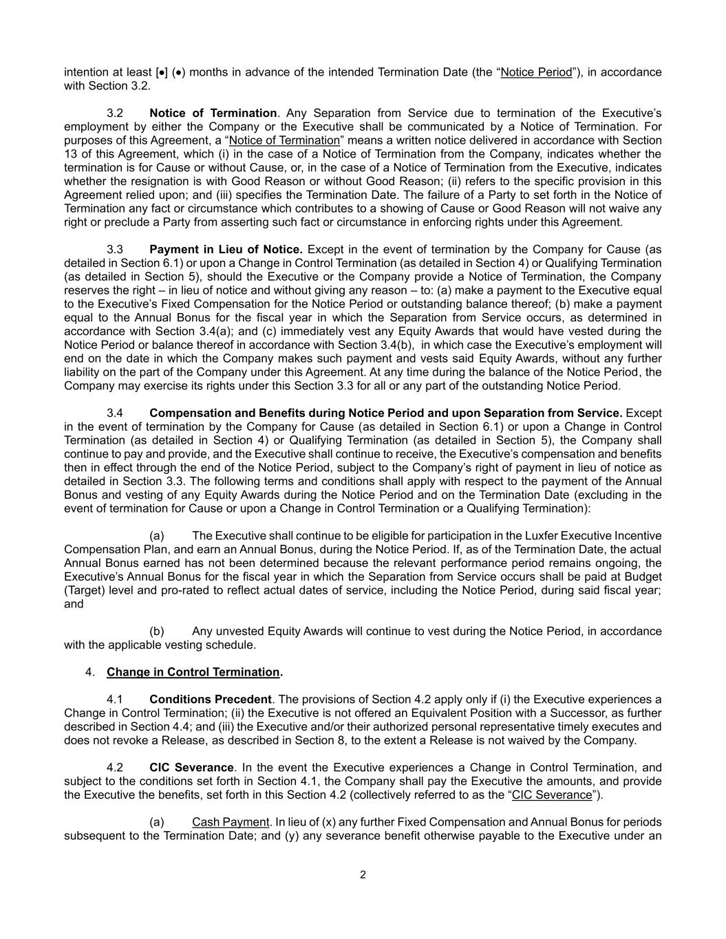 2 intention at least [•] (•) months in advance of the intended Termination Date (the “Notice Period”), in accordance with Section 3.2. 3.2 Notice of Termination. Any Separation from Service due to termination of the Executive’s employment by either the Company or the Executive shall be communicated by a Notice of Termination. For purposes of this Agreement, a “Notice of Termination” means a written notice delivered in accordance with Section 13 of this Agreement, which (i) in the case of a Notice of Termination from the Company, indicates whether the termination is for Cause or without Cause, or, in the case of a Notice of Termination from the Executive, indicates whether the resignation is with Good Reason or without Good Reason; (ii) refers to the specific provision in this Agreement relied upon; and (iii) specifies the Termination Date. The failure of a Party to set forth in the Notice of Termination any fact or circumstance which contributes to a showing of Cause or Good Reason will not waive any right or preclude a Party from asserting such fact or circumstance in enforcing rights under this Agreement. 3.3 Payment in Lieu of Notice. Except in the event of termination by the Company for Cause (as detailed in Section 6.1) or upon a Change in Control Termination (as detailed in Section 4) or Qualifying Termination (as detailed in Section 5), should the Executive or the Company provide a Notice of Termination, the Company reserves the right – in lieu of notice and without giving any reason – to: (a) make a payment to the Executive equal to the Executive’s Fixed Compensation for the Notice Period or outstanding balance thereof; (b) make a payment equal to the Annual Bonus for the fiscal year in which the Separation from Service occurs, as determined in accordance with Section 3.4(a); and (c) immediately vest any Equity Awards that would have vested during the Notice Period or balance thereof in accordance with Section 3.4(b), in which case the Executive’s employment will end on the date in which the Company makes such payment and vests said Equity Awards, without any further liability on the part of the Company under this Agreement. At any time during the balance of the Notice Period, the Company may exercise its rights under this Section 3.3 for all or any part of the outstanding Notice Period. 3.4 Compensation and Benefits during Notice Period and upon Separation from Service. Except in the event of termination by the Company for Cause (as detailed in Section 6.1) or upon a Change in Control Termination (as detailed in Section 4) or Qualifying Termination (as detailed in Section 5), the Company shall continue to pay and provide, and the Executive shall continue to receive, the Executive’s compensation and benefits then in effect through the end of the Notice Period, subject to the Company’s right of payment in lieu of notice as detailed in Section 3.3. The following terms and conditions shall apply with respect to the payment of the Annual Bonus and vesting of any Equity Awards during the Notice Period and on the Termination Date (excluding in the event of termination for Cause or upon a Change in Control Termination or a Qualifying Termination): (a) The Executive shall continue to be eligible for participation in the Luxfer Executive Incentive Compensation Plan, and earn an Annual Bonus, during the Notice Period. If, as of the Termination Date, the actual Annual Bonus earned has not been determined because the relevant performance period remains ongoing, the Executive’s Annual Bonus for the fiscal year in which the Separation from Service occurs shall be paid at Budget (Target) level and pro-rated to reflect actual dates of service, including the Notice Period, during said fiscal year; and (b) Any unvested Equity Awards will continue to vest during the Notice Period, in accordance with the applicable vesting schedule. 4. Change in Control Termination. 4.1 Conditions Precedent. The provisions of Section 4.2 apply only if (i) the Executive experiences a Change in Control Termination; (ii) the Executive is not offered an Equivalent Position with a Successor, as further described in Section 4.4; and (iii) the Executive and/or their authorized personal representative timely executes and does not revoke a Release, as described in Section 8, to the extent a Release is not waived by the Company. 4.2 CIC Severance. In the event the Executive experiences a Change in Control Termination, and subject to the conditions set forth in Section 4.1, the Company shall pay the Executive the amounts, and provide the Executive the benefits, set forth in this Section 4.2 (collectively referred to as the “CIC Severance”). (a) Cash Payment. In lieu of (x) any further Fixed Compensation and Annual Bonus for periods subsequent to the Termination Date; and (y) any severance benefit otherwise payable to the Executive under an