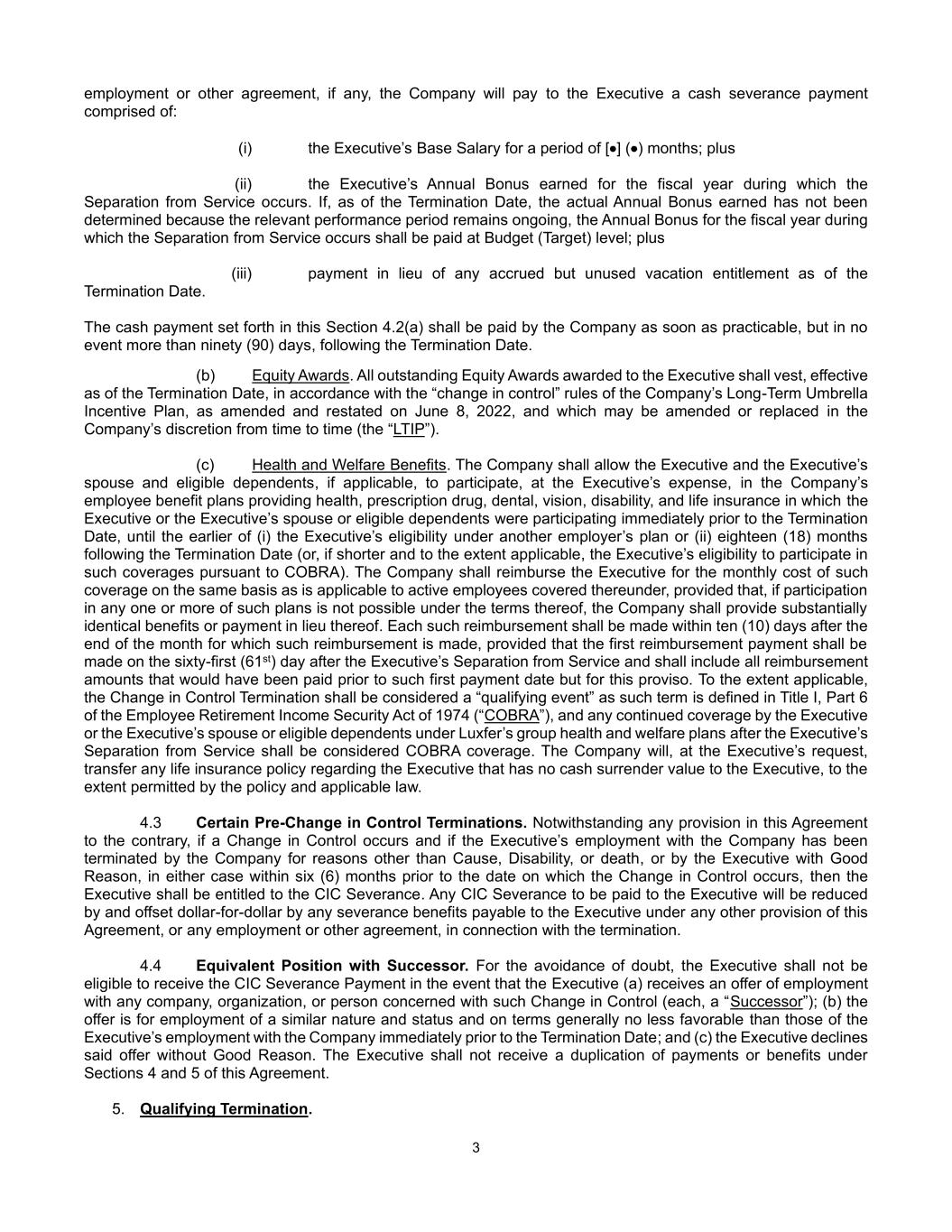 3 employment or other agreement, if any, the Company will pay to the Executive a cash severance payment comprised of: (i) the Executive’s Base Salary for a period of [•] (•) months; plus (ii) the Executive’s Annual Bonus earned for the fiscal year during which the Separation from Service occurs. If, as of the Termination Date, the actual Annual Bonus earned has not been determined because the relevant performance period remains ongoing, the Annual Bonus for the fiscal year during which the Separation from Service occurs shall be paid at Budget (Target) level; plus (iii) payment in lieu of any accrued but unused vacation entitlement as of the Termination Date. The cash payment set forth in this Section 4.2(a) shall be paid by the Company as soon as practicable, but in no event more than ninety (90) days, following the Termination Date. (b) Equity Awards. All outstanding Equity Awards awarded to the Executive shall vest, effective as of the Termination Date, in accordance with the “change in control” rules of the Company’s Long-Term Umbrella Incentive Plan, as amended and restated on June 8, 2022, and which may be amended or replaced in the Company’s discretion from time to time (the “LTIP”). (c) Health and Welfare Benefits. The Company shall allow the Executive and the Executive’s spouse and eligible dependents, if applicable, to participate, at the Executive’s expense, in the Company’s employee benefit plans providing health, prescription drug, dental, vision, disability, and life insurance in which the Executive or the Executive’s spouse or eligible dependents were participating immediately prior to the Termination Date, until the earlier of (i) the Executive’s eligibility under another employer’s plan or (ii) eighteen (18) months following the Termination Date (or, if shorter and to the extent applicable, the Executive’s eligibility to participate in such coverages pursuant to COBRA). The Company shall reimburse the Executive for the monthly cost of such coverage on the same basis as is applicable to active employees covered thereunder, provided that, if participation in any one or more of such plans is not possible under the terms thereof, the Company shall provide substantially identical benefits or payment in lieu thereof. Each such reimbursement shall be made within ten (10) days after the end of the month for which such reimbursement is made, provided that the first reimbursement payment shall be made on the sixty-first (61st) day after the Executive’s Separation from Service and shall include all reimbursement amounts that would have been paid prior to such first payment date but for this proviso. To the extent applicable, the Change in Control Termination shall be considered a “qualifying event” as such term is defined in Title I, Part 6 of the Employee Retirement Income Security Act of 1974 (“COBRA”), and any continued coverage by the Executive or the Executive’s spouse or eligible dependents under Luxfer’s group health and welfare plans after the Executive’s Separation from Service shall be considered COBRA coverage. The Company will, at the Executive’s request, transfer any life insurance policy regarding the Executive that has no cash surrender value to the Executive, to the extent permitted by the policy and applicable law. 4.3 Certain Pre-Change in Control Terminations. Notwithstanding any provision in this Agreement to the contrary, if a Change in Control occurs and if the Executive’s employment with the Company has been terminated by the Company for reasons other than Cause, Disability, or death, or by the Executive with Good Reason, in either case within six (6) months prior to the date on which the Change in Control occurs, then the Executive shall be entitled to the CIC Severance. Any CIC Severance to be paid to the Executive will be reduced by and offset dollar-for-dollar by any severance benefits payable to the Executive under any other provision of this Agreement, or any employment or other agreement, in connection with the termination. 4.4 Equivalent Position with Successor. For the avoidance of doubt, the Executive shall not be eligible to receive the CIC Severance Payment in the event that the Executive (a) receives an offer of employment with any company, organization, or person concerned with such Change in Control (each, a “Successor”); (b) the offer is for employment of a similar nature and status and on terms generally no less favorable than those of the Executive’s employment with the Company immediately prior to the Termination Date; and (c) the Executive declines said offer without Good Reason. The Executive shall not receive a duplication of payments or benefits under Sections 4 and 5 of this Agreement. 5. Qualifying Termination.