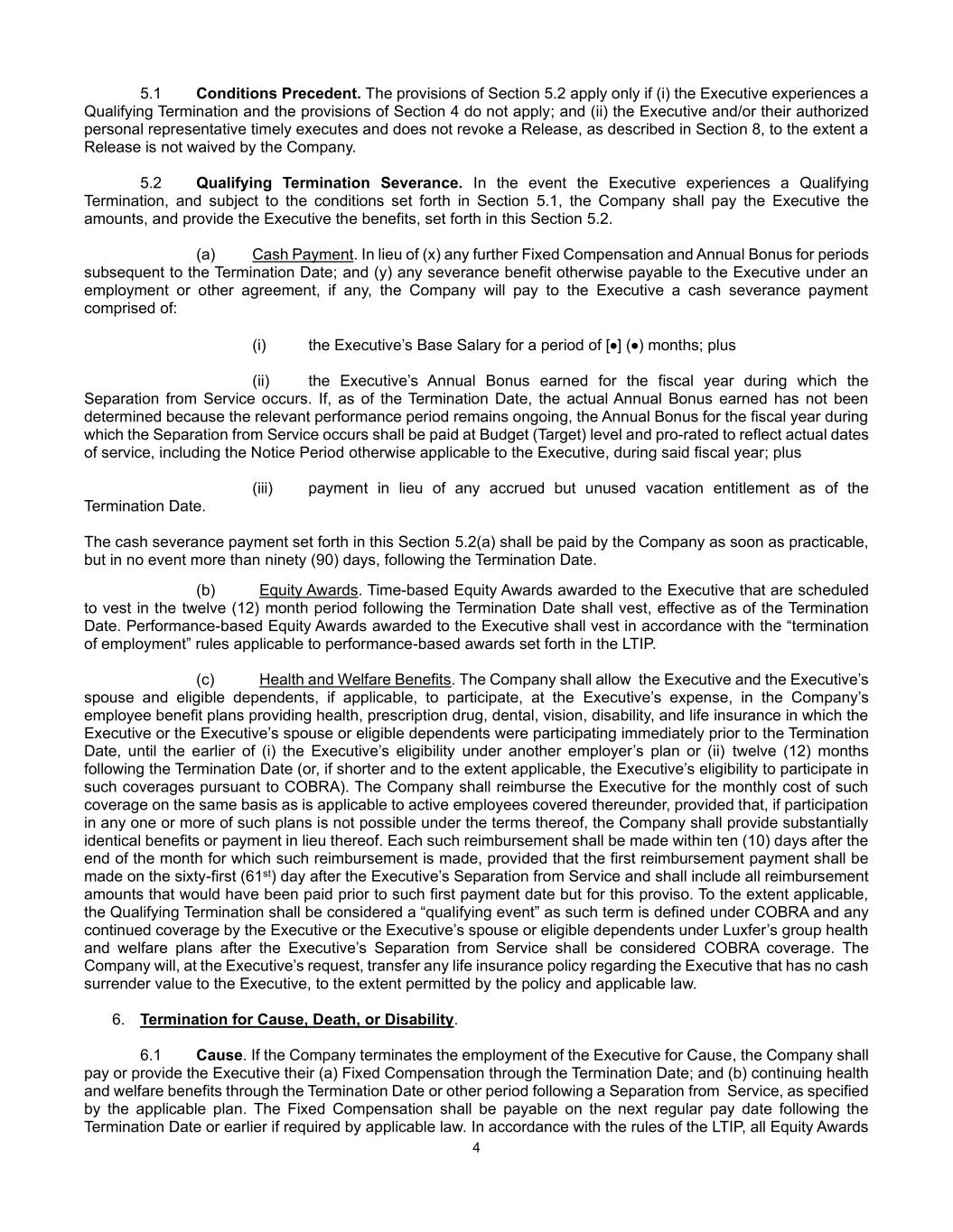 4 5.1 Conditions Precedent. The provisions of Section 5.2 apply only if (i) the Executive experiences a Qualifying Termination and the provisions of Section 4 do not apply; and (ii) the Executive and/or their authorized personal representative timely executes and does not revoke a Release, as described in Section 8, to the extent a Release is not waived by the Company. 5.2 Qualifying Termination Severance. In the event the Executive experiences a Qualifying Termination, and subject to the conditions set forth in Section 5.1, the Company shall pay the Executive the amounts, and provide the Executive the benefits, set forth in this Section 5.2. (a) Cash Payment. In lieu of (x) any further Fixed Compensation and Annual Bonus for periods subsequent to the Termination Date; and (y) any severance benefit otherwise payable to the Executive under an employment or other agreement, if any, the Company will pay to the Executive a cash severance payment comprised of: (i) the Executive’s Base Salary for a period of [•] (•) months; plus (ii) the Executive’s Annual Bonus earned for the fiscal year during which the Separation from Service occurs. If, as of the Termination Date, the actual Annual Bonus earned has not been determined because the relevant performance period remains ongoing, the Annual Bonus for the fiscal year during which the Separation from Service occurs shall be paid at Budget (Target) level and pro-rated to reflect actual dates of service, including the Notice Period otherwise applicable to the Executive, during said fiscal year; plus (iii) payment in lieu of any accrued but unused vacation entitlement as of the Termination Date. The cash severance payment set forth in this Section 5.2(a) shall be paid by the Company as soon as practicable, but in no event more than ninety (90) days, following the Termination Date. (b) Equity Awards. Time-based Equity Awards awarded to the Executive that are scheduled to vest in the twelve (12) month period following the Termination Date shall vest, effective as of the Termination Date. Performance-based Equity Awards awarded to the Executive shall vest in accordance with the “termination of employment” rules applicable to performance-based awards set forth in the LTIP. (c) Health and Welfare Benefits. The Company shall allow the Executive and the Executive’s spouse and eligible dependents, if applicable, to participate, at the Executive’s expense, in the Company’s employee benefit plans providing health, prescription drug, dental, vision, disability, and life insurance in which the Executive or the Executive’s spouse or eligible dependents were participating immediately prior to the Termination Date, until the earlier of (i) the Executive’s eligibility under another employer’s plan or (ii) twelve (12) months following the Termination Date (or, if shorter and to the extent applicable, the Executive’s eligibility to participate in such coverages pursuant to COBRA). The Company shall reimburse the Executive for the monthly cost of such coverage on the same basis as is applicable to active employees covered thereunder, provided that, if participation in any one or more of such plans is not possible under the terms thereof, the Company shall provide substantially identical benefits or payment in lieu thereof. Each such reimbursement shall be made within ten (10) days after the end of the month for which such reimbursement is made, provided that the first reimbursement payment shall be made on the sixty-first (61st) day after the Executive’s Separation from Service and shall include all reimbursement amounts that would have been paid prior to such first payment date but for this proviso. To the extent applicable, the Qualifying Termination shall be considered a “qualifying event” as such term is defined under COBRA and any continued coverage by the Executive or the Executive’s spouse or eligible dependents under Luxfer’s group health and welfare plans after the Executive’s Separation from Service shall be considered COBRA coverage. The Company will, at the Executive’s request, transfer any life insurance policy regarding the Executive that has no cash surrender value to the Executive, to the extent permitted by the policy and applicable law. 6. Termination for Cause, Death, or Disability. 6.1 Cause. If the Company terminates the employment of the Executive for Cause, the Company shall pay or provide the Executive their (a) Fixed Compensation through the Termination Date; and (b) continuing health and welfare benefits through the Termination Date or other period following a Separation from Service, as specified by the applicable plan. The Fixed Compensation shall be payable on the next regular pay date following the Termination Date or earlier if required by applicable law. In accordance with the rules of the LTIP, all Equity Awards