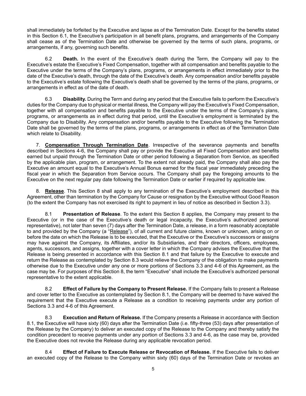 5 shall immediately be forfeited by the Executive and lapse as of the Termination Date. Except for the benefits stated in this Section 6.1, the Executive’s participation in all benefit plans, programs, and arrangements of the Company shall cease as of the Termination Date and otherwise be governed by the terms of such plans, programs, or arrangements, if any, governing such benefits. 6.2 Death. In the event of the Executive’s death during the Term, the Company will pay to the Executive’s estate the Executive’s Fixed Compensation, together with all compensation and benefits payable to the Executive under the terms of the Company’s plans, programs, or arrangements in effect immediately prior to the date of the Executive’s death, through the date of the Executive’s death. Any compensation and/or benefits payable to the Executive’s estate following the Executive’s death shall be governed by the terms of the plans, programs, or arrangements in effect as of the date of death. 6.3 Disability. During the Term and during any period that the Executive fails to perform the Executive’s duties for the Company due to physical or mental illness, the Company will pay the Executive’s Fixed Compensation, together with all compensation and benefits payable to the Executive under the terms of the Company’s plans, programs, or arrangements as in effect during that period, until the Executive’s employment is terminated by the Company due to Disability. Any compensation and/or benefits payable to the Executive following the Termination Date shall be governed by the terms of the plans, programs, or arrangements in effect as of the Termination Date which relate to Disability. 7. Compensation Through Termination Date. Irrespective of the severance payments and benefits described in Sections 4-6, the Company shall pay or provide the Executive all Fixed Compensation and benefits earned but unpaid through the Termination Date or other period following a Separation from Service, as specified by the applicable plan, program, or arrangement. To the extent not already paid, the Company shall also pay the Executive an amount equal to the Executive’s Annual Bonus earned for the fiscal year immediately preceding the fiscal year in which the Separation from Service occurs. The Company shall pay the foregoing amounts to the Executive on the next regular pay date following the Termination Date or earlier if required by applicable law. 8. Release. This Section 8 shall apply to any termination of the Executive’s employment described in this Agreement, other than termination by the Company for Cause or resignation by the Executive without Good Reason (to the extent the Company has not exercised its right to payment in lieu of notice as described in Section 3.3). 8.1 Presentation of Release. To the extent this Section 8 applies, the Company may present to the Executive (or in the case of the Executive’s death or legal incapacity, the Executive’s authorized personal representative), not later than seven (7) days after the Termination Date, a release, in a form reasonably acceptable to and provided by the Company (a “Release”), of all current and future claims, known or unknown, arising on or before the date on which the Release is to be executed, that the Executive or the Executive’s successors or assigns may have against the Company, its Affiliates, and/or its Subsidiaries, and their directors, officers, employees, agents, successors, and assigns, together with a cover letter in which the Company advises the Executive that the Release is being presented in accordance with this Section 8.1 and that failure by the Executive to execute and return the Release as contemplated by Section 8.3 would relieve the Company of the obligation to make payments otherwise due to the Executive under any one or more portions of Sections 3.3 and 4-6 of this Agreement, as the case may be. For purposes of this Section 8, the term “Executive” shall include the Executive’s authorized personal representative to the extent applicable. 8.2 Effect of Failure by the Company to Present Release. If the Company fails to present a Release and cover letter to the Executive as contemplated by Section 8.1, the Company will be deemed to have waived the requirement that the Executive execute a Release as a condition to receiving payments under any portion of Sections 3.3 and 4-6 of this Agreement. 8.3 Execution and Return of Release. If the Company presents a Release in accordance with Section 8.1, the Executive will have sixty (60) days after the Termination Date (i.e. fifty-three (53) days after presentation of the Release by the Company) to deliver an executed copy of the Release to the Company and thereby satisfy the condition precedent to receive payments under any portion of Sections 3.3 and 4-6, as the case may be, provided the Executive does not revoke the Release during any applicable revocation period. 8.4 Effect of Failure to Execute Release or Revocation of Release. If the Executive fails to deliver an executed copy of the Release to the Company within sixty (60) days of the Termination Date or revokes an