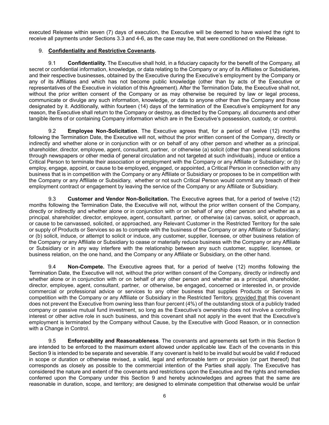 6 executed Release within seven (7) days of execution, the Executive will be deemed to have waived the right to receive all payments under Sections 3.3 and 4-6, as the case may be, that were conditioned on the Release. 9. Confidentiality and Restrictive Covenants. 9.1 Confidentiality. The Executive shall hold, in a fiduciary capacity for the benefit of the Company, all secret or confidential information, knowledge, or data relating to the Company or any of its Affiliates or Subsidiaries, and their respective businesses, obtained by the Executive during the Executive’s employment by the Company or any of its Affiliates and which has not become public knowledge (other than by acts of the Executive or representatives of the Executive in violation of this Agreement). After the Termination Date, the Executive shall not, without the prior written consent of the Company or as may otherwise be required by law or legal process, communicate or divulge any such information, knowledge, or data to anyone other than the Company and those designated by it. Additionally, within fourteen (14) days of the termination of the Executive’s employment for any reason, the Executive shall return to the Company or destroy, as directed by the Company, all documents and other tangible items of or containing Company information which are in the Executive’s possession, custody, or control. 9.2 Employee Non-Solicitation. The Executive agrees that, for a period of twelve (12) months following the Termination Date, the Executive will not, without the prior written consent of the Company, directly or indirectly and whether alone or in conjunction with or on behalf of any other person and whether as a principal, shareholder, director, employee, agent, consultant, partner, or otherwise (a) solicit (other than general solicitations through newspapers or other media of general circulation and not targeted at such individuals), induce or entice a Critical Person to terminate their association or employment with the Company or any Affiliate or Subsidiary; or (b) employ, engage, appoint, or cause to be employed, engaged, or appointed, a Critical Person in connection with any business that is in competition with the Company or any Affiliate or Subsidiary or proposes to be in competition with the Company or any Affiliate or Subsidiary, whether or not such Critical Person would commit any breach of their employment contract or engagement by leaving the service of the Company or any Affiliate or Subsidiary. 9.3 Customer and Vendor Non-Solicitation. The Executive agrees that, for a period of twelve (12) months following the Termination Date, the Executive will not, without the prior written consent of the Company, directly or indirectly and whether alone or in conjunction with or on behalf of any other person and whether as a principal, shareholder, director, employee, agent, consultant, partner, or otherwise (a) canvas, solicit, or approach, or cause to be canvassed, solicited, or approached, any Relevant Customer in the Restricted Territory for the sale or supply of Products or Services so as to compete with the business of the Company or any Affiliate or Subsidiary; or (b) solicit, induce, or attempt to solicit or induce, any customer, supplier, licensee, or other business relation of the Company or any Affiliate or Subsidiary to cease or materially reduce business with the Company or any Affiliate or Subsidiary or in any way interfere with the relationship between any such customer, supplier, licensee, or business relation, on the one hand, and the Company or any Affiliate or Subsidiary, on the other hand. 9.4 Non-Compete. The Executive agrees that, for a period of twelve (12) months following the Termination Date, the Executive will not, without the prior written consent of the Company, directly or indirectly and whether alone or in conjunction with or on behalf of any other person and whether as a principal, shareholder, director, employee, agent, consultant, partner, or otherwise, be engaged, concerned or interested in, or provide commercial or professional advice or services to any other business that supplies Products or Services in competition with the Company or any Affiliate or Subsidiary in the Restricted Territory, provided that this covenant does not prevent the Executive from owning less than four percent (4%) of the outstanding stock of a publicly traded company or passive mutual fund investment, so long as the Executive’s ownership does not involve a controlling interest or other active role in such business, and this covenant shall not apply in the event that the Executive’s employment is terminated by the Company without Cause, by the Executive with Good Reason, or in connection with a Change in Control. 9.5 Enforceability and Reasonableness. The covenants and agreements set forth in this Section 9 are intended to be enforced to the maximum extent allowed under applicable law. Each of the covenants in this Section 9 is intended to be separate and severable. If any covenant is held to be invalid but would be valid if reduced in scope or duration or otherwise revised, a valid, legal and enforceable term or provision (or part thereof) that corresponds as closely as possible to the commercial intention of the Parties shall apply. The Executive has considered the nature and extent of the covenants and restrictions upon the Executive and the rights and remedies conferred upon the Company under this Section 9 and hereby acknowledges and agrees that the same are reasonable in duration, scope, and territory; are designed to eliminate competition that otherwise would be unfair
