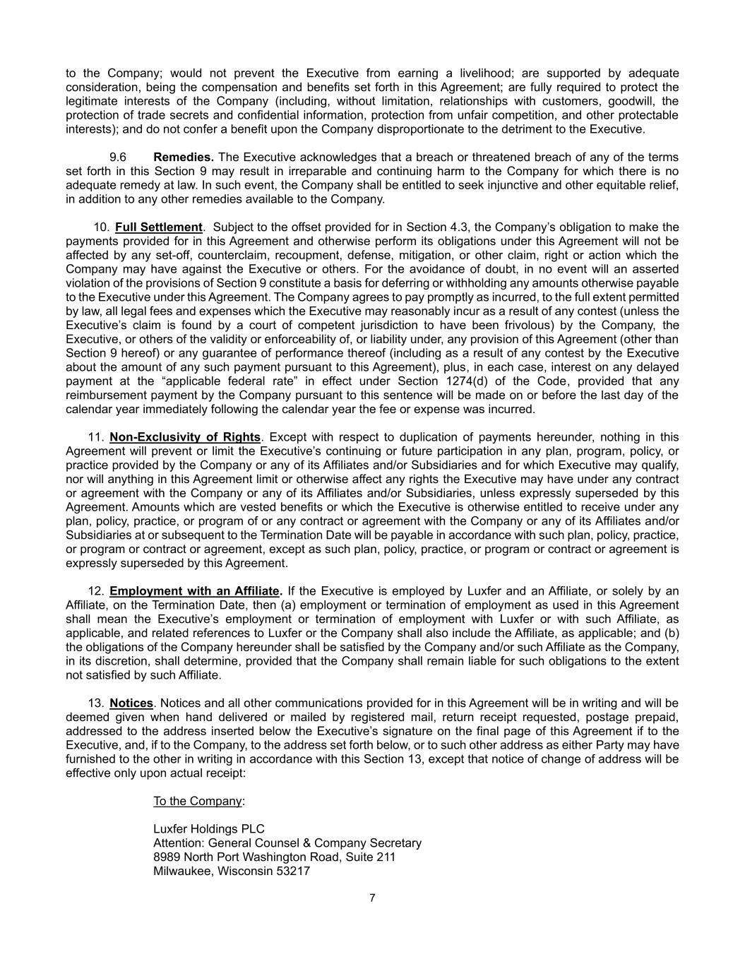 7 to the Company; would not prevent the Executive from earning a livelihood; are supported by adequate consideration, being the compensation and benefits set forth in this Agreement; are fully required to protect the legitimate interests of the Company (including, without limitation, relationships with customers, goodwill, the protection of trade secrets and confidential information, protection from unfair competition, and other protectable interests); and do not confer a benefit upon the Company disproportionate to the detriment to the Executive. 9.6 Remedies. The Executive acknowledges that a breach or threatened breach of any of the terms set forth in this Section 9 may result in irreparable and continuing harm to the Company for which there is no adequate remedy at law. In such event, the Company shall be entitled to seek injunctive and other equitable relief, in addition to any other remedies available to the Company. 10. Full Settlement. Subject to the offset provided for in Section 4.3, the Company’s obligation to make the payments provided for in this Agreement and otherwise perform its obligations under this Agreement will not be affected by any set-off, counterclaim, recoupment, defense, mitigation, or other claim, right or action which the Company may have against the Executive or others. For the avoidance of doubt, in no event will an asserted violation of the provisions of Section 9 constitute a basis for deferring or withholding any amounts otherwise payable to the Executive under this Agreement. The Company agrees to pay promptly as incurred, to the full extent permitted by law, all legal fees and expenses which the Executive may reasonably incur as a result of any contest (unless the Executive’s claim is found by a court of competent jurisdiction to have been frivolous) by the Company, the Executive, or others of the validity or enforceability of, or liability under, any provision of this Agreement (other than Section 9 hereof) or any guarantee of performance thereof (including as a result of any contest by the Executive about the amount of any such payment pursuant to this Agreement), plus, in each case, interest on any delayed payment at the “applicable federal rate” in effect under Section 1274(d) of the Code, provided that any reimbursement payment by the Company pursuant to this sentence will be made on or before the last day of the calendar year immediately following the calendar year the fee or expense was incurred. 11. Non-Exclusivity of Rights. Except with respect to duplication of payments hereunder, nothing in this Agreement will prevent or limit the Executive’s continuing or future participation in any plan, program, policy, or practice provided by the Company or any of its Affiliates and/or Subsidiaries and for which Executive may qualify, nor will anything in this Agreement limit or otherwise affect any rights the Executive may have under any contract or agreement with the Company or any of its Affiliates and/or Subsidiaries, unless expressly superseded by this Agreement. Amounts which are vested benefits or which the Executive is otherwise entitled to receive under any plan, policy, practice, or program of or any contract or agreement with the Company or any of its Affiliates and/or Subsidiaries at or subsequent to the Termination Date will be payable in accordance with such plan, policy, practice, or program or contract or agreement, except as such plan, policy, practice, or program or contract or agreement is expressly superseded by this Agreement. 12. Employment with an Affiliate. If the Executive is employed by Luxfer and an Affiliate, or solely by an Affiliate, on the Termination Date, then (a) employment or termination of employment as used in this Agreement shall mean the Executive’s employment or termination of employment with Luxfer or with such Affiliate, as applicable, and related references to Luxfer or the Company shall also include the Affiliate, as applicable; and (b) the obligations of the Company hereunder shall be satisfied by the Company and/or such Affiliate as the Company, in its discretion, shall determine, provided that the Company shall remain liable for such obligations to the extent not satisfied by such Affiliate. 13. Notices. Notices and all other communications provided for in this Agreement will be in writing and will be deemed given when hand delivered or mailed by registered mail, return receipt requested, postage prepaid, addressed to the address inserted below the Executive’s signature on the final page of this Agreement if to the Executive, and, if to the Company, to the address set forth below, or to such other address as either Party may have furnished to the other in writing in accordance with this Section 13, except that notice of change of address will be effective only upon actual receipt: To the Company: Luxfer Holdings PLC Attention: General Counsel & Company Secretary 8989 North Port Washington Road, Suite 211 Milwaukee, Wisconsin 53217