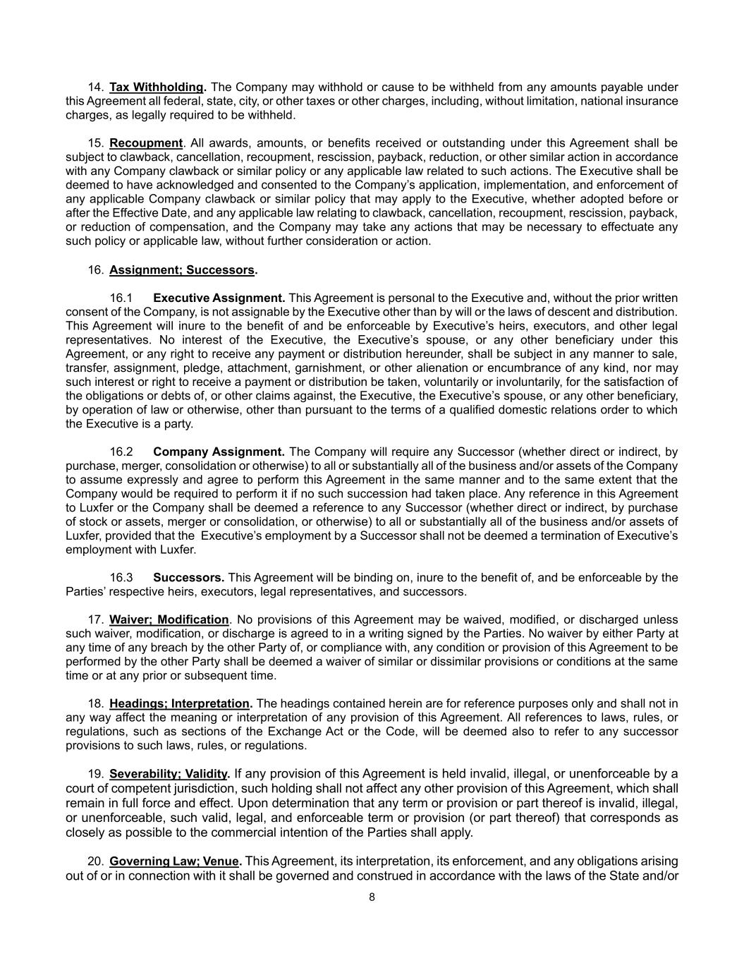 8 14. Tax Withholding. The Company may withhold or cause to be withheld from any amounts payable under this Agreement all federal, state, city, or other taxes or other charges, including, without limitation, national insurance charges, as legally required to be withheld. 15. Recoupment. All awards, amounts, or benefits received or outstanding under this Agreement shall be subject to clawback, cancellation, recoupment, rescission, payback, reduction, or other similar action in accordance with any Company clawback or similar policy or any applicable law related to such actions. The Executive shall be deemed to have acknowledged and consented to the Company’s application, implementation, and enforcement of any applicable Company clawback or similar policy that may apply to the Executive, whether adopted before or after the Effective Date, and any applicable law relating to clawback, cancellation, recoupment, rescission, payback, or reduction of compensation, and the Company may take any actions that may be necessary to effectuate any such policy or applicable law, without further consideration or action. 16. Assignment; Successors. 16.1 Executive Assignment. This Agreement is personal to the Executive and, without the prior written consent of the Company, is not assignable by the Executive other than by will or the laws of descent and distribution. This Agreement will inure to the benefit of and be enforceable by Executive’s heirs, executors, and other legal representatives. No interest of the Executive, the Executive’s spouse, or any other beneficiary under this Agreement, or any right to receive any payment or distribution hereunder, shall be subject in any manner to sale, transfer, assignment, pledge, attachment, garnishment, or other alienation or encumbrance of any kind, nor may such interest or right to receive a payment or distribution be taken, voluntarily or involuntarily, for the satisfaction of the obligations or debts of, or other claims against, the Executive, the Executive’s spouse, or any other beneficiary, by operation of law or otherwise, other than pursuant to the terms of a qualified domestic relations order to which the Executive is a party. 16.2 Company Assignment. The Company will require any Successor (whether direct or indirect, by purchase, merger, consolidation or otherwise) to all or substantially all of the business and/or assets of the Company to assume expressly and agree to perform this Agreement in the same manner and to the same extent that the Company would be required to perform it if no such succession had taken place. Any reference in this Agreement to Luxfer or the Company shall be deemed a reference to any Successor (whether direct or indirect, by purchase of stock or assets, merger or consolidation, or otherwise) to all or substantially all of the business and/or assets of Luxfer, provided that the Executive’s employment by a Successor shall not be deemed a termination of Executive’s employment with Luxfer. 16.3 Successors. This Agreement will be binding on, inure to the benefit of, and be enforceable by the Parties’ respective heirs, executors, legal representatives, and successors. 17. Waiver; Modification. No provisions of this Agreement may be waived, modified, or discharged unless such waiver, modification, or discharge is agreed to in a writing signed by the Parties. No waiver by either Party at any time of any breach by the other Party of, or compliance with, any condition or provision of this Agreement to be performed by the other Party shall be deemed a waiver of similar or dissimilar provisions or conditions at the same time or at any prior or subsequent time. 18. Headings; Interpretation. The headings contained herein are for reference purposes only and shall not in any way affect the meaning or interpretation of any provision of this Agreement. All references to laws, rules, or regulations, such as sections of the Exchange Act or the Code, will be deemed also to refer to any successor provisions to such laws, rules, or regulations. 19. Severability; Validity. If any provision of this Agreement is held invalid, illegal, or unenforceable by a court of competent jurisdiction, such holding shall not affect any other provision of this Agreement, which shall remain in full force and effect. Upon determination that any term or provision or part thereof is invalid, illegal, or unenforceable, such valid, legal, and enforceable term or provision (or part thereof) that corresponds as closely as possible to the commercial intention of the Parties shall apply. 20. Governing Law; Venue. This Agreement, its interpretation, its enforcement, and any obligations arising out of or in connection with it shall be governed and construed in accordance with the laws of the State and/or