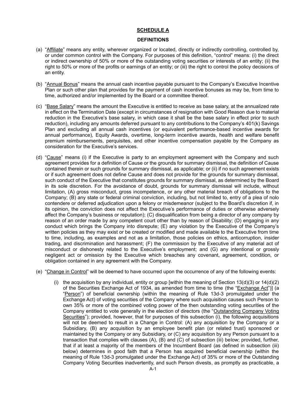 A-1 SCHEDULE A DEFINITIONS (a) “Affiliate” means any entity, wherever organized or located, directly or indirectly controlling, controlled by, or under common control with the Company. For purposes of this definition, “control” means: (i) the direct or indirect ownership of 50% or more of the outstanding voting securities or interests of an entity; (ii) the right to 50% or more of the profits or earnings of an entity; or (iii) the right to control the policy decisions of an entity. (b) “Annual Bonus” means the annual cash incentive payable pursuant to the Company’s Executive Incentive Plan or such other plan that provides for the payment of cash incentive bonuses as may be, from time to time, authorized and/or implemented by the Board or a committee thereof. (c) “Base Salary” means the amount the Executive is entitled to receive as base salary, at the annualized rate in effect on the Termination Date (except in circumstances of resignation with Good Reason due to material reduction in the Executive’s base salary, in which case it shall be the base salary in effect prior to such reduction), including any amounts deferred pursuant to any contributions to the Company’s 401(k) Savings Plan and excluding all annual cash incentives (or equivalent performance-based incentive awards for annual performance), Equity Awards, overtime, long-term incentive awards, health and welfare benefit premium reimbursements, perquisites, and other incentive compensation payable by the Company as consideration for the Executive’s services. (d) “Cause” means (i) if the Executive is party to an employment agreement with the Company and such agreement provides for a definition of Cause or the grounds for summary dismissal, the definition of Cause contained therein or such grounds for summary dismissal, as applicable; or (ii) if no such agreement exists or if such agreement does not define Cause and does not provide for the grounds for summary dismissal, such conduct of the Executive that constitutes grounds for summary dismissal, as determined by the Board in its sole discretion. For the avoidance of doubt, grounds for summary dismissal will include, without limitation, (A) gross misconduct, gross incompetence, or any other material breach of obligations to the Company; (B) any state or federal criminal conviction, including, but not limited to, entry of a plea of nolo contendere or deferred adjudication upon a felony or misdemeanor (subject to the Board’s discretion if, in its opinion, the conviction does not affect the Executive’s performance of duties or otherwise adversely affect the Company’s business or reputation); (C) disqualification from being a director of any company by reason of an order made by any competent court other than by reason of Disability; (D) engaging in any conduct which brings the Company into disrepute; (E) any violation by the Executive of the Company’s written policies as they may exist or be created or modified and made available to the Executive from time to time, including, as examples and not as a limitation, those policies on ethics, anticorruption, insider trading, and discrimination and harassment; (F) the commission by the Executive of any material act of misconduct or dishonesty related to the Executive’s employment; and (G) any intentional or grossly negligent act or omission by the Executive which breaches any covenant, agreement, condition, or obligation contained in any agreement with the Company. (e) “Change in Control” will be deemed to have occurred upon the occurrence of any of the following events: (i) the acquisition by any individual, entity or group [within the meaning of Section 13(d)(3) or 14(d)(2) of the Securities Exchange Act of 1934, as amended from time to time (the “Exchange Act”)] (a “Person”) of beneficial ownership (within the meaning of Rule 13d-3 promulgated under the Exchange Act) of voting securities of the Company where such acquisition causes such Person to own 35% or more of the combined voting power of the then outstanding voting securities of the Company entitled to vote generally in the election of directors (the “Outstanding Company Voting Securities”); provided, however, that for purposes of this subsection (i), the following acquisitions will not be deemed to result in a Change in Control: (A) any acquisition by the Company or a Subsidiary, (B) any acquisition by an employee benefit plan (or related trust) sponsored or maintained by the Company or any Subsidiary, or (C) any acquisition by any Person pursuant to a transaction that complies with clauses (A), (B) and (C) of subsection (iii) below; provided, further, that if at least a majority of the members of the Incumbent Board (as defined in subsection (iii) below) determines in good faith that a Person has acquired beneficial ownership (within the meaning of Rule 13d-3 promulgated under the Exchange Act) of 35% or more of the Outstanding Company Voting Securities inadvertently, and such Person divests, as promptly as practicable, a