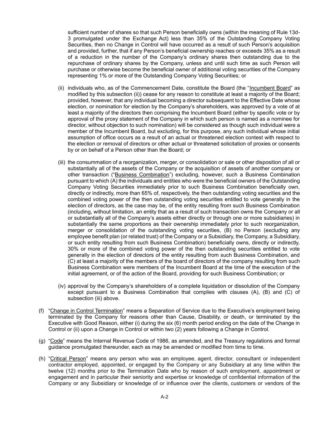 A-2 sufficient number of shares so that such Person beneficially owns (within the meaning of Rule 13d- 3 promulgated under the Exchange Act) less than 35% of the Outstanding Company Voting Securities, then no Change in Control will have occurred as a result of such Person’s acquisition and provided, further, that if any Person’s beneficial ownership reaches or exceeds 35% as a result of a reduction in the number of the Company’s ordinary shares then outstanding due to the repurchase of ordinary shares by the Company, unless and until such time as such Person will purchase or otherwise become the beneficial owner of additional voting securities of the Company representing 1% or more of the Outstanding Company Voting Securities; or (ii) individuals who, as of the Commencement Date, constitute the Board (the “Incumbent Board” as modified by this subsection (ii)) cease for any reason to constitute at least a majority of the Board; provided, however, that any individual becoming a director subsequent to the Effective Date whose election, or nomination for election by the Company’s shareholders, was approved by a vote of at least a majority of the directors then comprising the Incumbent Board (either by specific vote or by approval of the proxy statement of the Company in which such person is named as a nominee for director, without objection to such nomination) will be considered as though such individual were a member of the Incumbent Board, but excluding, for this purpose, any such individual whose initial assumption of office occurs as a result of an actual or threatened election contest with respect to the election or removal of directors or other actual or threatened solicitation of proxies or consents by or on behalf of a Person other than the Board; or (iii) the consummation of a reorganization, merger, or consolidation or sale or other disposition of all or substantially all of the assets of the Company or the acquisition of assets of another company or other transaction (“Business Combination”) excluding, however, such a Business Combination pursuant to which (A) the individuals and entities who were the beneficial owners of the Outstanding Company Voting Securities immediately prior to such Business Combination beneficially own, directly or indirectly, more than 65% of, respectively, the then outstanding voting securities and the combined voting power of the then outstanding voting securities entitled to vote generally in the election of directors, as the case may be, of the entity resulting from such Business Combination (including, without limitation, an entity that as a result of such transaction owns the Company or all or substantially all of the Company’s assets either directly or through one or more subsidiaries) in substantially the same proportions as their ownership immediately prior to such reorganization, merger or consolidation of the outstanding voting securities, (B) no Person (excluding any employee benefit plan (or related trust) of the Company or a Subsidiary, the Company, a Subsidiary, or such entity resulting from such Business Combination) beneficially owns, directly or indirectly, 30% or more of the combined voting power of the then outstanding securities entitled to vote generally in the election of directors of the entity resulting from such Business Combination, and (C) at least a majority of the members of the board of directors of the company resulting from such Business Combination were members of the Incumbent Board at the time of the execution of the initial agreement, or of the action of the Board, providing for such Business Combination; or (iv) approval by the Company’s shareholders of a complete liquidation or dissolution of the Company except pursuant to a Business Combination that complies with clauses (A), (B) and (C) of subsection (iii) above. (f) “Change in Control Termination” means a Separation of Service due to the Executive’s employment being terminated by the Company for reasons other than Cause, Disability, or death, or terminated by the Executive with Good Reason, either (i) during the six (6) month period ending on the date of the Change in Control or (ii) upon a Change in Control or within two (2) years following a Change in Control. (g) “Code” means the Internal Revenue Code of 1986, as amended, and the Treasury regulations and formal guidance promulgated thereunder, each as may be amended or modified from time to time. (h) “Critical Person” means any person who was an employee, agent, director, consultant or independent contractor employed, appointed, or engaged by the Company or any Subsidiary at any time within the twelve (12) months prior to the Termination Date who by reason of such employment, appointment or engagement and in particular their seniority and expertise or knowledge of confidential information of the Company or any Subsidiary or knowledge of or influence over the clients, customers or vendors of the