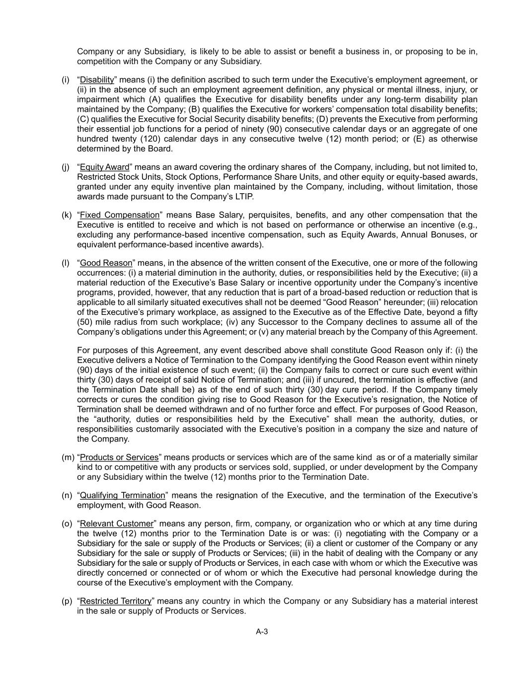 A-3 Company or any Subsidiary, is likely to be able to assist or benefit a business in, or proposing to be in, competition with the Company or any Subsidiary. (i) “Disability” means (i) the definition ascribed to such term under the Executive’s employment agreement, or (ii) in the absence of such an employment agreement definition, any physical or mental illness, injury, or impairment which (A) qualifies the Executive for disability benefits under any long-term disability plan maintained by the Company; (B) qualifies the Executive for workers’ compensation total disability benefits; (C) qualifies the Executive for Social Security disability benefits; (D) prevents the Executive from performing their essential job functions for a period of ninety (90) consecutive calendar days or an aggregate of one hundred twenty (120) calendar days in any consecutive twelve (12) month period; or (E) as otherwise determined by the Board. (j) “Equity Award” means an award covering the ordinary shares of the Company, including, but not limited to, Restricted Stock Units, Stock Options, Performance Share Units, and other equity or equity-based awards, granted under any equity inventive plan maintained by the Company, including, without limitation, those awards made pursuant to the Company’s LTIP. (k) “Fixed Compensation” means Base Salary, perquisites, benefits, and any other compensation that the Executive is entitled to receive and which is not based on performance or otherwise an incentive (e.g., excluding any performance-based incentive compensation, such as Equity Awards, Annual Bonuses, or equivalent performance-based incentive awards). (l) “Good Reason” means, in the absence of the written consent of the Executive, one or more of the following occurrences: (i) a material diminution in the authority, duties, or responsibilities held by the Executive; (ii) a material reduction of the Executive’s Base Salary or incentive opportunity under the Company’s incentive programs, provided, however, that any reduction that is part of a broad-based reduction or reduction that is applicable to all similarly situated executives shall not be deemed “Good Reason” hereunder; (iii) relocation of the Executive’s primary workplace, as assigned to the Executive as of the Effective Date, beyond a fifty (50) mile radius from such workplace; (iv) any Successor to the Company declines to assume all of the Company’s obligations under this Agreement; or (v) any material breach by the Company of this Agreement. For purposes of this Agreement, any event described above shall constitute Good Reason only if: (i) the Executive delivers a Notice of Termination to the Company identifying the Good Reason event within ninety (90) days of the initial existence of such event; (ii) the Company fails to correct or cure such event within thirty (30) days of receipt of said Notice of Termination; and (iii) if uncured, the termination is effective (and the Termination Date shall be) as of the end of such thirty (30) day cure period. If the Company timely corrects or cures the condition giving rise to Good Reason for the Executive’s resignation, the Notice of Termination shall be deemed withdrawn and of no further force and effect. For purposes of Good Reason, the “authority, duties or responsibilities held by the Executive” shall mean the authority, duties, or responsibilities customarily associated with the Executive’s position in a company the size and nature of the Company. (m) “Products or Services” means products or services which are of the same kind as or of a materially similar kind to or competitive with any products or services sold, supplied, or under development by the Company or any Subsidiary within the twelve (12) months prior to the Termination Date. (n) “Qualifying Termination” means the resignation of the Executive, and the termination of the Executive’s employment, with Good Reason. (o) “Relevant Customer” means any person, firm, company, or organization who or which at any time during the twelve (12) months prior to the Termination Date is or was: (i) negotiating with the Company or a Subsidiary for the sale or supply of the Products or Services; (ii) a client or customer of the Company or any Subsidiary for the sale or supply of Products or Services; (iii) in the habit of dealing with the Company or any Subsidiary for the sale or supply of Products or Services, in each case with whom or which the Executive was directly concerned or connected or of whom or which the Executive had personal knowledge during the course of the Executive’s employment with the Company. (p) “Restricted Territory” means any country in which the Company or any Subsidiary has a material interest in the sale or supply of Products or Services.