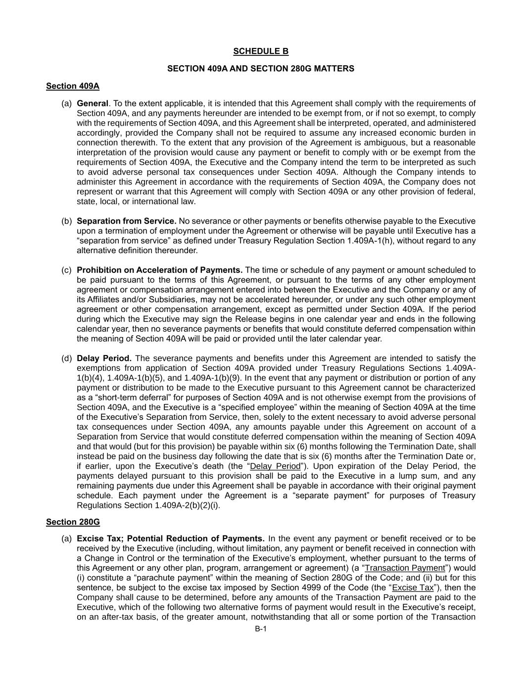B-1 SCHEDULE B SECTION 409A AND SECTION 280G MATTERS Section 409A (a) General. To the extent applicable, it is intended that this Agreement shall comply with the requirements of Section 409A, and any payments hereunder are intended to be exempt from, or if not so exempt, to comply with the requirements of Section 409A, and this Agreement shall be interpreted, operated, and administered accordingly, provided the Company shall not be required to assume any increased economic burden in connection therewith. To the extent that any provision of the Agreement is ambiguous, but a reasonable interpretation of the provision would cause any payment or benefit to comply with or be exempt from the requirements of Section 409A, the Executive and the Company intend the term to be interpreted as such to avoid adverse personal tax consequences under Section 409A. Although the Company intends to administer this Agreement in accordance with the requirements of Section 409A, the Company does not represent or warrant that this Agreement will comply with Section 409A or any other provision of federal, state, local, or international law. (b) Separation from Service. No severance or other payments or benefits otherwise payable to the Executive upon a termination of employment under the Agreement or otherwise will be payable until Executive has a “separation from service” as defined under Treasury Regulation Section 1.409A-1(h), without regard to any alternative definition thereunder. (c) Prohibition on Acceleration of Payments. The time or schedule of any payment or amount scheduled to be paid pursuant to the terms of this Agreement, or pursuant to the terms of any other employment agreement or compensation arrangement entered into between the Executive and the Company or any of its Affiliates and/or Subsidiaries, may not be accelerated hereunder, or under any such other employment agreement or other compensation arrangement, except as permitted under Section 409A. If the period during which the Executive may sign the Release begins in one calendar year and ends in the following calendar year, then no severance payments or benefits that would constitute deferred compensation within the meaning of Section 409A will be paid or provided until the later calendar year. (d) Delay Period. The severance payments and benefits under this Agreement are intended to satisfy the exemptions from application of Section 409A provided under Treasury Regulations Sections 1.409A- 1(b)(4), 1.409A-1(b)(5), and 1.409A-1(b)(9). In the event that any payment or distribution or portion of any payment or distribution to be made to the Executive pursuant to this Agreement cannot be characterized as a “short-term deferral” for purposes of Section 409A and is not otherwise exempt from the provisions of Section 409A, and the Executive is a “specified employee” within the meaning of Section 409A at the time of the Executive’s Separation from Service, then, solely to the extent necessary to avoid adverse personal tax consequences under Section 409A, any amounts payable under this Agreement on account of a Separation from Service that would constitute deferred compensation within the meaning of Section 409A and that would (but for this provision) be payable within six (6) months following the Termination Date, shall instead be paid on the business day following the date that is six (6) months after the Termination Date or, if earlier, upon the Executive’s death (the “Delay Period”). Upon expiration of the Delay Period, the payments delayed pursuant to this provision shall be paid to the Executive in a lump sum, and any remaining payments due under this Agreement shall be payable in accordance with their original payment schedule. Each payment under the Agreement is a “separate payment” for purposes of Treasury Regulations Section 1.409A-2(b)(2)(i). Section 280G (a) Excise Tax; Potential Reduction of Payments. In the event any payment or benefit received or to be received by the Executive (including, without limitation, any payment or benefit received in connection with a Change in Control or the termination of the Executive’s employment, whether pursuant to the terms of this Agreement or any other plan, program, arrangement or agreement) (a “Transaction Payment”) would (i) constitute a “parachute payment” within the meaning of Section 280G of the Code; and (ii) but for this sentence, be subject to the excise tax imposed by Section 4999 of the Code (the “Excise Tax”), then the Company shall cause to be determined, before any amounts of the Transaction Payment are paid to the Executive, which of the following two alternative forms of payment would result in the Executive’s receipt, on an after-tax basis, of the greater amount, notwithstanding that all or some portion of the Transaction