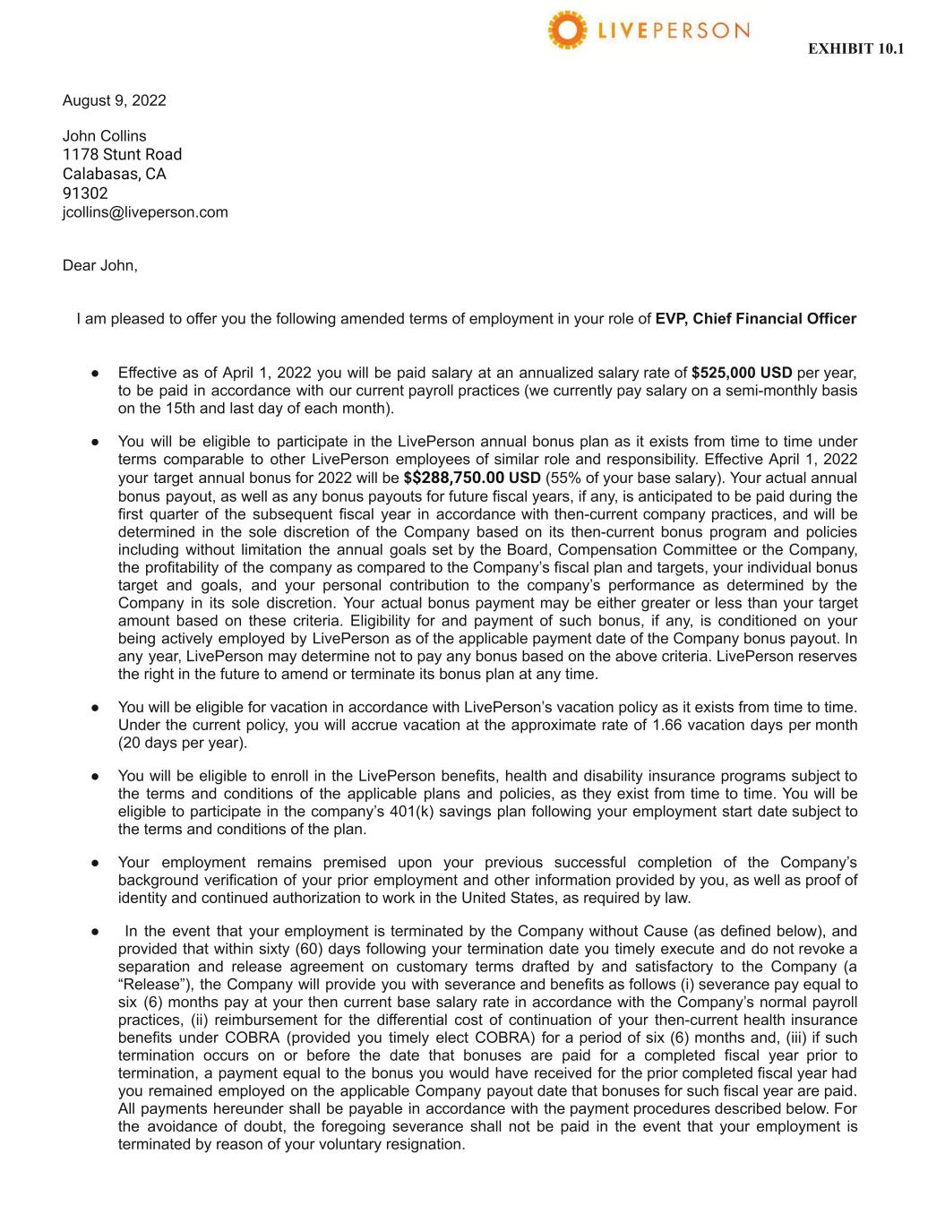 August 9, 2022 John Collins 1178 Stunt Road Calabasas, CA 91302 jcollins@liveperson.com Dear John, I am pleased to offer you the following amended terms of employment in your role of EVP, Chief Financial Officer ● Effective as of April 1, 2022 you will be paid salary at an annualized salary rate of $525,000 USD per year, to be paid in accordance with our current payroll practices (we currently pay salary on a semi-monthly basis on the 15th and last day of each month). ● You will be eligible to participate in the LivePerson annual bonus plan as it exists from time to time under terms comparable to other LivePerson employees of similar role and responsibility. Effective April 1, 2022 your target annual bonus for 2022 will be $$288,750.00 USD (55% of your base salary). Your actual annual bonus payout, as well as any bonus payouts for future fiscal years, if any, is anticipated to be paid during the first quarter of the subsequent fiscal year in accordance with then-current company practices, and will be determined in the sole discretion of the Company based on its then-current bonus program and policies including without limitation the annual goals set by the Board, Compensation Committee or the Company, the profitability of the company as compared to the Company’s fiscal plan and targets, your individual bonus target and goals, and your personal contribution to the company’s performance as determined by the Company in its sole discretion. Your actual bonus payment may be either greater or less than your target amount based on these criteria. Eligibility for and payment of such bonus, if any, is conditioned on your being actively employed by LivePerson as of the applicable payment date of the Company bonus payout. In any year, LivePerson may determine not to pay any bonus based on the above criteria. LivePerson reserves the right in the future to amend or terminate its bonus plan at any time. ● You will be eligible for vacation in accordance with LivePerson’s vacation policy as it exists from time to time. Under the current policy, you will accrue vacation at the approximate rate of 1.66 vacation days per month (20 days per year). ● You will be eligible to enroll in the LivePerson benefits, health and disability insurance programs subject to the terms and conditions of the applicable plans and policies, as they exist from time to time. You will be eligible to participate in the company’s 401(k) savings plan following your employment start date subject to the terms and conditions of the plan. ● Your employment remains premised upon your previous successful completion of the Company’s background verification of your prior employment and other information provided by you, as well as proof of identity and continued authorization to work in the United States, as required by law. ● In the event that your employment is terminated by the Company without Cause (as defined below), and provided that within sixty (60) days following your termination date you timely execute and do not revoke a separation and release agreement on customary terms drafted by and satisfactory to the Company (a “Release”), the Company will provide you with severance and benefits as follows (i) severance pay equal to six (6) months pay at your then current base salary rate in accordance with the Company’s normal payroll practices, (ii) reimbursement for the differential cost of continuation of your then-current health insurance benefits under COBRA (provided you timely elect COBRA) for a period of six (6) months and, (iii) if such termination occurs on or before the date that bonuses are paid for a completed fiscal year prior to termination, a payment equal to the bonus you would have received for the prior completed fiscal year had you remained employed on the applicable Company payout date that bonuses for such fiscal year are paid. All payments hereunder shall be payable in accordance with the payment procedures described below. For the avoidance of doubt, the foregoing severance shall not be paid in the event that your employment is terminated by reason of your voluntary resignation. EXHIBIT 10.1