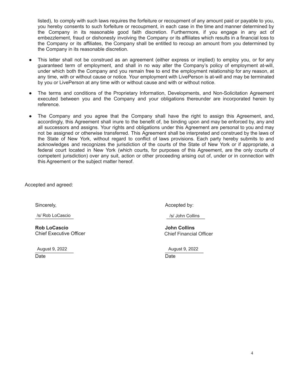 listed), to comply with such laws requires the forfeiture or recoupment of any amount paid or payable to you, you hereby consents to such forfeiture or recoupment, in each case in the time and manner determined by the Company in its reasonable good faith discretion. Furthermore, if you engage in any act of embezzlement, fraud or dishonesty involving the Company or its affiliates which results in a financial loss to the Company or its affiliates, the Company shall be entitled to recoup an amount from you determined by the Company in its reasonable discretion. ● This letter shall not be construed as an agreement (either express or implied) to employ you, or for any guaranteed term of employment, and shall in no way alter the Company’s policy of employment at-will, under which both the Company and you remain free to end the employment relationship for any reason, at any time, with or without cause or notice. Your employment with LivePerson is at-will and may be terminated by you or LivePerson at any time with or without cause and with or without notice. ● The terms and conditions of the Proprietary Information, Developments, and Non-Solicitation Agreement executed between you and the Company and your obligations thereunder are incorporated herein by reference. ● The Company and you agree that the Company shall have the right to assign this Agreement, and, accordingly, this Agreement shall inure to the benefit of, be binding upon and may be enforced by, any and all successors and assigns. Your rights and obligations under this Agreement are personal to you and may not be assigned or otherwise transferred. This Agreement shall be interpreted and construed by the laws of the State of New York, without regard to conflict of laws provisions. Each party hereby submits to and acknowledges and recognizes the jurisdiction of the courts of the State of New York or if appropriate, a federal court located in New York (which courts, for purposes of this Agreement, are the only courts of competent jurisdiction) over any suit, action or other proceeding arising out of, under or in connection with this Agreement or the subject matter hereof. Accepted and agreed: Sincerely, ______________ Rob LoCascio Chief Executive Officer ______________ Date Accepted by: ______________ John Collins ______________ Date 4 /s/ Rob LoCascio /s/ John Collins August 9, 2022 August 9, 2022 Chief Financial Officer
