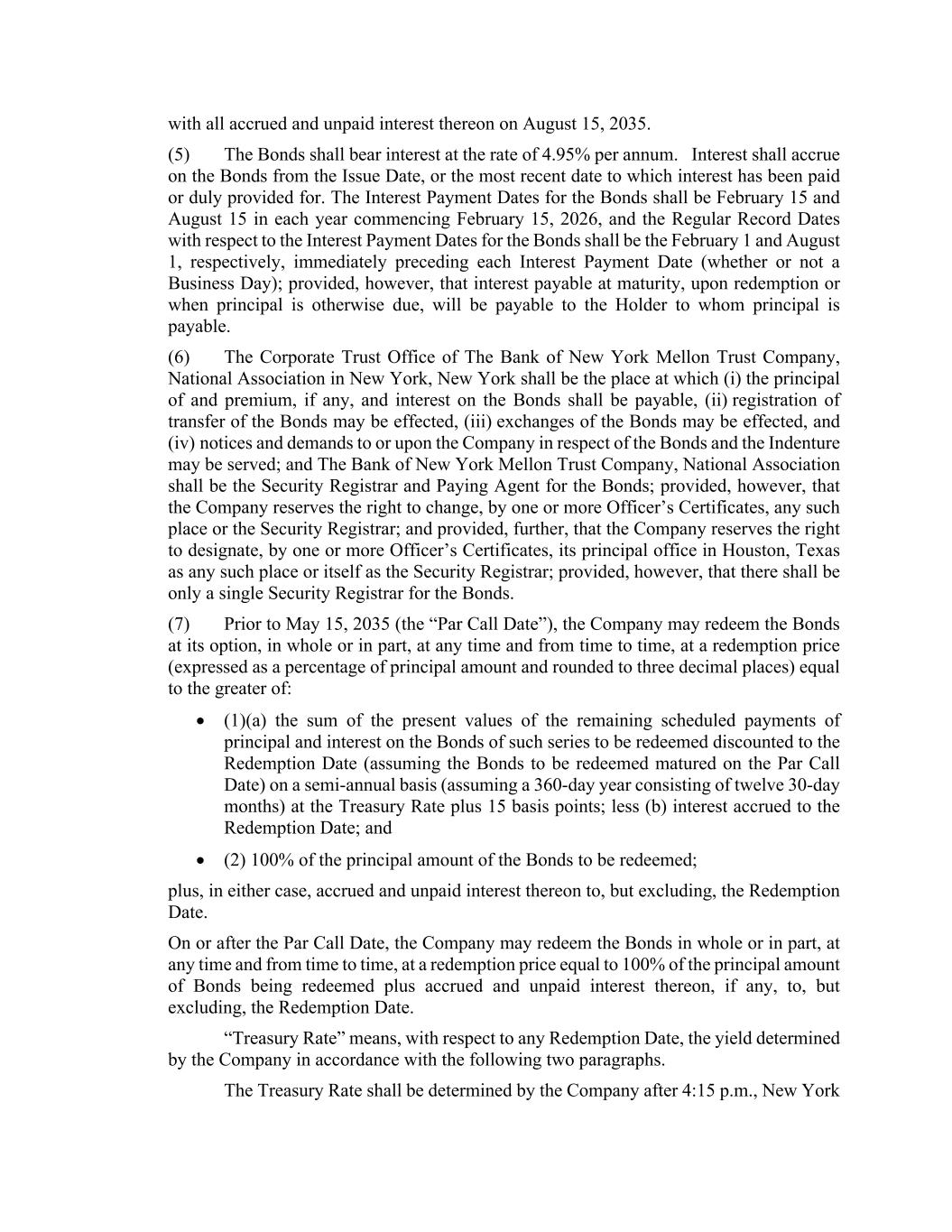 with all accrued and unpaid interest thereon on August 15, 2035. (5) The Bonds shall bear interest at the rate of 4.95% per annum. Interest shall accrue on the Bonds from the Issue Date, or the most recent date to which interest has been paid or duly provided for. The Interest Payment Dates for the Bonds shall be February 15 and August 15 in each year commencing February 15, 2026, and the Regular Record Dates with respect to the Interest Payment Dates for the Bonds shall be the February 1 and August 1, respectively, immediately preceding each Interest Payment Date (whether or not a Business Day); provided, however, that interest payable at maturity, upon redemption or when principal is otherwise due, will be payable to the Holder to whom principal is payable. (6) The Corporate Trust Office of The Bank of New York Mellon Trust Company, National Association in New York, New York shall be the place at which (i) the principal of and premium, if any, and interest on the Bonds shall be payable, (ii) registration of transfer of the Bonds may be effected, (iii) exchanges of the Bonds may be effected, and (iv) notices and demands to or upon the Company in respect of the Bonds and the Indenture may be served; and The Bank of New York Mellon Trust Company, National Association shall be the Security Registrar and Paying Agent for the Bonds; provided, however, that the Company reserves the right to change, by one or more Officer’s Certificates, any such place or the Security Registrar; and provided, further, that the Company reserves the right to designate, by one or more Officer’s Certificates, its principal office in Houston, Texas as any such place or itself as the Security Registrar; provided, however, that there shall be only a single Security Registrar for the Bonds. (7) Prior to May 15, 2035 (the “Par Call Date”), the Company may redeem the Bonds at its option, in whole or in part, at any time and from time to time, at a redemption price (expressed as a percentage of principal amount and rounded to three decimal places) equal to the greater of: • (1)(a) the sum of the present values of the remaining scheduled payments of principal and interest on the Bonds of such series to be redeemed discounted to the Redemption Date (assuming the Bonds to be redeemed matured on the Par Call Date) on a semi-annual basis (assuming a 360-day year consisting of twelve 30-day months) at the Treasury Rate plus 15 basis points; less (b) interest accrued to the Redemption Date; and • (2) 100% of the principal amount of the Bonds to be redeemed; plus, in either case, accrued and unpaid interest thereon to, but excluding, the Redemption Date. On or after the Par Call Date, the Company may redeem the Bonds in whole or in part, at any time and from time to time, at a redemption price equal to 100% of the principal amount of Bonds being redeemed plus accrued and unpaid interest thereon, if any, to, but excluding, the Redemption Date. “Treasury Rate” means, with respect to any Redemption Date, the yield determined by the Company in accordance with the following two paragraphs. The Treasury Rate shall be determined by the Company after 4:15 p.m., New York