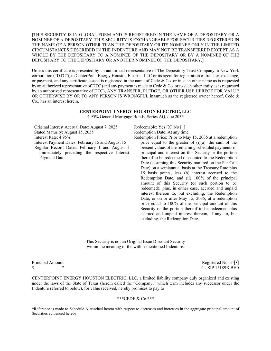 [THIS SECURITY IS IN GLOBAL FORM AND IS REGISTERED IN THE NAME OF A DEPOSITARY OR A NOMINEE OF A DEPOSITARY. THIS SECURITY IS EXCHANGEABLE FOR SECURITIES REGISTERED IN THE NAME OF A PERSON OTHER THAN THE DEPOSITARY OR ITS NOMINEE ONLY IN THE LIMITED CIRCUMSTANCES DESCRIBED IN THE INDENTURE AND MAY NOT BE TRANSFERRED EXCEPT AS A WHOLE BY THE DEPOSITARY TO A NOMINEE OF THE DEPOSITARY OR BY A NOMINEE OF THE DEPOSITARY TO THE DEPOSITARY OR ANOTHER NOMINEE OF THE DEPOSITARY.] Unless this certificate is presented by an authorized representative of The Depository Trust Company, a New York corporation (“DTC”), to CenterPoint Energy Houston Electric, LLC or its agent for registration of transfer, exchange, or payment, and any certificate issued is registered in the name of Cede & Co. or in such other name as is requested by an authorized representative of DTC (and any payment is made to Cede & Co. or to such other entity as is requested by an authorized representative of DTC), ANY TRANSFER, PLEDGE, OR OTHER USE HEREOF FOR VALUE OR OTHERWISE BY OR TO ANY PERSON IS WRONGFUL inasmuch as the registered owner hereof, Cede & Co., has an interest herein. CENTERPOINT ENERGY HOUSTON ELECTRIC, LLC 4.95% General Mortgage Bonds, Series AQ, due 2035 Original Interest Accrual Date: August 7, 2025 Stated Maturity: August 15, 2035 Interest Rate: 4.95% Interest Payment Dates: February 15 and August 15 Regular Record Dates: February 1 and August 1 immediately preceding the respective Interest Payment Date Redeemable: Yes [X] No [ ] Redemption Date: At any time. Redemption Price: Prior to May 15, 2035 at a redemption price equal to the greater of (i)(a) the sum of the present values of the remaining scheduled payments of principal and interest on this Security or the portion thereof to be redeemed discounted to the Redemption Date (assuming this Security matured on the Par Call Date) on a semiannual basis at the Treasury Rate plus 15 basis points, less (b) interest accrued to the Redemption Date, and (ii) 100% of the principal amount of this Security (or such portion to be redeemed); plus, in either case, accrued and unpaid interest thereon to, but excluding, the Redemption Date; or on or after May 15, 2035, at a redemption price equal to 100% of the principal amount of this Security or the portion thereof to be redeemed plus accrued and unpaid interest thereon, if any, to, but excluding, the Redemption Date. This Security is not an Original Issue Discount Security within the meaning of the within-mentioned Indenture. _____________________________ Principal Amount Registered No. T-[•] $ * CUSIP 15189X BH0 CENTERPOINT ENERGY HOUSTON ELECTRIC, LLC, a limited liability company duly organized and existing under the laws of the State of Texas (herein called the “Company,” which term includes any successor under the Indenture referred to below), for value received, hereby promises to pay to ***CEDE & Co.*** *Reference is made to Schedule A attached hereto with respect to decreases and increases in the aggregate principal amount of Securities evidenced hereby.