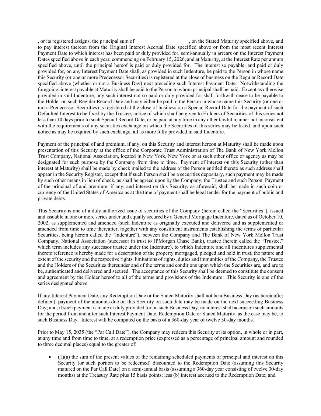 , or its registered assigns, the principal sum of , on the Stated Maturity specified above, and to pay interest thereon from the Original Interest Accrual Date specified above or from the most recent Interest Payment Date to which interest has been paid or duly provided for, semi-annually in arrears on the Interest Payment Dates specified above in each year, commencing on February 15, 2026, and at Maturity, at the Interest Rate per annum specified above, until the principal hereof is paid or duly provided for. The interest so payable, and paid or duly provided for, on any Interest Payment Date shall, as provided in such Indenture, be paid to the Person in whose name this Security (or one or more Predecessor Securities) is registered at the close of business on the Regular Record Date specified above (whether or not a Business Day) next preceding such Interest Payment Date. Notwithstanding the foregoing, interest payable at Maturity shall be paid to the Person to whom principal shall be paid. Except as otherwise provided in said Indenture, any such interest not so paid or duly provided for shall forthwith cease to be payable to the Holder on such Regular Record Date and may either be paid to the Person in whose name this Security (or one or more Predecessor Securities) is registered at the close of business on a Special Record Date for the payment of such Defaulted Interest to be fixed by the Trustee, notice of which shall be given to Holders of Securities of this series not less than 10 days prior to such Special Record Date, or be paid at any time in any other lawful manner not inconsistent with the requirements of any securities exchange on which the Securities of this series may be listed, and upon such notice as may be required by such exchange, all as more fully provided in said Indenture. Payment of the principal of and premium, if any, on this Security and interest hereon at Maturity shall be made upon presentation of this Security at the office of the Corporate Trust Administration of The Bank of New York Mellon Trust Company, National Association, located in New York, New York or at such other office or agency as may be designated for such purpose by the Company from time to time. Payment of interest on this Security (other than interest at Maturity) shall be made by check mailed to the address of the Person entitled thereto as such address shall appear in the Security Register, except that if such Person shall be a securities depositary, such payment may be made by such other means in lieu of check, as shall be agreed upon by the Company, the Trustee and such Person. Payment of the principal of and premium, if any, and interest on this Security, as aforesaid, shall be made in such coin or currency of the United States of America as at the time of payment shall be legal tender for the payment of public and private debts. This Security is one of a duly authorized issue of securities of the Company (herein called the “Securities”), issued and issuable in one or more series under and equally secured by a General Mortgage Indenture, dated as of October 10, 2002, as supplemented and amended (such Indenture as originally executed and delivered and as supplemented or amended from time to time thereafter, together with any constituent instruments establishing the terms of particular Securities, being herein called the “Indenture”), between the Company and The Bank of New York Mellon Trust Company, National Association (successor in trust to JPMorgan Chase Bank), trustee (herein called the “Trustee,” which term includes any successor trustee under the Indenture), to which Indenture and all indentures supplemental thereto reference is hereby made for a description of the property mortgaged, pledged and held in trust, the nature and extent of the security and the respective rights, limitations of rights, duties and immunities of the Company, the Trustee and the Holders of the Securities thereunder and of the terms and conditions upon which the Securities are, and are to be, authenticated and delivered and secured. The acceptance of this Security shall be deemed to constitute the consent and agreement by the Holder hereof to all of the terms and provisions of the Indenture. This Security is one of the series designated above. If any Interest Payment Date, any Redemption Date or the Stated Maturity shall not be a Business Day (as hereinafter defined), payment of the amounts due on this Security on such date may be made on the next succeeding Business Day; and, if such payment is made or duly provided for on such Business Day, no interest shall accrue on such amounts for the period from and after such Interest Payment Date, Redemption Date or Stated Maturity, as the case may be, to such Business Day. Interest will be computed on the basis of a 360-day year of twelve 30-day months. Prior to May 15, 2035 (the “Par Call Date”), the Company may redeem this Security at its option, in whole or in part, at any time and from time to time, at a redemption price (expressed as a percentage of principal amount and rounded to three decimal places) equal to the greater of: • (1)(a) the sum of the present values of the remaining scheduled payments of principal and interest on this Security (or such portion to be redeemed) discounted to the Redemption Date (assuming this Security matured on the Par Call Date) on a semi-annual basis (assuming a 360-day year consisting of twelve 30-day months) at the Treasury Rate plus 15 basis points; less (b) interest accrued to the Redemption Date; and