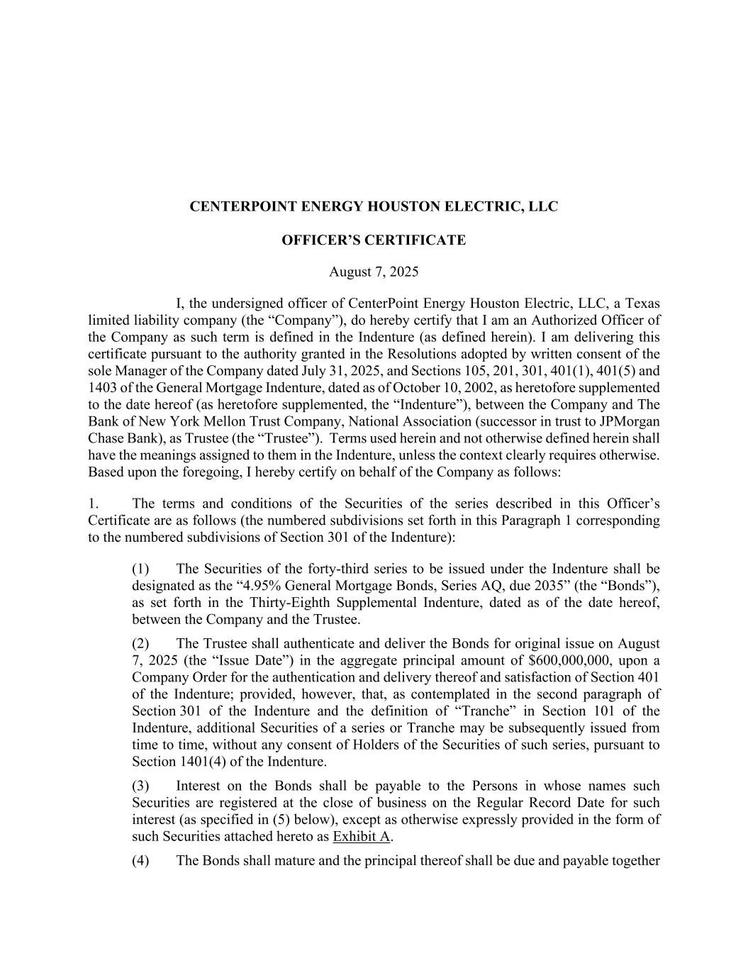 CENTERPOINT ENERGY HOUSTON ELECTRIC, LLC OFFICER’S CERTIFICATE August 7, 2025 I, the undersigned officer of CenterPoint Energy Houston Electric, LLC, a Texas limited liability company (the “Company”), do hereby certify that I am an Authorized Officer of the Company as such term is defined in the Indenture (as defined herein). I am delivering this certificate pursuant to the authority granted in the Resolutions adopted by written consent of the sole Manager of the Company dated July 31, 2025, and Sections 105, 201, 301, 401(1), 401(5) and 1403 of the General Mortgage Indenture, dated as of October 10, 2002, as heretofore supplemented to the date hereof (as heretofore supplemented, the “Indenture”), between the Company and The Bank of New York Mellon Trust Company, National Association (successor in trust to JPMorgan Chase Bank), as Trustee (the “Trustee”). Terms used herein and not otherwise defined herein shall have the meanings assigned to them in the Indenture, unless the context clearly requires otherwise. Based upon the foregoing, I hereby certify on behalf of the Company as follows: 1. The terms and conditions of the Securities of the series described in this Officer’s Certificate are as follows (the numbered subdivisions set forth in this Paragraph 1 corresponding to the numbered subdivisions of Section 301 of the Indenture): (1) The Securities of the forty-third series to be issued under the Indenture shall be designated as the “4.95% General Mortgage Bonds, Series AQ, due 2035” (the “Bonds”), as set forth in the Thirty-Eighth Supplemental Indenture, dated as of the date hereof, between the Company and the Trustee. (2) The Trustee shall authenticate and deliver the Bonds for original issue on August 7, 2025 (the “Issue Date”) in the aggregate principal amount of $600,000,000, upon a Company Order for the authentication and delivery thereof and satisfaction of Section 401 of the Indenture; provided, however, that, as contemplated in the second paragraph of Section 301 of the Indenture and the definition of “Tranche” in Section 101 of the Indenture, additional Securities of a series or Tranche may be subsequently issued from time to time, without any consent of Holders of the Securities of such series, pursuant to Section 1401(4) of the Indenture. (3) Interest on the Bonds shall be payable to the Persons in whose names such Securities are registered at the close of business on the Regular Record Date for such interest (as specified in (5) below), except as otherwise expressly provided in the form of such Securities attached hereto as Exhibit A. (4) The Bonds shall mature and the principal thereof shall be due and payable together
