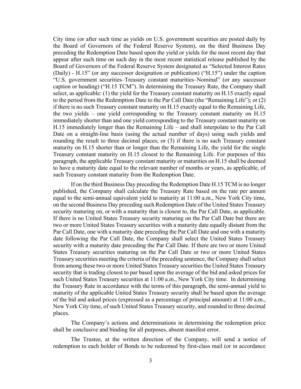 3 City time (or after such time as yields on U.S. government securities are posted daily by the Board of Governors of the Federal Reserve System), on the third Business Day preceding the Redemption Date based upon the yield or yields for the most recent day that appear after such time on such day in the most recent statistical release published by the Board of Governors of the Federal Reserve System designated as “Selected Interest Rates (Daily) - H.15” (or any successor designation or publication) (“H.15”) under the caption “U.S. government securities–Treasury constant maturities–Nominal” (or any successor caption or heading) (“H.15 TCM”). In determining the Treasury Rate, the Company shall select, as applicable: (1) the yield for the Treasury constant maturity on H.15 exactly equal to the period from the Redemption Date to the Par Call Date (the “Remaining Life”); or (2) if there is no such Treasury constant maturity on H.15 exactly equal to the Remaining Life, the two yields – one yield corresponding to the Treasury constant maturity on H.15 immediately shorter than and one yield corresponding to the Treasury constant maturity on H.15 immediately longer than the Remaining Life – and shall interpolate to the Par Call Date on a straight-line basis (using the actual number of days) using such yields and rounding the result to three decimal places; or (3) if there is no such Treasury constant maturity on H.15 shorter than or longer than the Remaining Life, the yield for the single Treasury constant maturity on H.15 closest to the Remaining Life. For purposes of this paragraph, the applicable Treasury constant maturity or maturities on H.15 shall be deemed to have a maturity date equal to the relevant number of months or years, as applicable, of such Treasury constant maturity from the Redemption Date. If on the third Business Day preceding the Redemption Date H.15 TCM is no longer published, the Company shall calculate the Treasury Rate based on the rate per annum equal to the semi-annual equivalent yield to maturity at 11:00 a.m., New York City time, on the second Business Day preceding such Redemption Date of the United States Treasury security maturing on, or with a maturity that is closest to, the Par Call Date, as applicable. If there is no United States Treasury security maturing on the Par Call Date but there are two or more United States Treasury securities with a maturity date equally distant from the Par Call Date, one with a maturity date preceding the Par Call Date and one with a maturity date following the Par Call Date, the Company shall select the United States Treasury security with a maturity date preceding the Par Call Date. If there are two or more United States Treasury securities maturing on the Par Call Date or two or more United States Treasury securities meeting the criteria of the preceding sentence, the Company shall select from among these two or more United States Treasury securities the United States Treasury security that is trading closest to par based upon the average of the bid and asked prices for such United States Treasury securities at 11:00 a.m., New York City time. In determining the Treasury Rate in accordance with the terms of this paragraph, the semi-annual yield to maturity of the applicable United States Treasury security shall be based upon the average of the bid and asked prices (expressed as a percentage of principal amount) at 11:00 a.m., New York City time, of such United States Treasury security, and rounded to three decimal places. The Company’s actions and determinations in determining the redemption price shall be conclusive and binding for all purposes, absent manifest error. The Trustee, at the written direction of the Company, will send a notice of redemption to each holder of Bonds to be redeemed by first-class mail (or in accordance