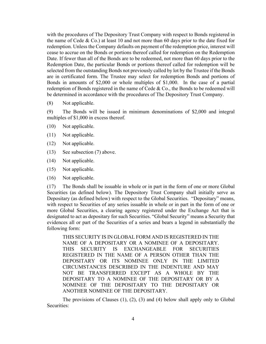 4 with the procedures of The Depository Trust Company with respect to Bonds registered in the name of Cede & Co.) at least 10 and not more than 60 days prior to the date fixed for redemption. Unless the Company defaults on payment of the redemption price, interest will cease to accrue on the Bonds or portions thereof called for redemption on the Redemption Date. If fewer than all of the Bonds are to be redeemed, not more than 60 days prior to the Redemption Date, the particular Bonds or portions thereof called for redemption will be selected from the outstanding Bonds not previously called by lot by the Trustee if the Bonds are in certificated form. The Trustee may select for redemption Bonds and portions of Bonds in amounts of $2,000 or whole multiples of $1,000. In the case of a partial redemption of Bonds registered in the name of Cede & Co., the Bonds to be redeemed will be determined in accordance with the procedures of The Depository Trust Company. (8) Not applicable. (9) The Bonds will be issued in minimum denominations of $2,000 and integral multiples of $1,000 in excess thereof. (10) Not applicable. (11) Not applicable. (12) Not applicable. (13) See subsection (7) above. (14) Not applicable. (15) Not applicable. (16) Not applicable. (17) The Bonds shall be issuable in whole or in part in the form of one or more Global Securities (as defined below). The Depository Trust Company shall initially serve as Depositary (as defined below) with respect to the Global Securities. “Depositary” means, with respect to Securities of any series issuable in whole or in part in the form of one or more Global Securities, a clearing agency registered under the Exchange Act that is designated to act as depositary for such Securities. “Global Security” means a Security that evidences all or part of the Securities of a series and bears a legend in substantially the following form: THIS SECURITY IS IN GLOBAL FORM AND IS REGISTERED IN THE NAME OF A DEPOSITARY OR A NOMINEE OF A DEPOSITARY. THIS SECURITY IS EXCHANGEABLE FOR SECURITIES REGISTERED IN THE NAME OF A PERSON OTHER THAN THE DEPOSITARY OR ITS NOMINEE ONLY IN THE LIMITED CIRCUMSTANCES DESCRIBED IN THE INDENTURE AND MAY NOT BE TRANSFERRED EXCEPT AS A WHOLE BY THE DEPOSITARY TO A NOMINEE OF THE DEPOSITARY OR BY A NOMINEE OF THE DEPOSITARY TO THE DEPOSITARY OR ANOTHER NOMINEE OF THE DEPOSITARY. The provisions of Clauses (1), (2), (3) and (4) below shall apply only to Global Securities: