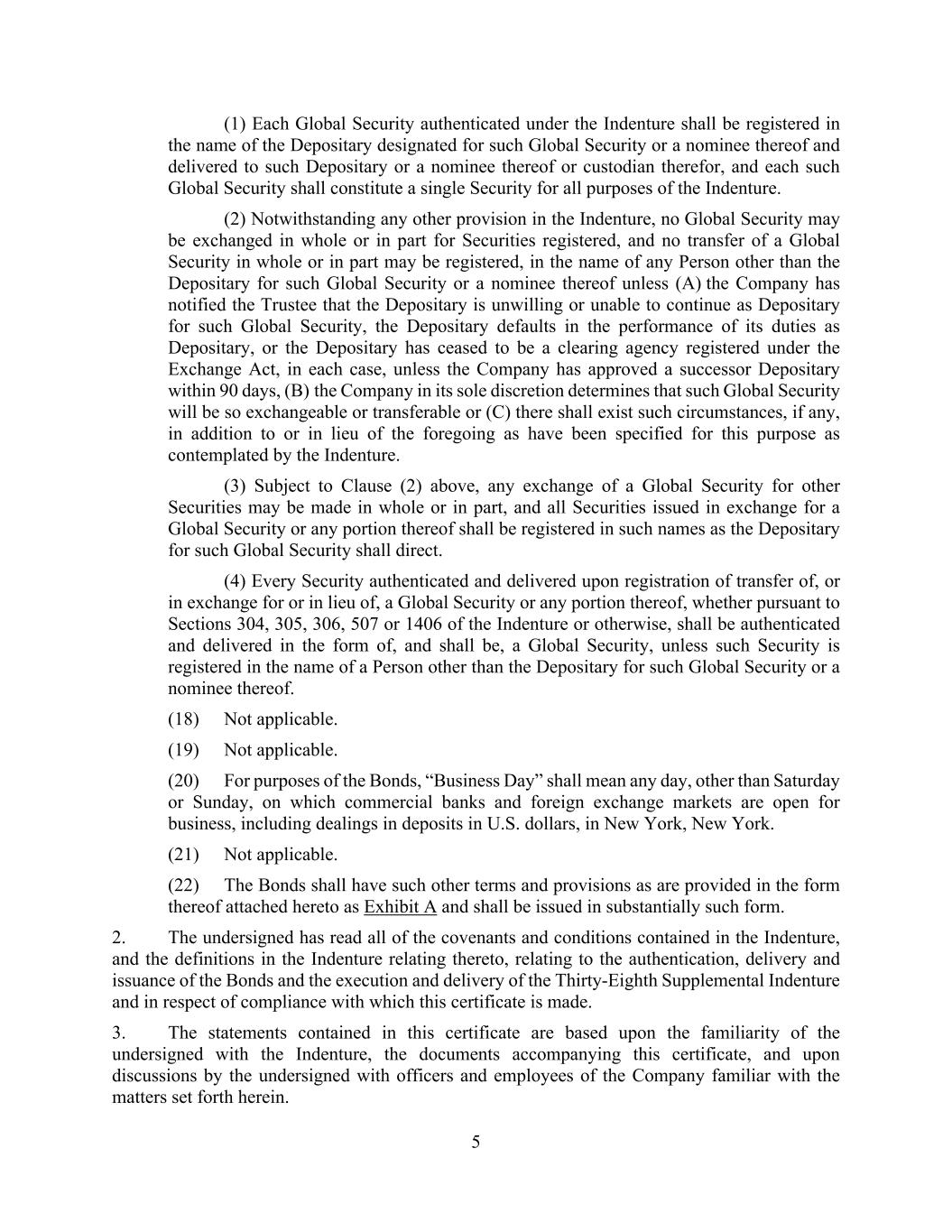 5 (1) Each Global Security authenticated under the Indenture shall be registered in the name of the Depositary designated for such Global Security or a nominee thereof and delivered to such Depositary or a nominee thereof or custodian therefor, and each such Global Security shall constitute a single Security for all purposes of the Indenture. (2) Notwithstanding any other provision in the Indenture, no Global Security may be exchanged in whole or in part for Securities registered, and no transfer of a Global Security in whole or in part may be registered, in the name of any Person other than the Depositary for such Global Security or a nominee thereof unless (A) the Company has notified the Trustee that the Depositary is unwilling or unable to continue as Depositary for such Global Security, the Depositary defaults in the performance of its duties as Depositary, or the Depositary has ceased to be a clearing agency registered under the Exchange Act, in each case, unless the Company has approved a successor Depositary within 90 days, (B) the Company in its sole discretion determines that such Global Security will be so exchangeable or transferable or (C) there shall exist such circumstances, if any, in addition to or in lieu of the foregoing as have been specified for this purpose as contemplated by the Indenture. (3) Subject to Clause (2) above, any exchange of a Global Security for other Securities may be made in whole or in part, and all Securities issued in exchange for a Global Security or any portion thereof shall be registered in such names as the Depositary for such Global Security shall direct. (4) Every Security authenticated and delivered upon registration of transfer of, or in exchange for or in lieu of, a Global Security or any portion thereof, whether pursuant to Sections 304, 305, 306, 507 or 1406 of the Indenture or otherwise, shall be authenticated and delivered in the form of, and shall be, a Global Security, unless such Security is registered in the name of a Person other than the Depositary for such Global Security or a nominee thereof. (18) Not applicable. (19) Not applicable. (20) For purposes of the Bonds, “Business Day” shall mean any day, other than Saturday or Sunday, on which commercial banks and foreign exchange markets are open for business, including dealings in deposits in U.S. dollars, in New York, New York. (21) Not applicable. (22) The Bonds shall have such other terms and provisions as are provided in the form thereof attached hereto as Exhibit A and shall be issued in substantially such form. 2. The undersigned has read all of the covenants and conditions contained in the Indenture, and the definitions in the Indenture relating thereto, relating to the authentication, delivery and issuance of the Bonds and the execution and delivery of the Thirty-Eighth Supplemental Indenture and in respect of compliance with which this certificate is made. 3. The statements contained in this certificate are based upon the familiarity of the undersigned with the Indenture, the documents accompanying this certificate, and upon discussions by the undersigned with officers and employees of the Company familiar with the matters set forth herein.