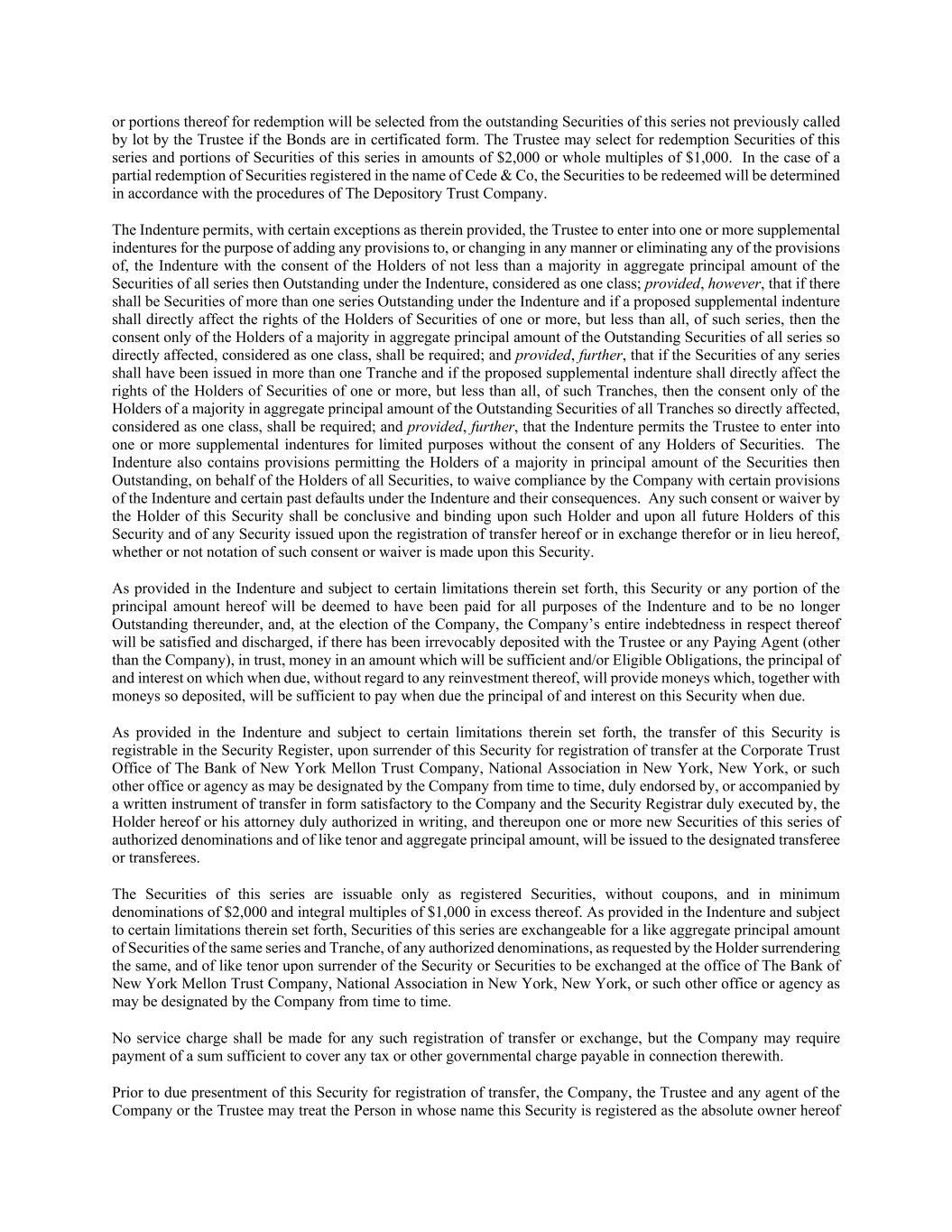 or portions thereof for redemption will be selected from the outstanding Securities of this series not previously called by lot by the Trustee if the Bonds are in certificated form. The Trustee may select for redemption Securities of this series and portions of Securities of this series in amounts of $2,000 or whole multiples of $1,000. In the case of a partial redemption of Securities registered in the name of Cede & Co, the Securities to be redeemed will be determined in accordance with the procedures of The Depository Trust Company. The Indenture permits, with certain exceptions as therein provided, the Trustee to enter into one or more supplemental indentures for the purpose of adding any provisions to, or changing in any manner or eliminating any of the provisions of, the Indenture with the consent of the Holders of not less than a majority in aggregate principal amount of the Securities of all series then Outstanding under the Indenture, considered as one class; provided, however, that if there shall be Securities of more than one series Outstanding under the Indenture and if a proposed supplemental indenture shall directly affect the rights of the Holders of Securities of one or more, but less than all, of such series, then the consent only of the Holders of a majority in aggregate principal amount of the Outstanding Securities of all series so directly affected, considered as one class, shall be required; and provided, further, that if the Securities of any series shall have been issued in more than one Tranche and if the proposed supplemental indenture shall directly affect the rights of the Holders of Securities of one or more, but less than all, of such Tranches, then the consent only of the Holders of a majority in aggregate principal amount of the Outstanding Securities of all Tranches so directly affected, considered as one class, shall be required; and provided, further, that the Indenture permits the Trustee to enter into one or more supplemental indentures for limited purposes without the consent of any Holders of Securities. The Indenture also contains provisions permitting the Holders of a majority in principal amount of the Securities then Outstanding, on behalf of the Holders of all Securities, to waive compliance by the Company with certain provisions of the Indenture and certain past defaults under the Indenture and their consequences. Any such consent or waiver by the Holder of this Security shall be conclusive and binding upon such Holder and upon all future Holders of this Security and of any Security issued upon the registration of transfer hereof or in exchange therefor or in lieu hereof, whether or not notation of such consent or waiver is made upon this Security. As provided in the Indenture and subject to certain limitations therein set forth, this Security or any portion of the principal amount hereof will be deemed to have been paid for all purposes of the Indenture and to be no longer Outstanding thereunder, and, at the election of the Company, the Company’s entire indebtedness in respect thereof will be satisfied and discharged, if there has been irrevocably deposited with the Trustee or any Paying Agent (other than the Company), in trust, money in an amount which will be sufficient and/or Eligible Obligations, the principal of and interest on which when due, without regard to any reinvestment thereof, will provide moneys which, together with moneys so deposited, will be sufficient to pay when due the principal of and interest on this Security when due. As provided in the Indenture and subject to certain limitations therein set forth, the transfer of this Security is registrable in the Security Register, upon surrender of this Security for registration of transfer at the Corporate Trust Office of The Bank of New York Mellon Trust Company, National Association in New York, New York, or such other office or agency as may be designated by the Company from time to time, duly endorsed by, or accompanied by a written instrument of transfer in form satisfactory to the Company and the Security Registrar duly executed by, the Holder hereof or his attorney duly authorized in writing, and thereupon one or more new Securities of this series of authorized denominations and of like tenor and aggregate principal amount, will be issued to the designated transferee or transferees. The Securities of this series are issuable only as registered Securities, without coupons, and in minimum denominations of $2,000 and integral multiples of $1,000 in excess thereof. As provided in the Indenture and subject to certain limitations therein set forth, Securities of this series are exchangeable for a like aggregate principal amount of Securities of the same series and Tranche, of any authorized denominations, as requested by the Holder surrendering the same, and of like tenor upon surrender of the Security or Securities to be exchanged at the office of The Bank of New York Mellon Trust Company, National Association in New York, New York, or such other office or agency as may be designated by the Company from time to time. No service charge shall be made for any such registration of transfer or exchange, but the Company may require payment of a sum sufficient to cover any tax or other governmental charge payable in connection therewith. Prior to due presentment of this Security for registration of transfer, the Company, the Trustee and any agent of the Company or the Trustee may treat the Person in whose name this Security is registered as the absolute owner hereof
