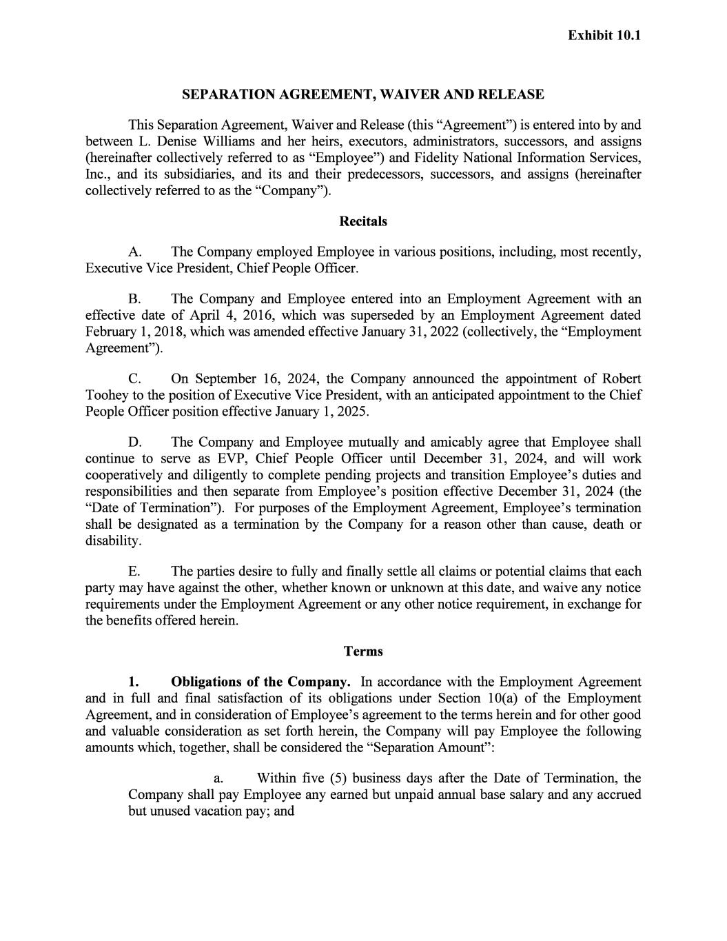 SEPARATION AGREEMENT, WAIVER AND RELEASE This Separation Agreement, Waiver and Release (this "Agreement") is entered into by and between L. Denise Williams and her heirs, executors, administrators, successors, and assigns (hereinafter collectively referred to as "Employee") and Fidelity National Information Services, Inc., and its subsidiaries, and its and their predecessors, successors, and assigns (hereinafter collectively referred to as the "Company"). Recitals A. The Company employed Employee in various positions, including, most recently, Executive Vice President, Chief People Officer. B. The Company and Employee entered into an Employment Agreement with an effective date of April 4, 2016, which was superseded by an Employment Agreement dated February 1, 2018, which was amended effective January 31, 2022 (collectively, the "Employment Agreement"). C. On September 16, 2024, the Company announced the appointment of Robert Toohey to the position of Executive Vice President, with an anticipated appointment to the Chief People Officer position effective January 1, 2025. D. The Company and Employee mutually and amicably agree that Employee shall continue to serve as EVP, Chief People Officer until December 31, 2024, and will work cooperatively and diligently to complete pending projects and transition Employee's duties and responsibilities and then separate from Employee's position effective December 31, 2024 (the "Date of Termination"). For purposes of the Employment Agreement, Employee's termination shall be designated as a termination by the Company for a reason other than cause, death or disability. E. The parties desire to fully and finally settle all claims or potential claims that each party may have against the other, whether known or unknown at this date, and waive any notice requirements under the Employment Agreement or any other notice requirement, in exchange for the benefits offered herein. Terms 1. Obligations of the Company. In accordance with the Employment Agreement and in full and final satisfaction of its obligations under Section l0(a) of the Employment Agreement, and in consideration of Employee's agreement to the terms herein and for other good and valuable consideration as set forth herein, the Company will pay Employee the following amounts which, together, shall be considered the "Separation Amount": a. Within five (5) business days after the Date of Termination, the Company shall pay Employee any earned but unpaid annual base salary and any accrued but unused vacation pay; and Exhibit 10.1